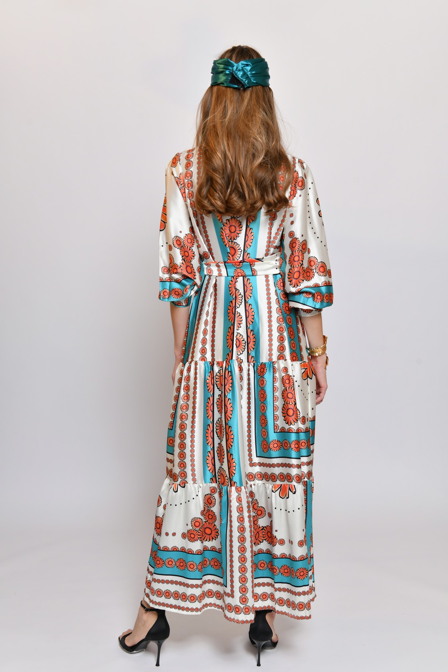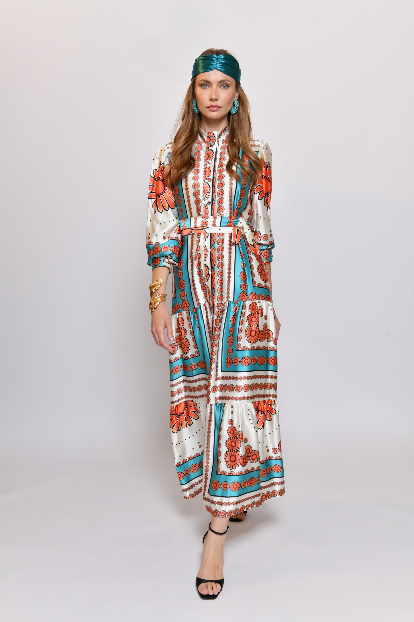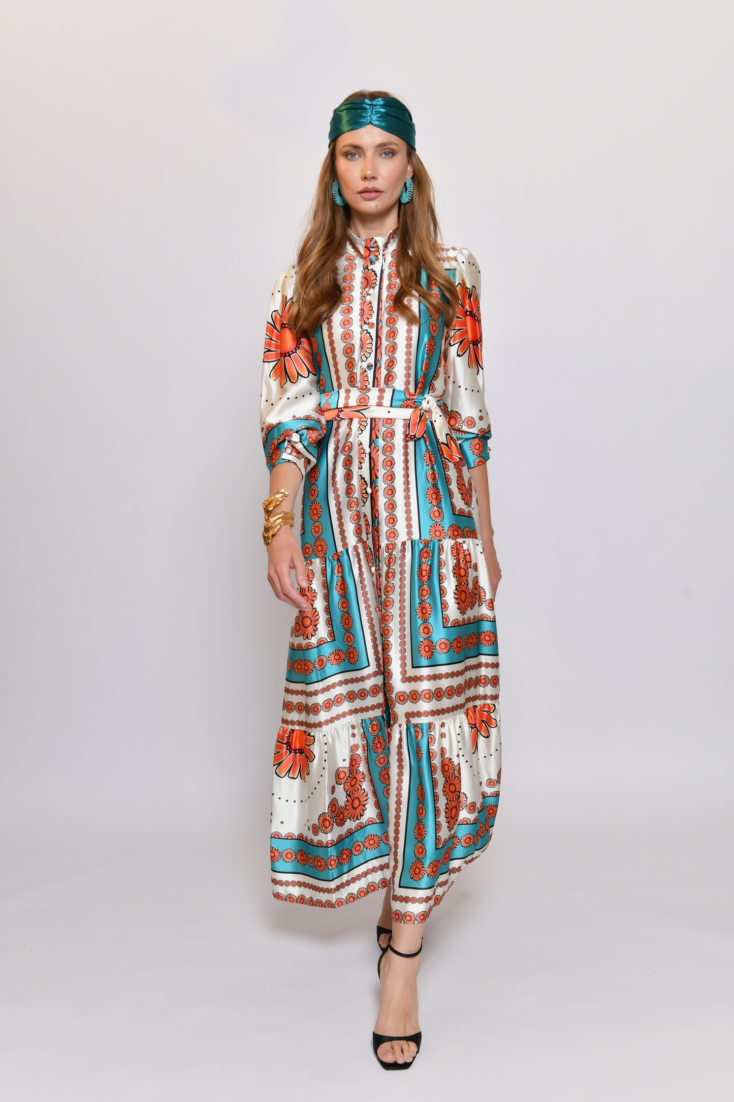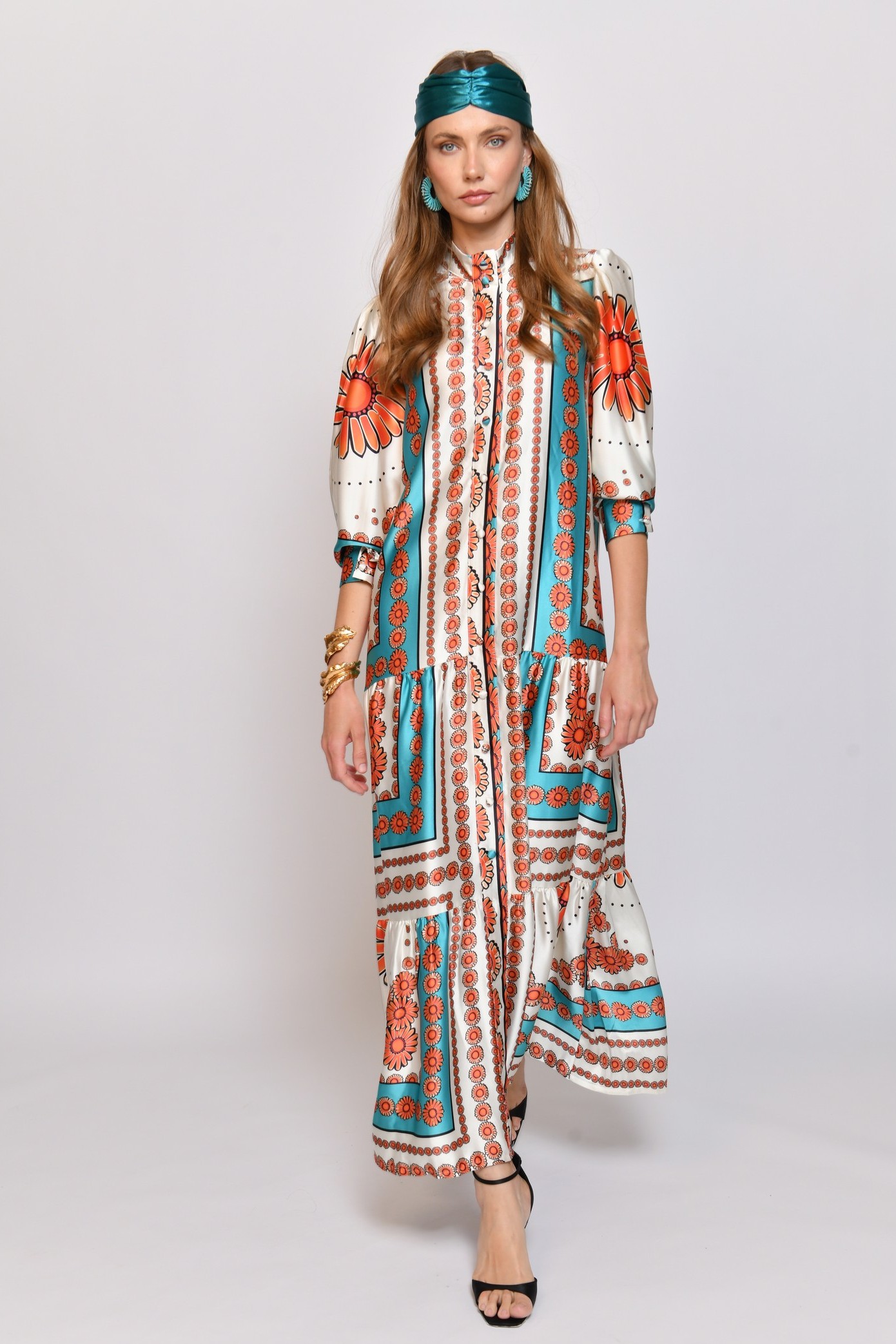 לשמלה צווארון סיני וכפתורים לכל אורכה, חלקה התחתון מאופיין ב 2 קומות רחבות ועדינות.