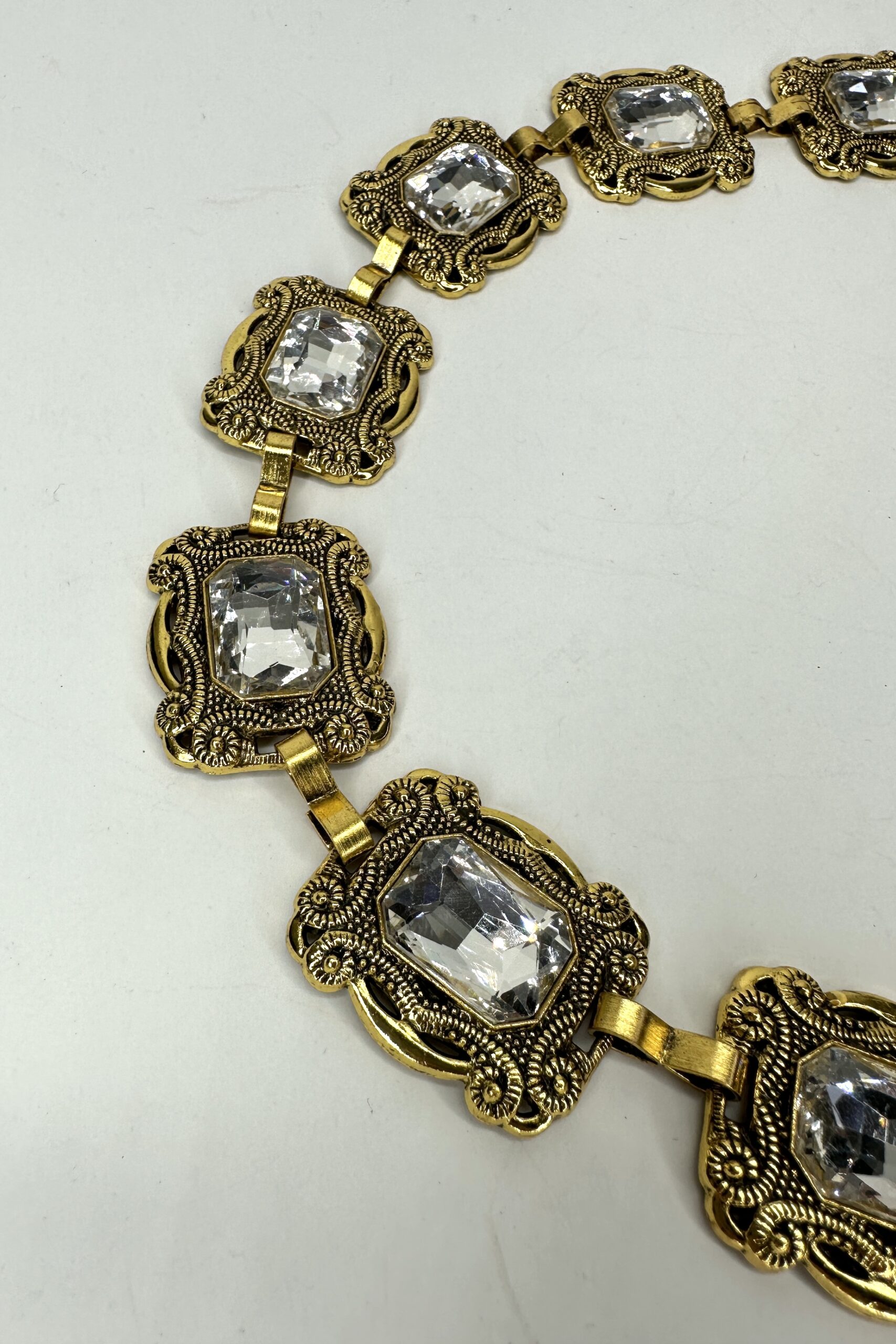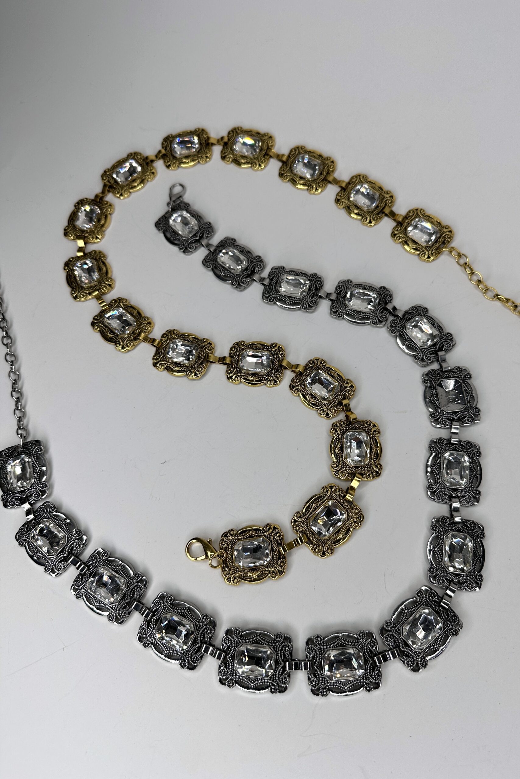 השרשרת עשויה אלמנטים מעוטרים מוזהבים/כסופים בשילוב אבן מרכזית.