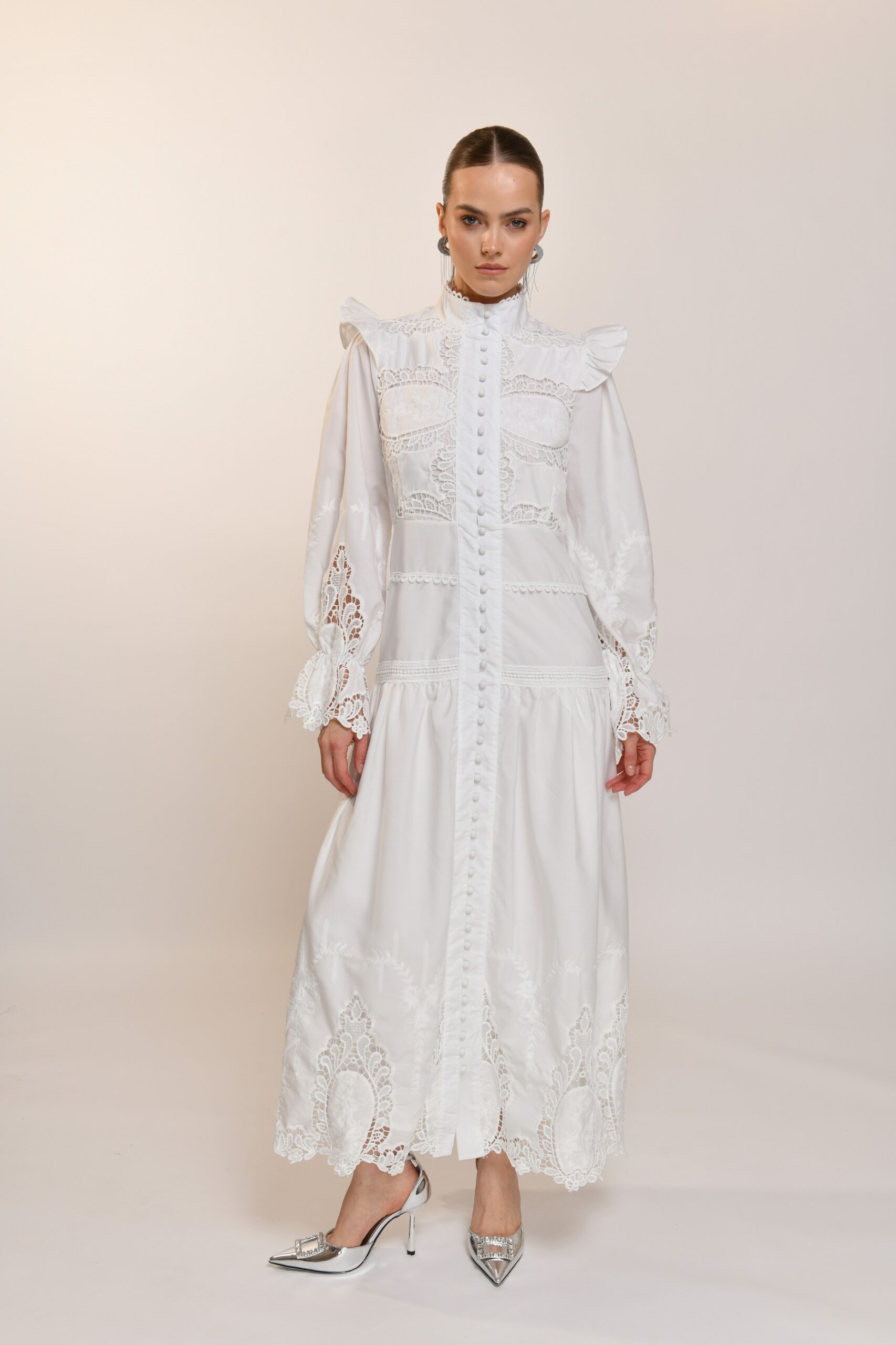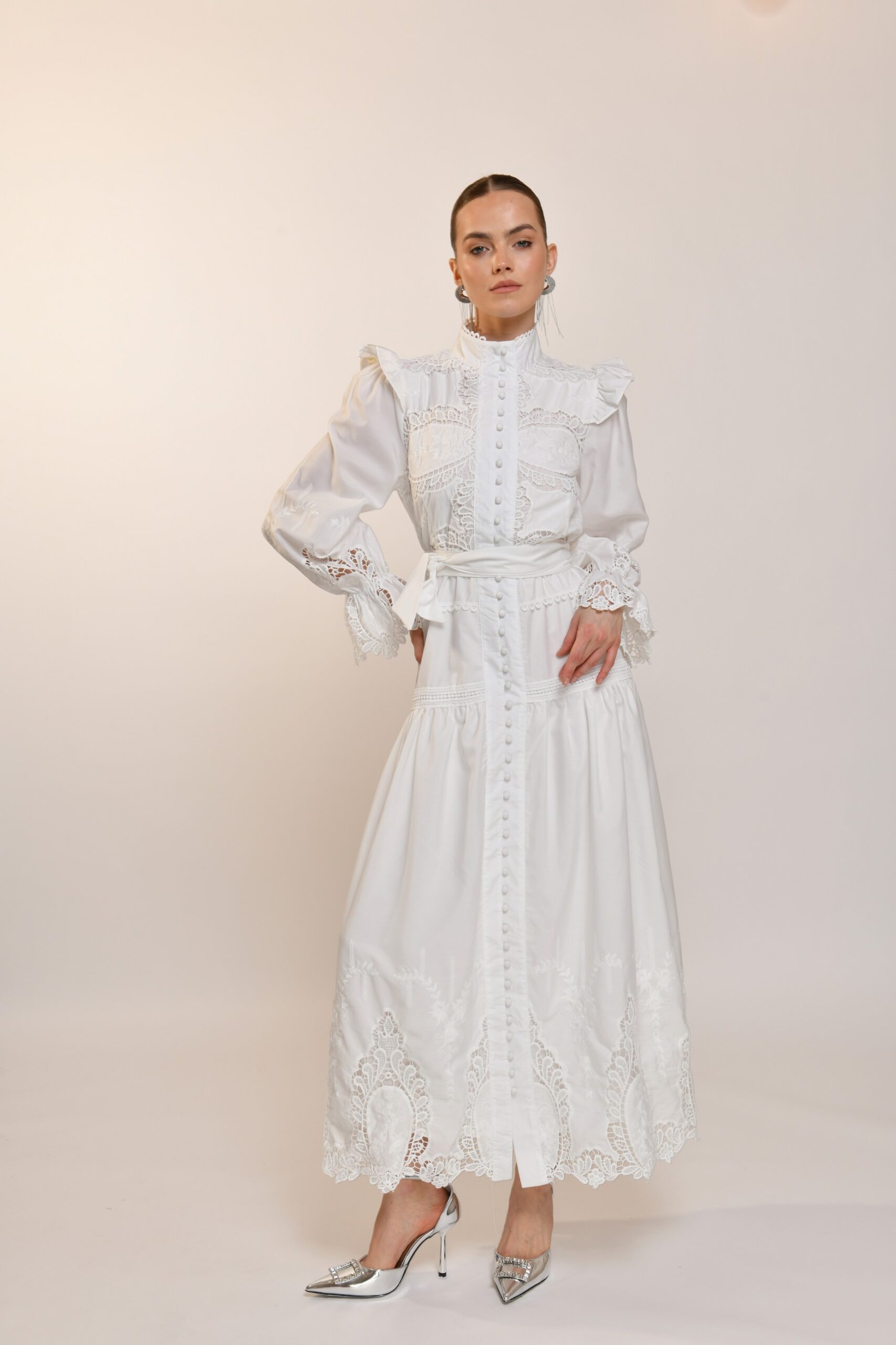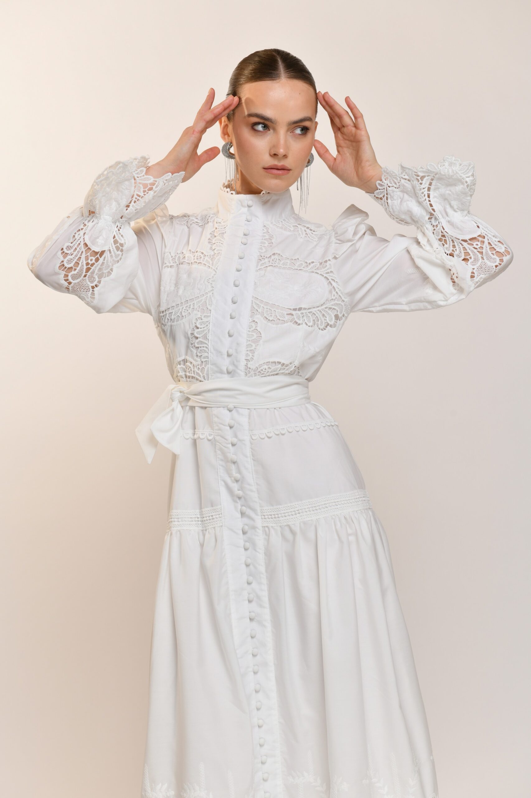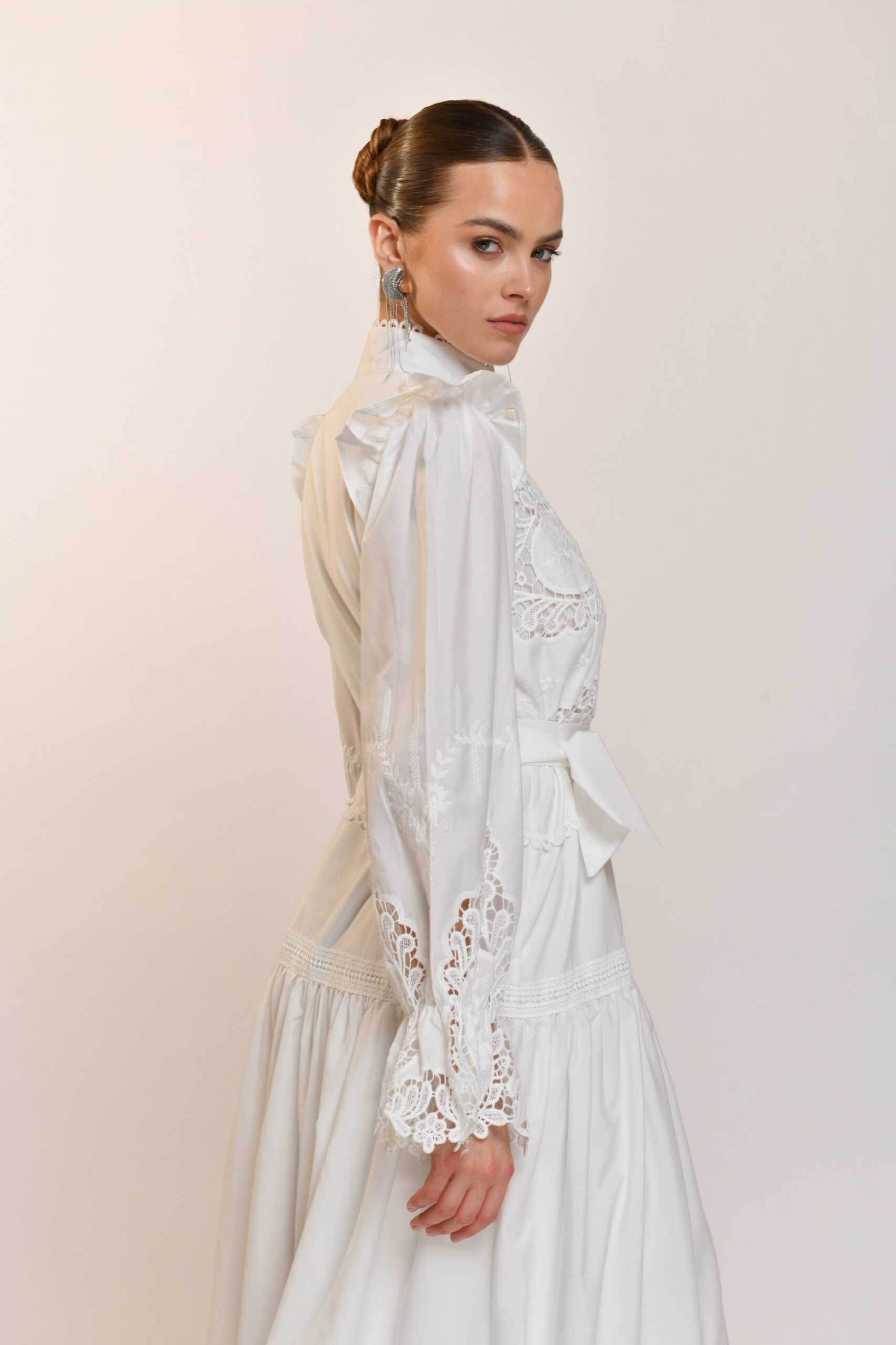 עשויה מבד פרקל, בשילוב רקמה עדינה וייחודית עם תחרות המשולבות לאורך כל השמלה.