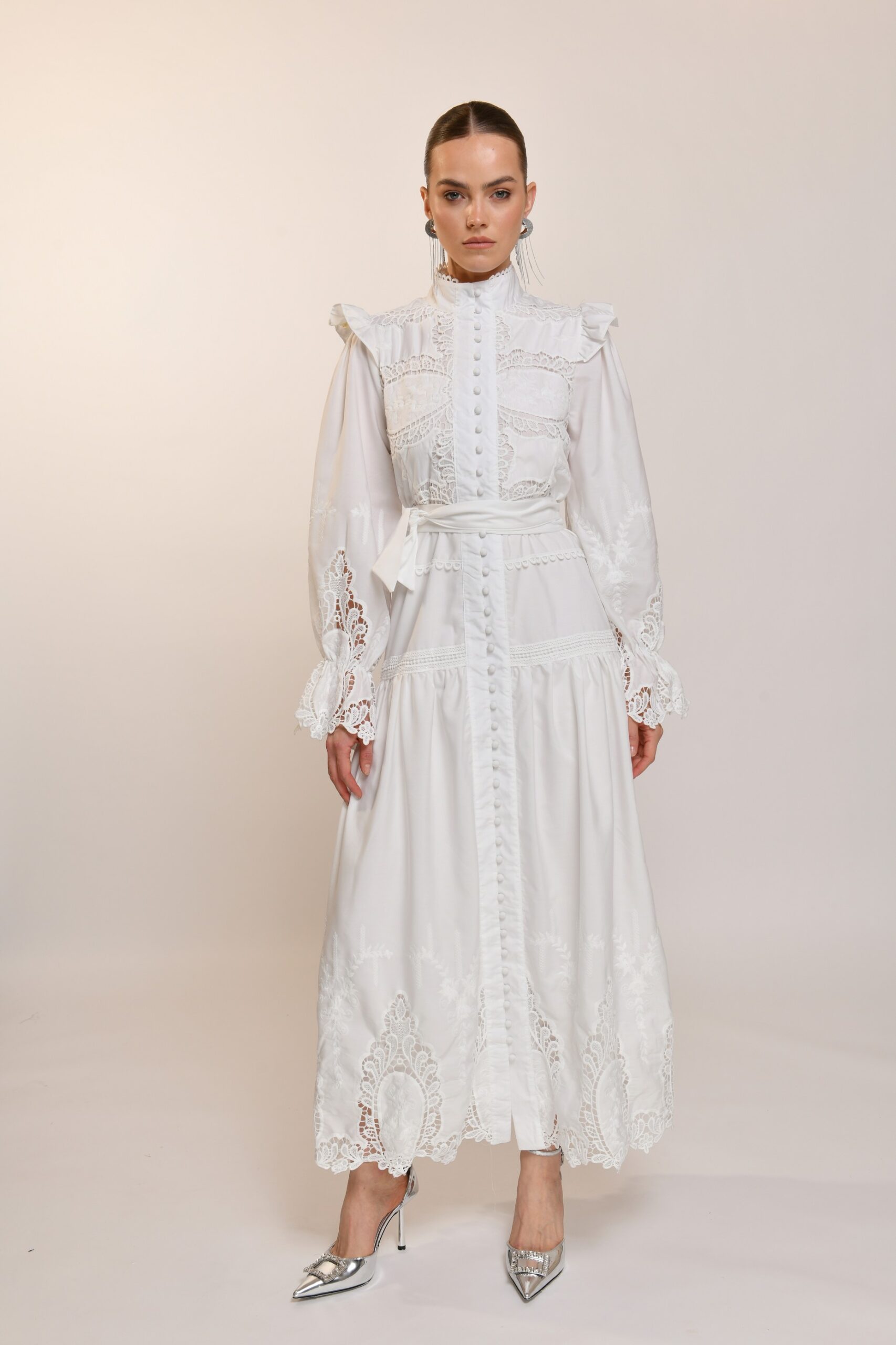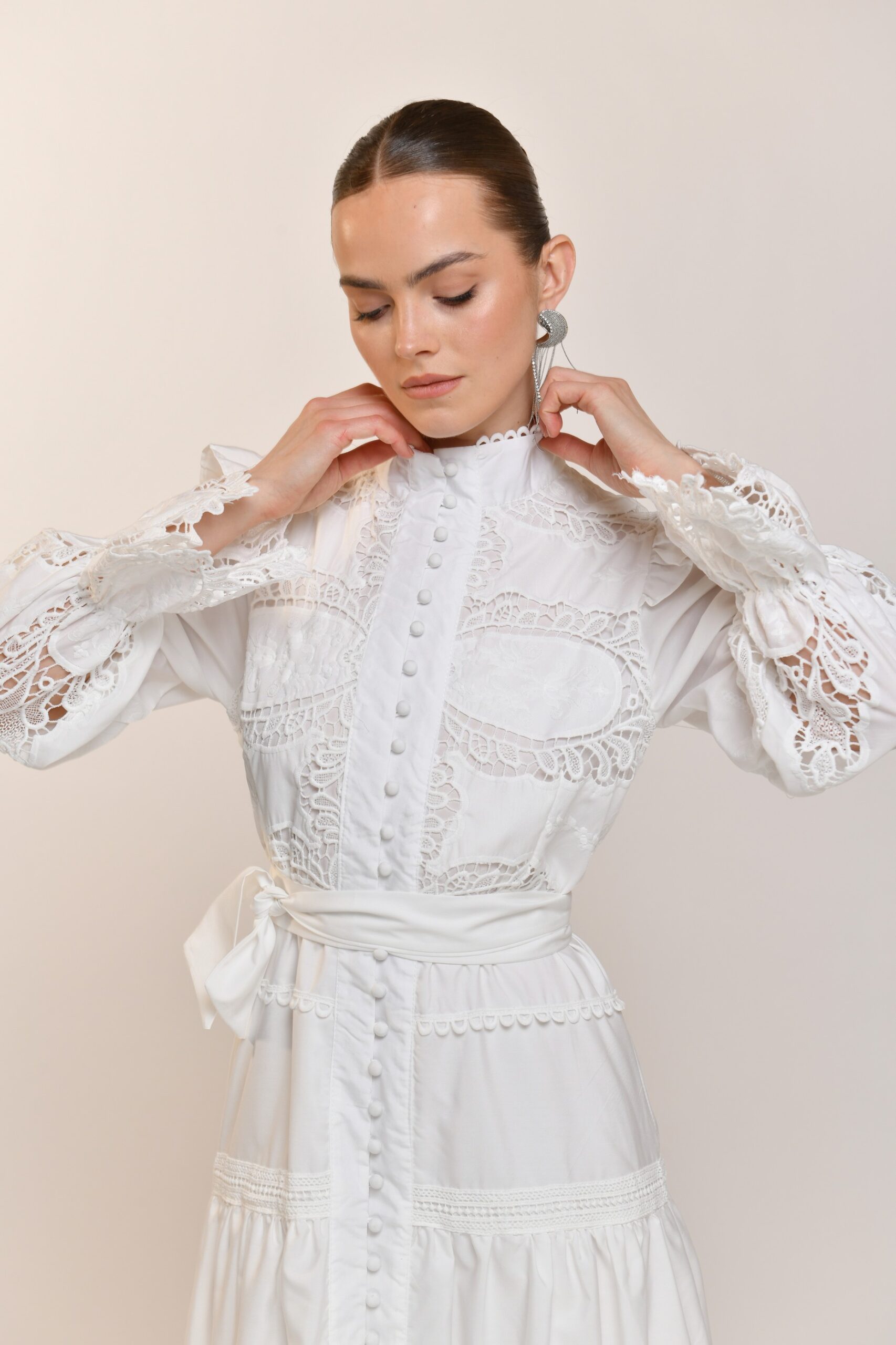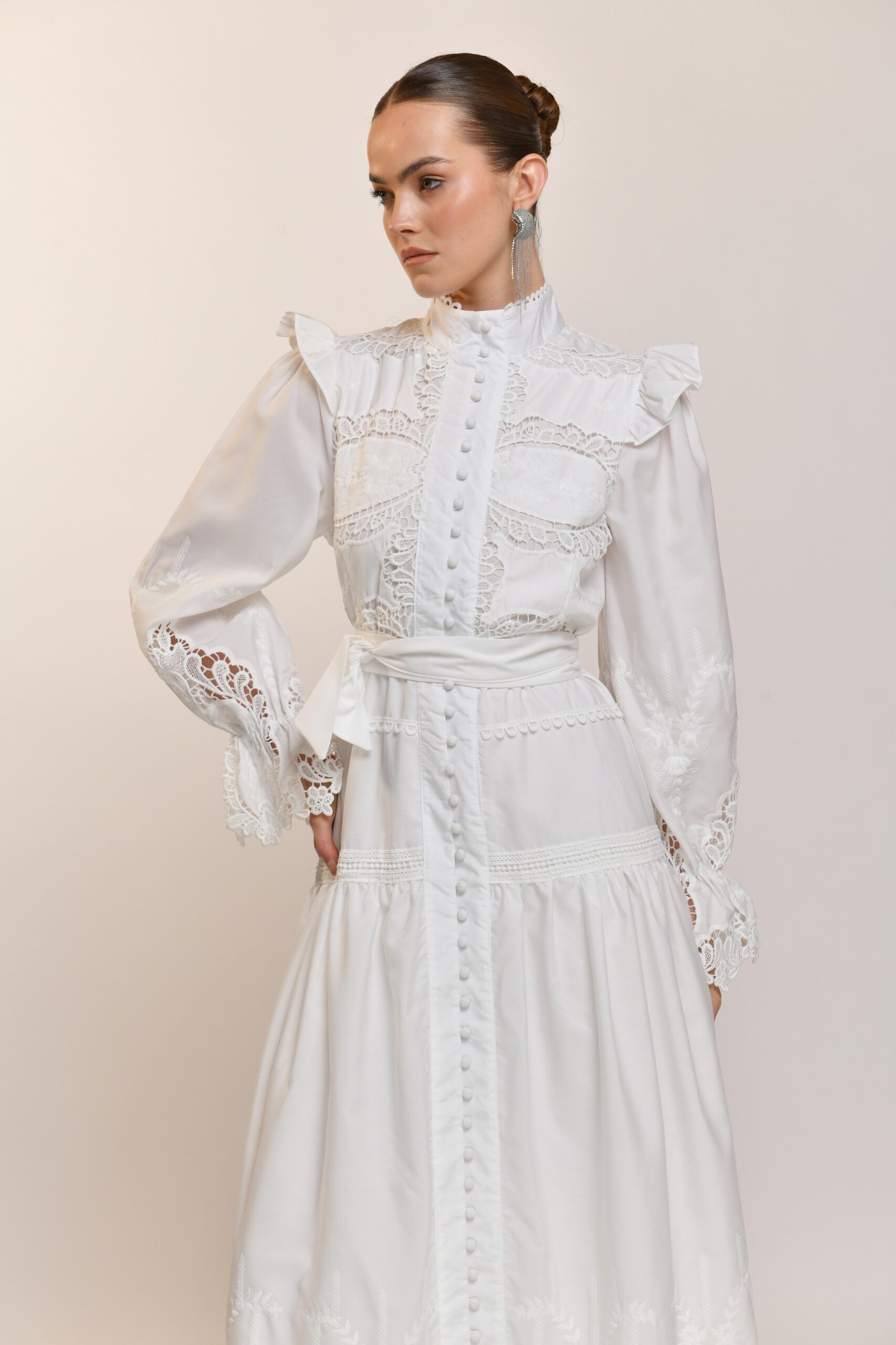 עשויה מבד פרקל, בשילוב רקמה עדינה וייחודית עם תחרות המשולבות לאורך כל השמלה.