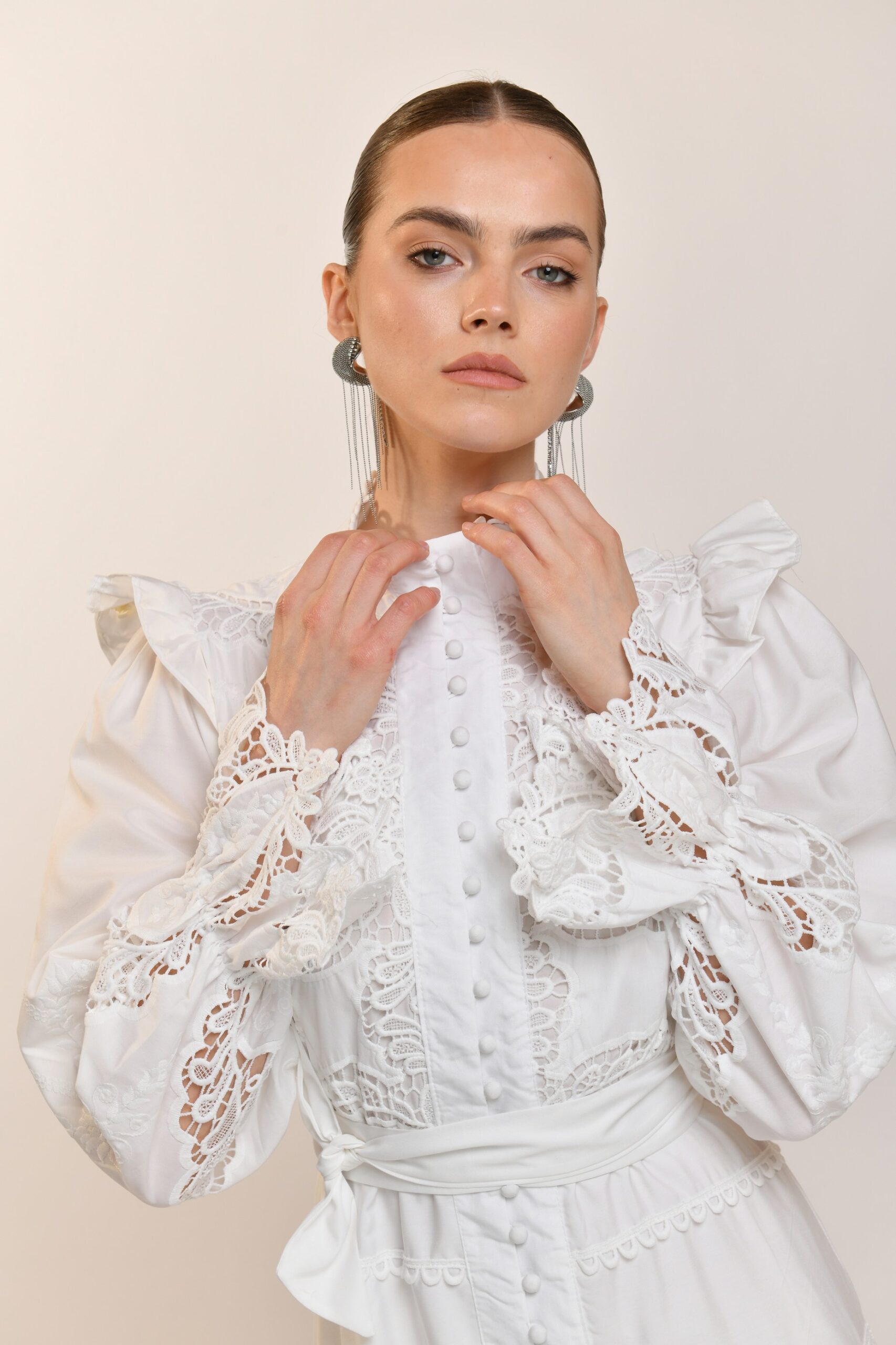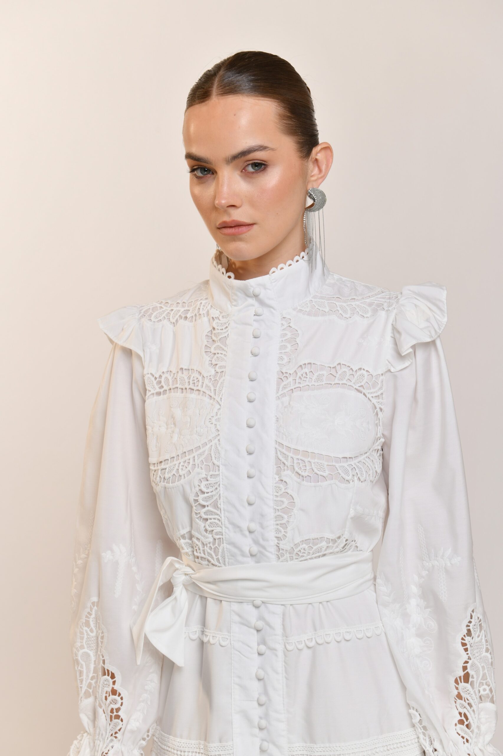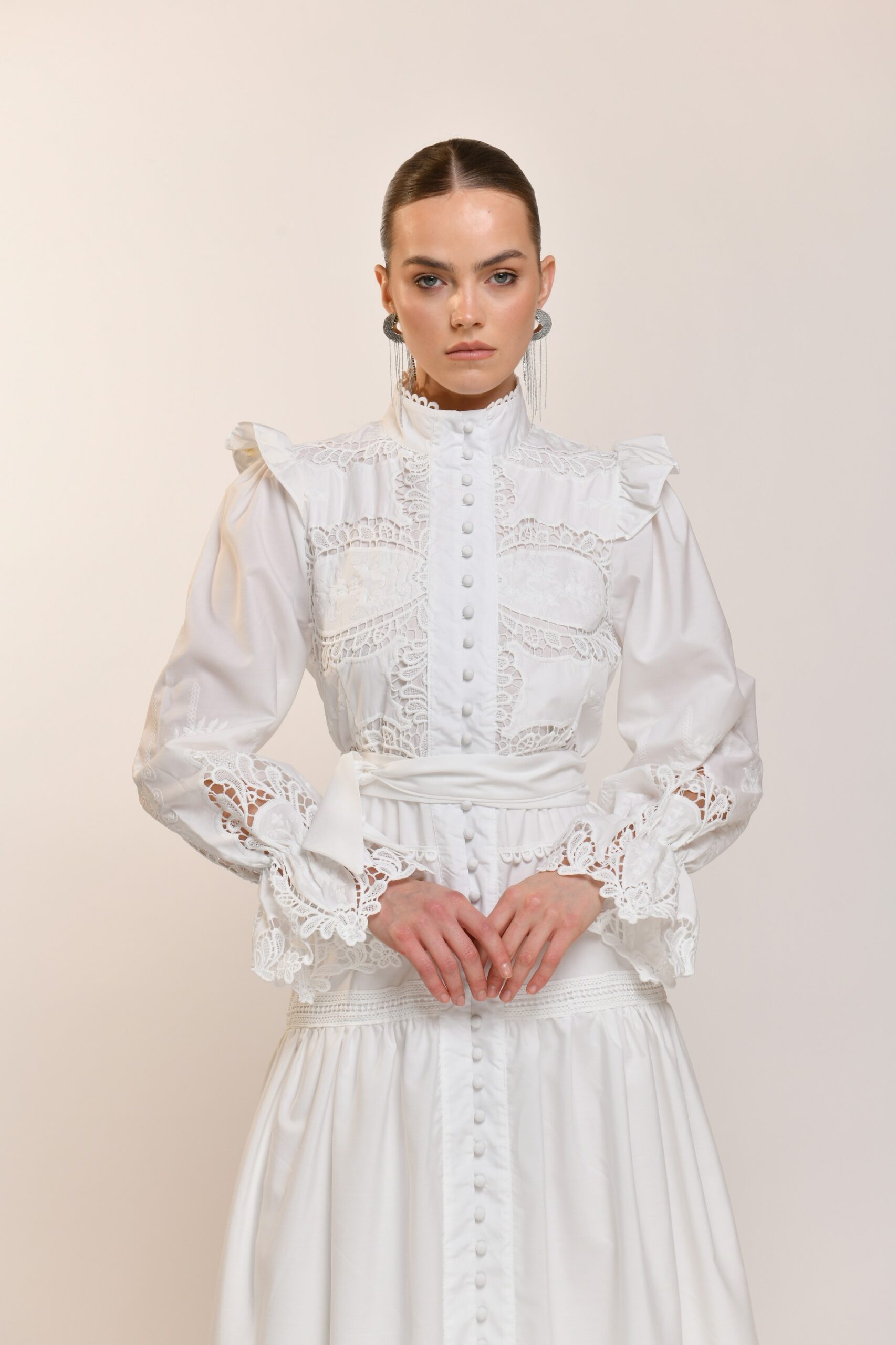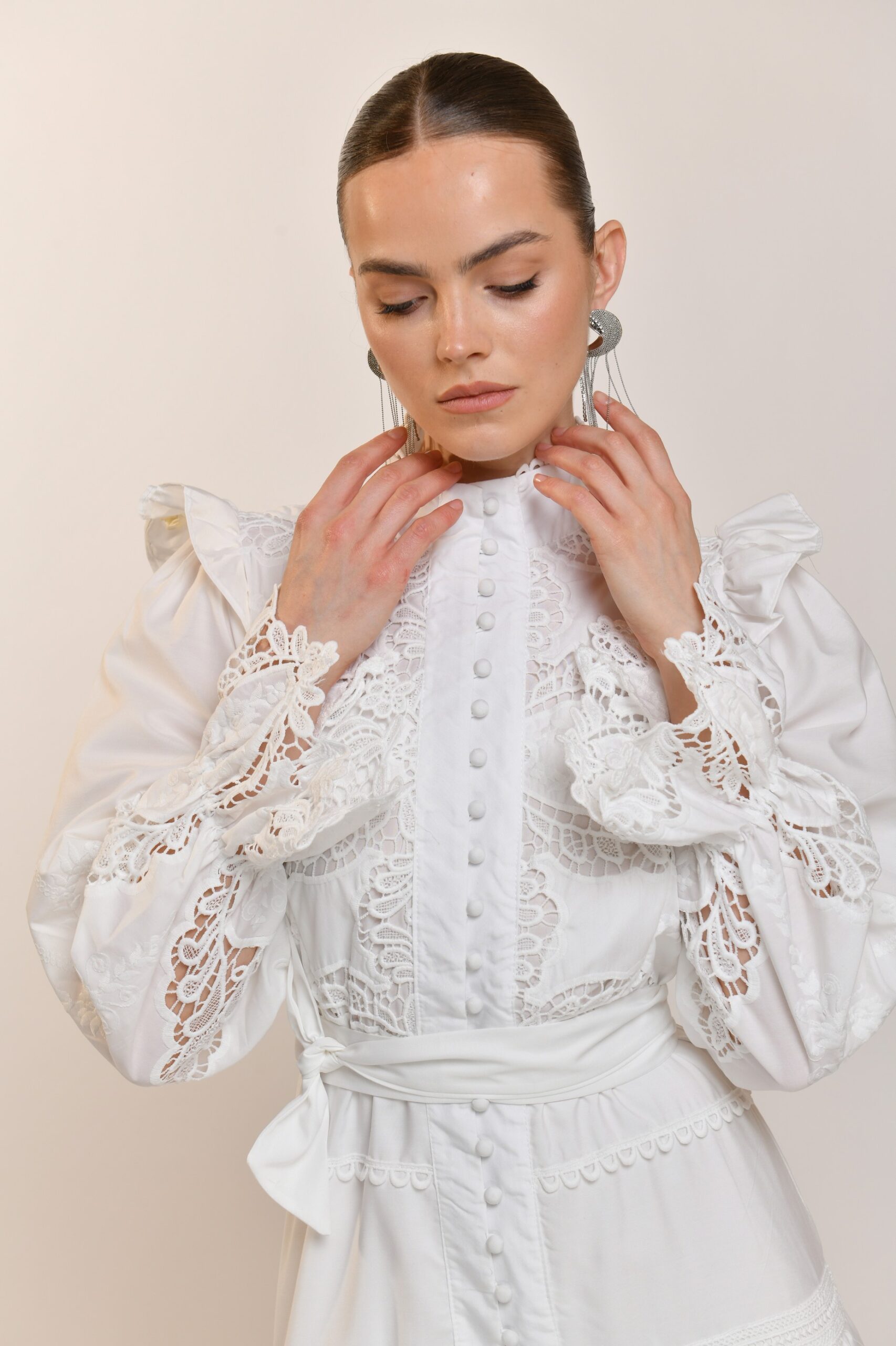 עשויה מבד פרקל, בשילוב רקמה עדינה וייחודית עם תחרות המשולבות לאורך כל השמלה.
