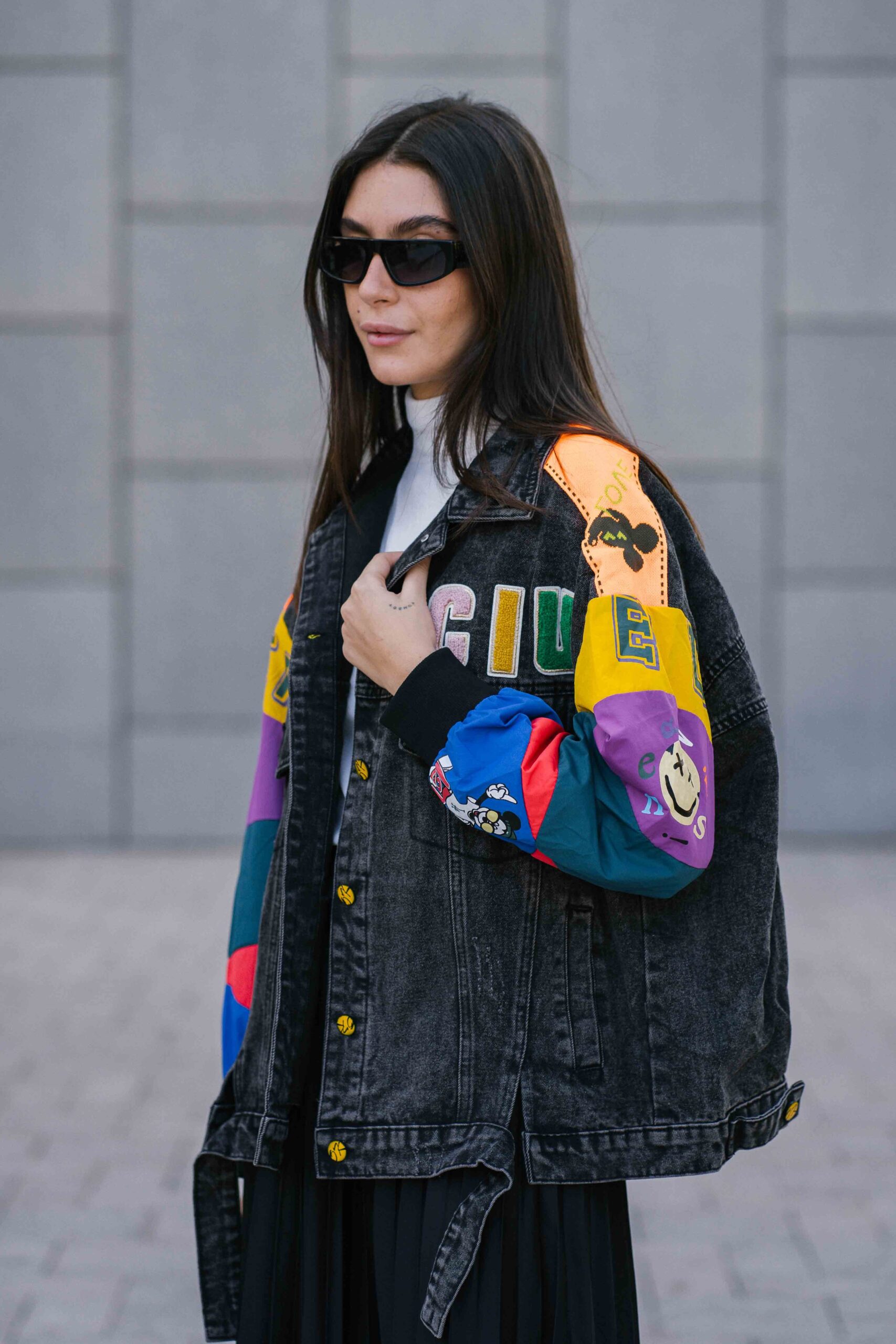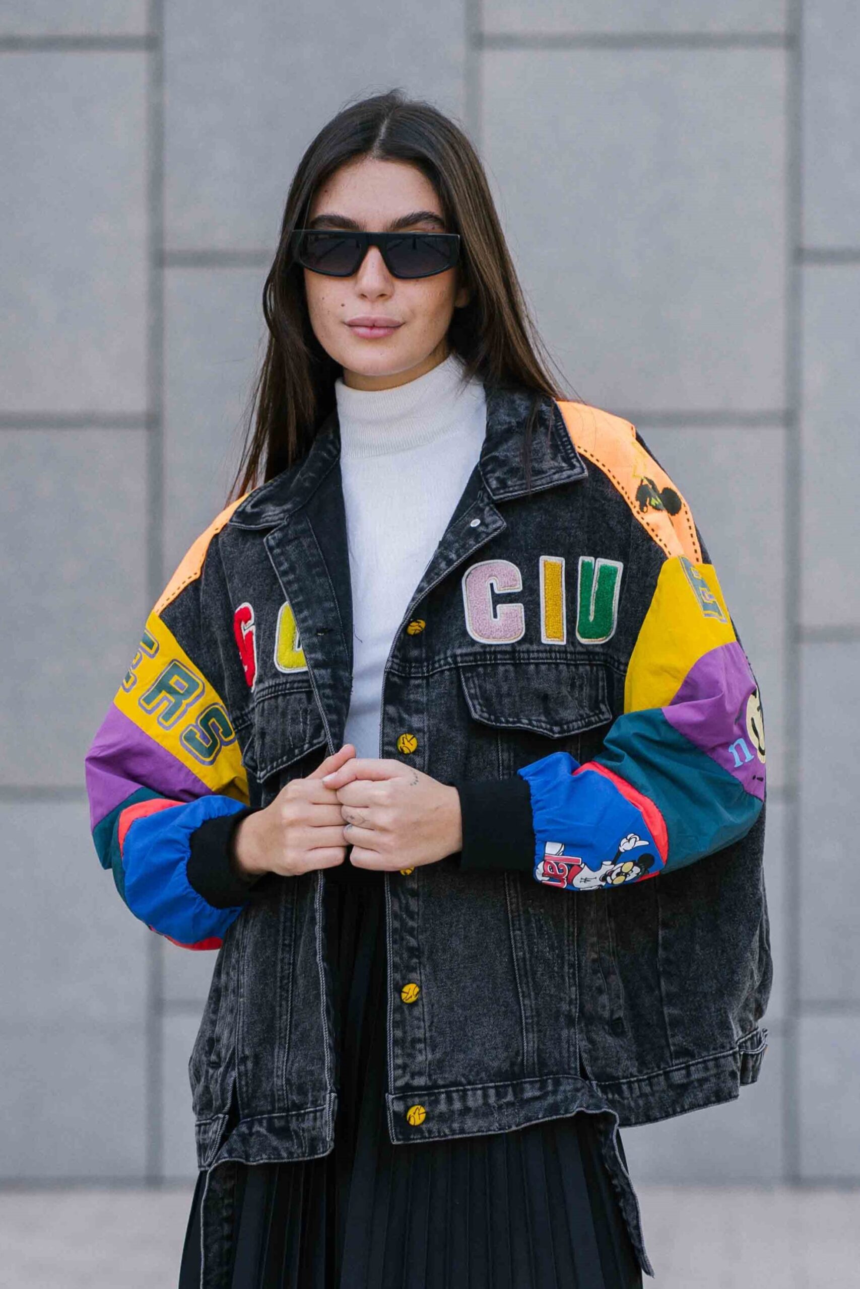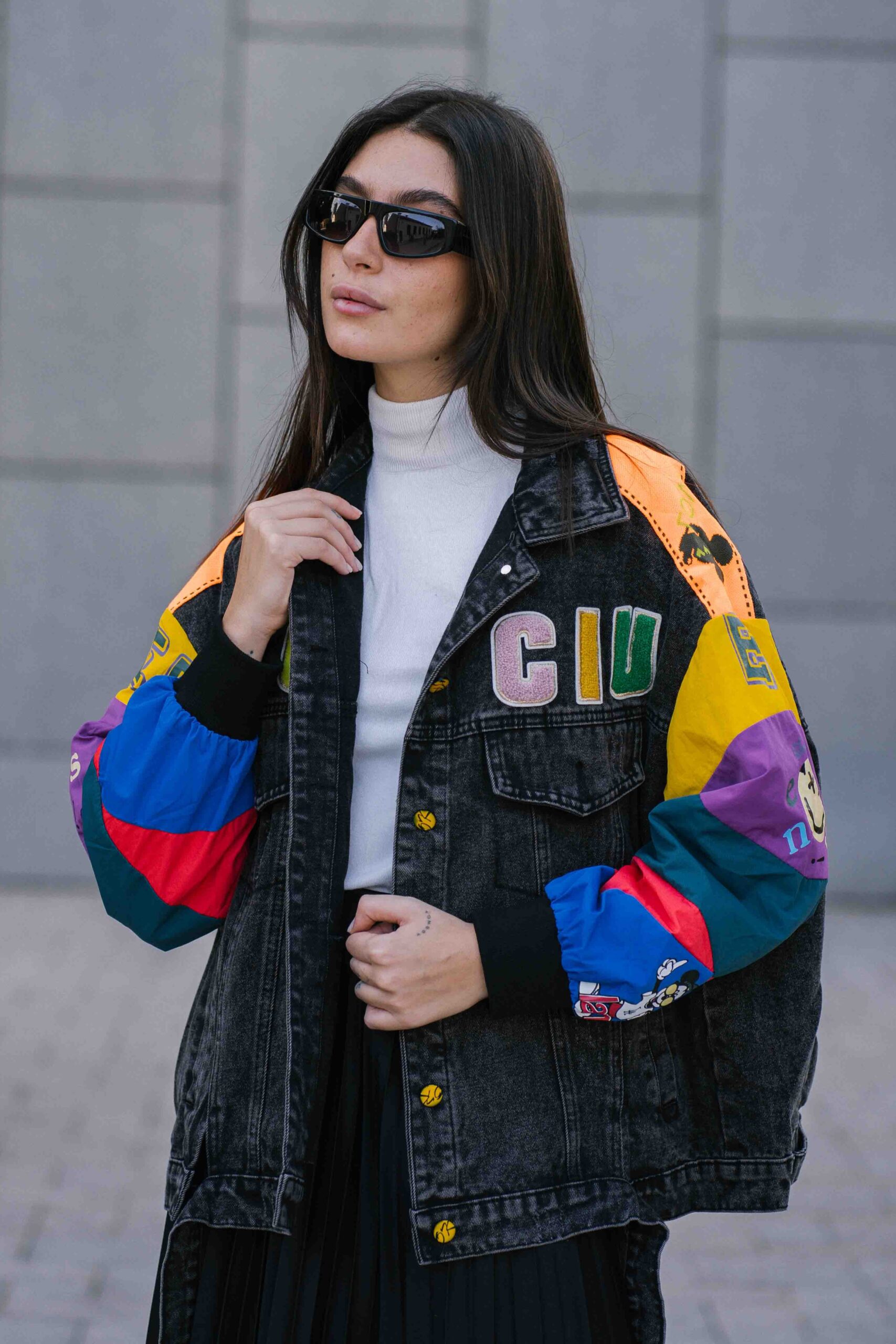 שרוולי הג’קט עשויים מבד המזכיר מעט מעיל רוח צבעוני בשילוב הדפסים צבעוניים.