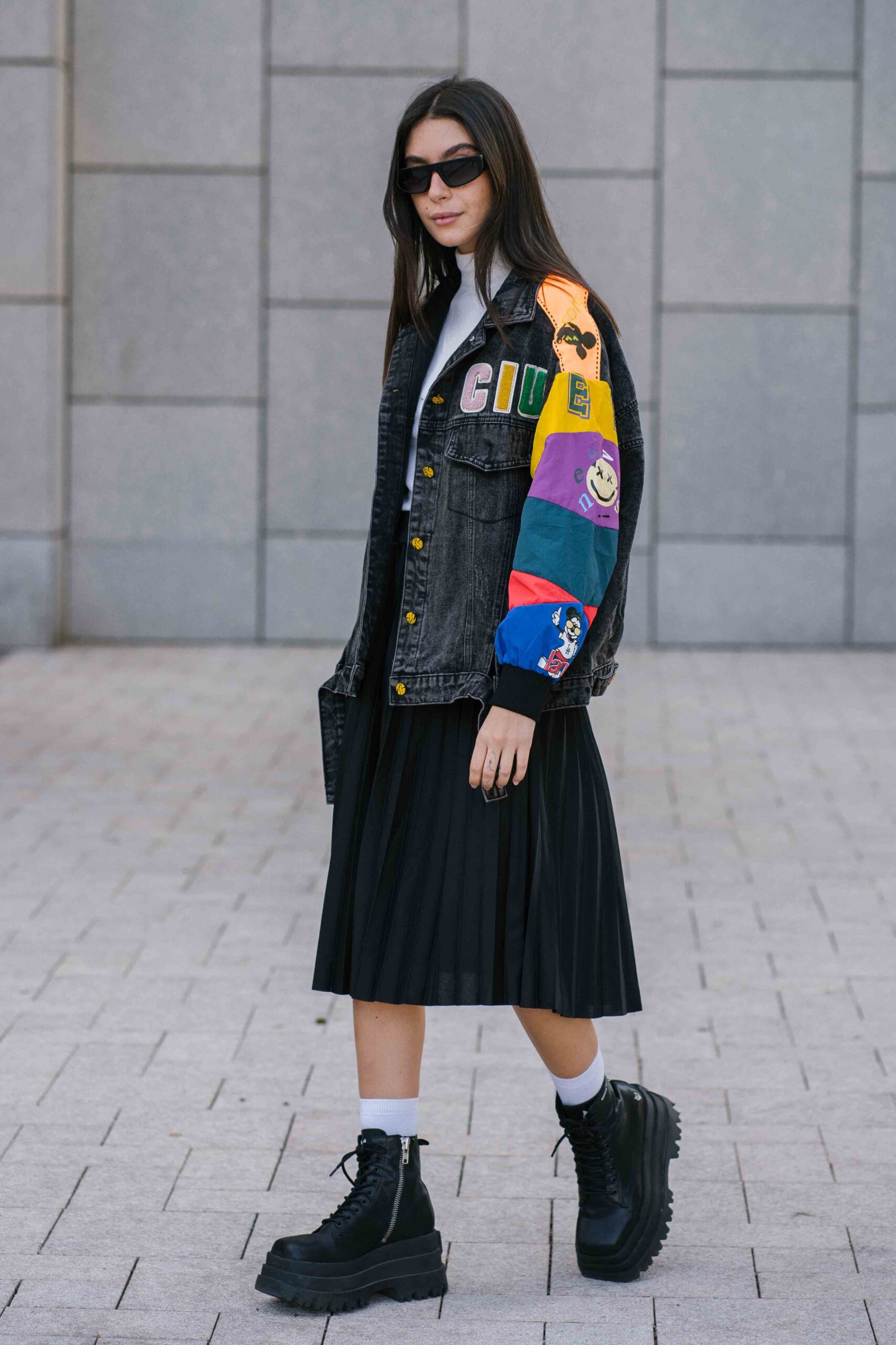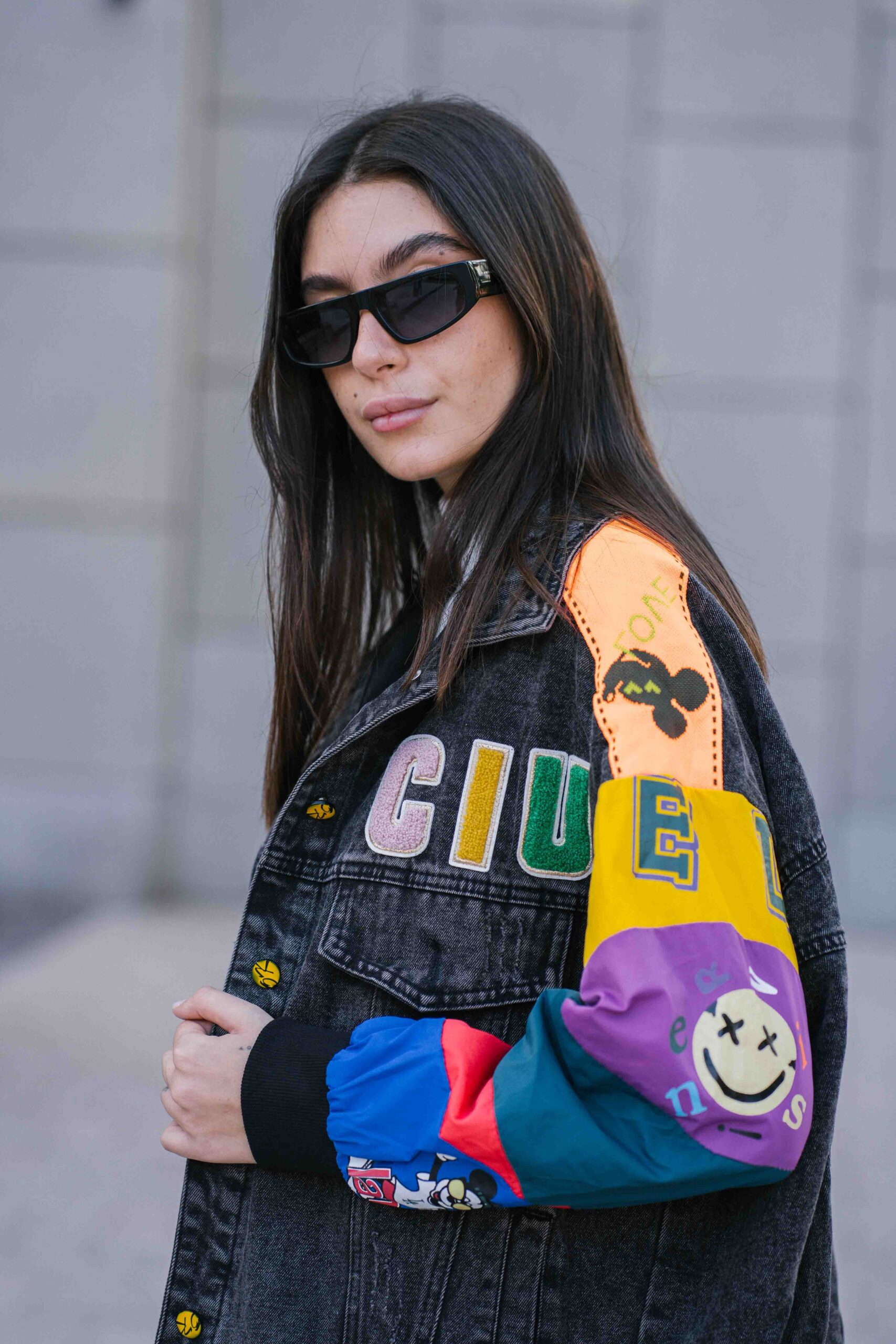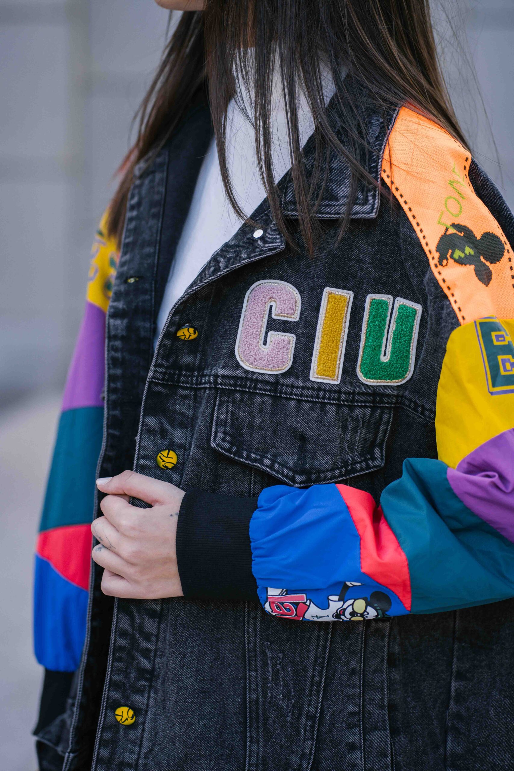שרוולי הג’קט עשויים מבד המזכיר מעט מעיל רוח צבעוני בשילוב הדפסים צבעוניים.