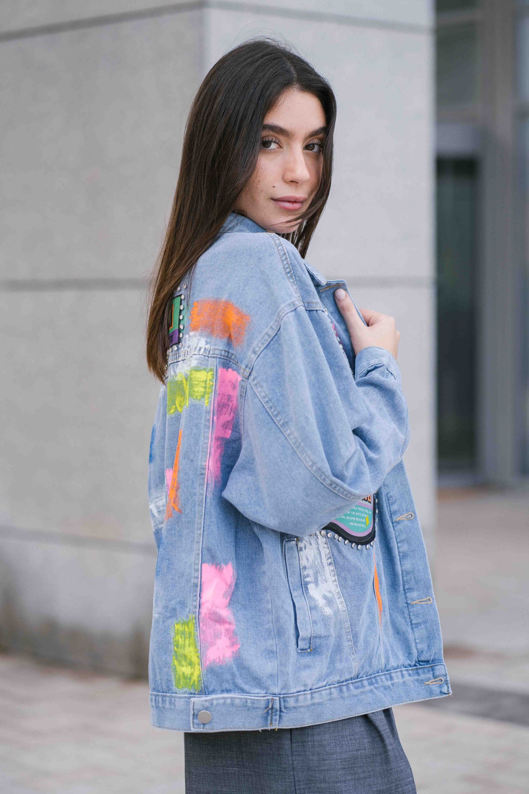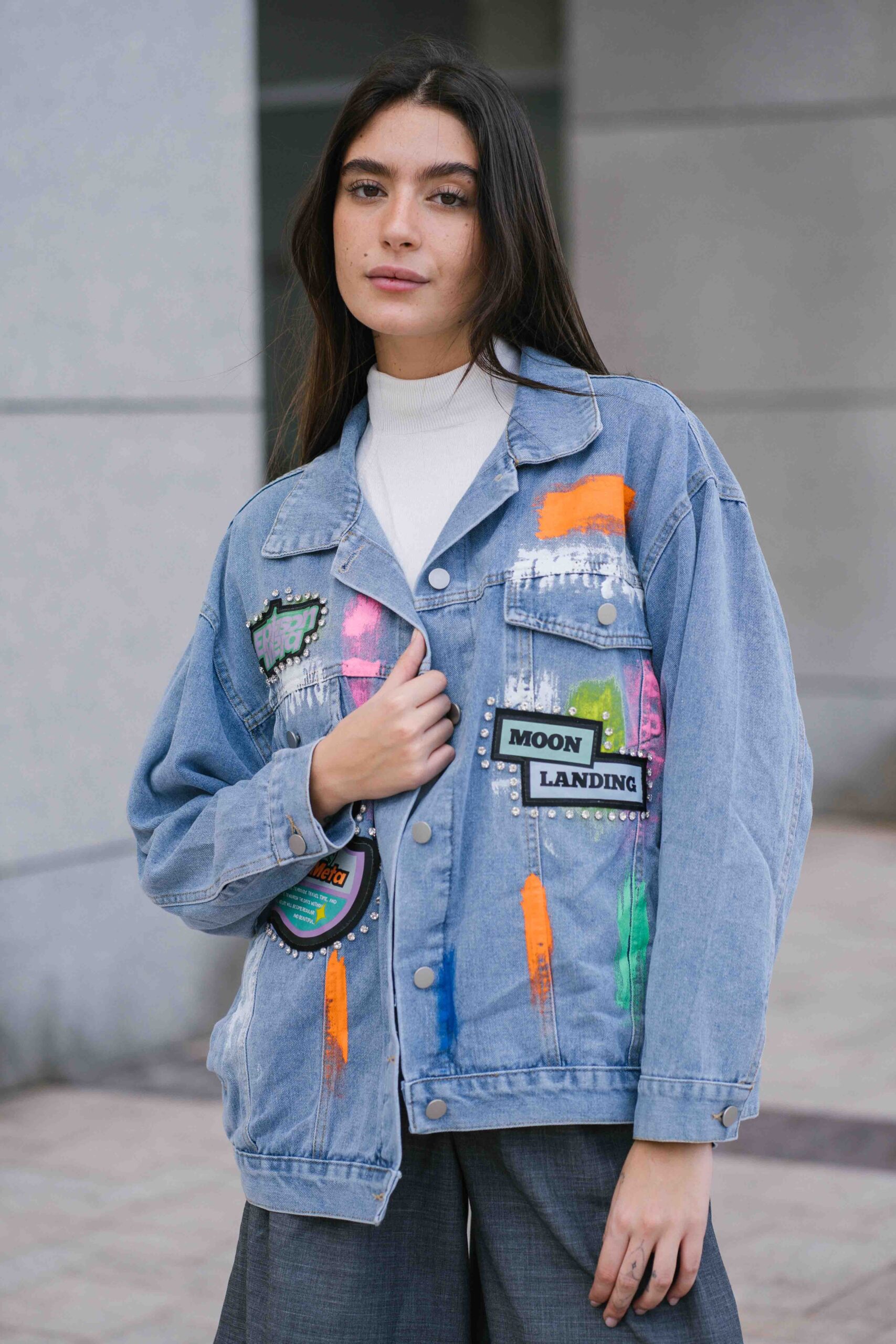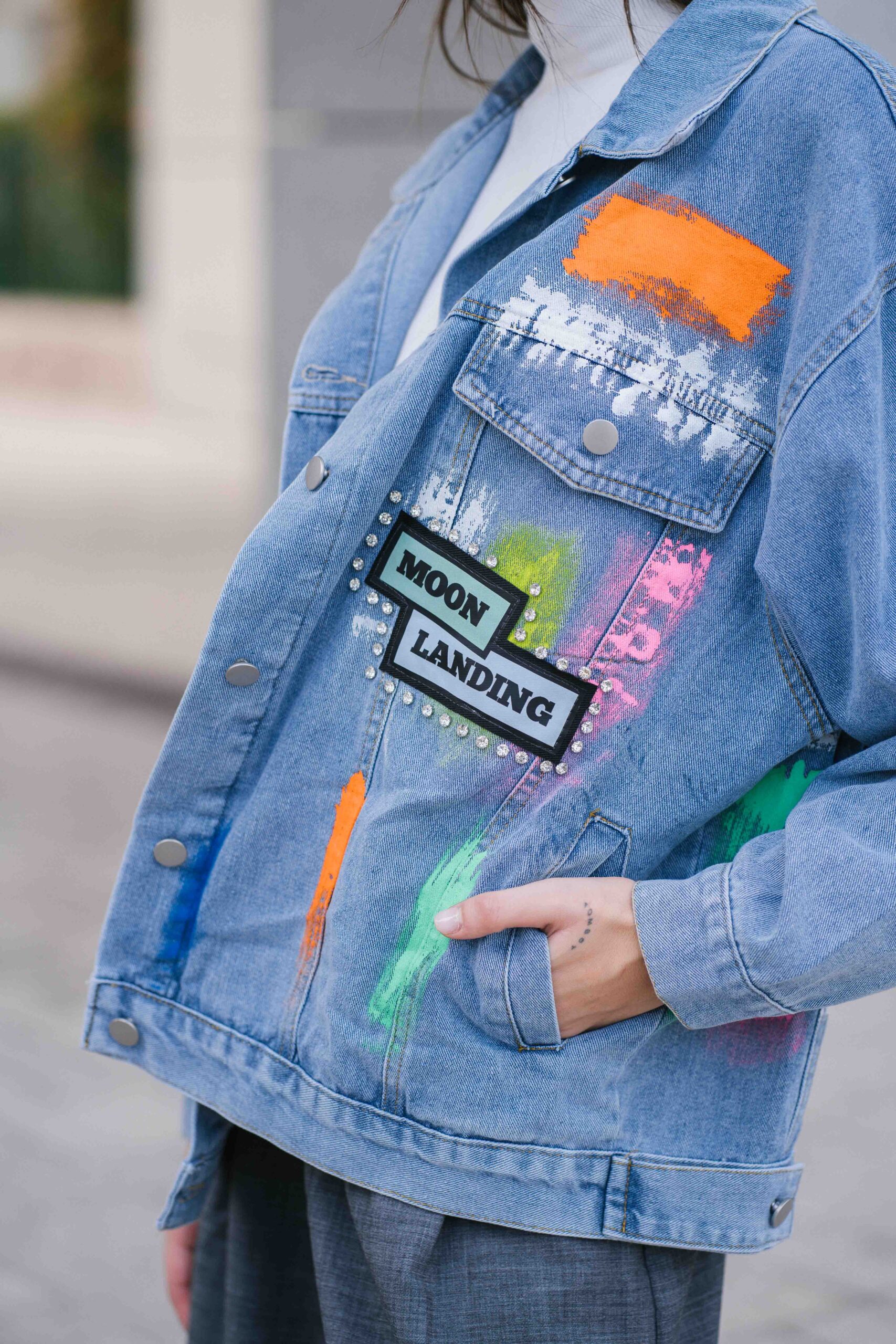 ג’קט ג’ינס בשילוב פאצ’ים ואלמנטים של אבנים.