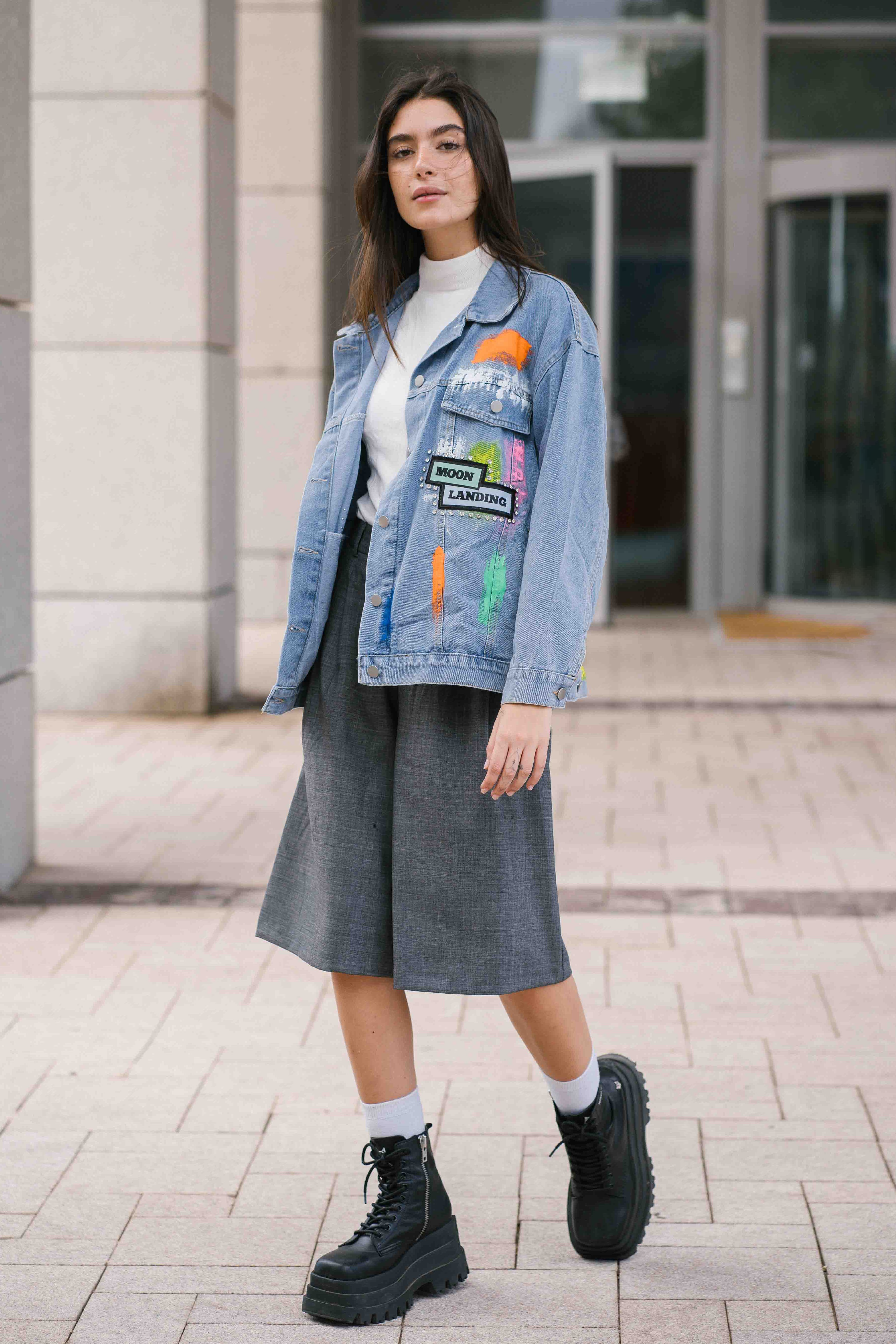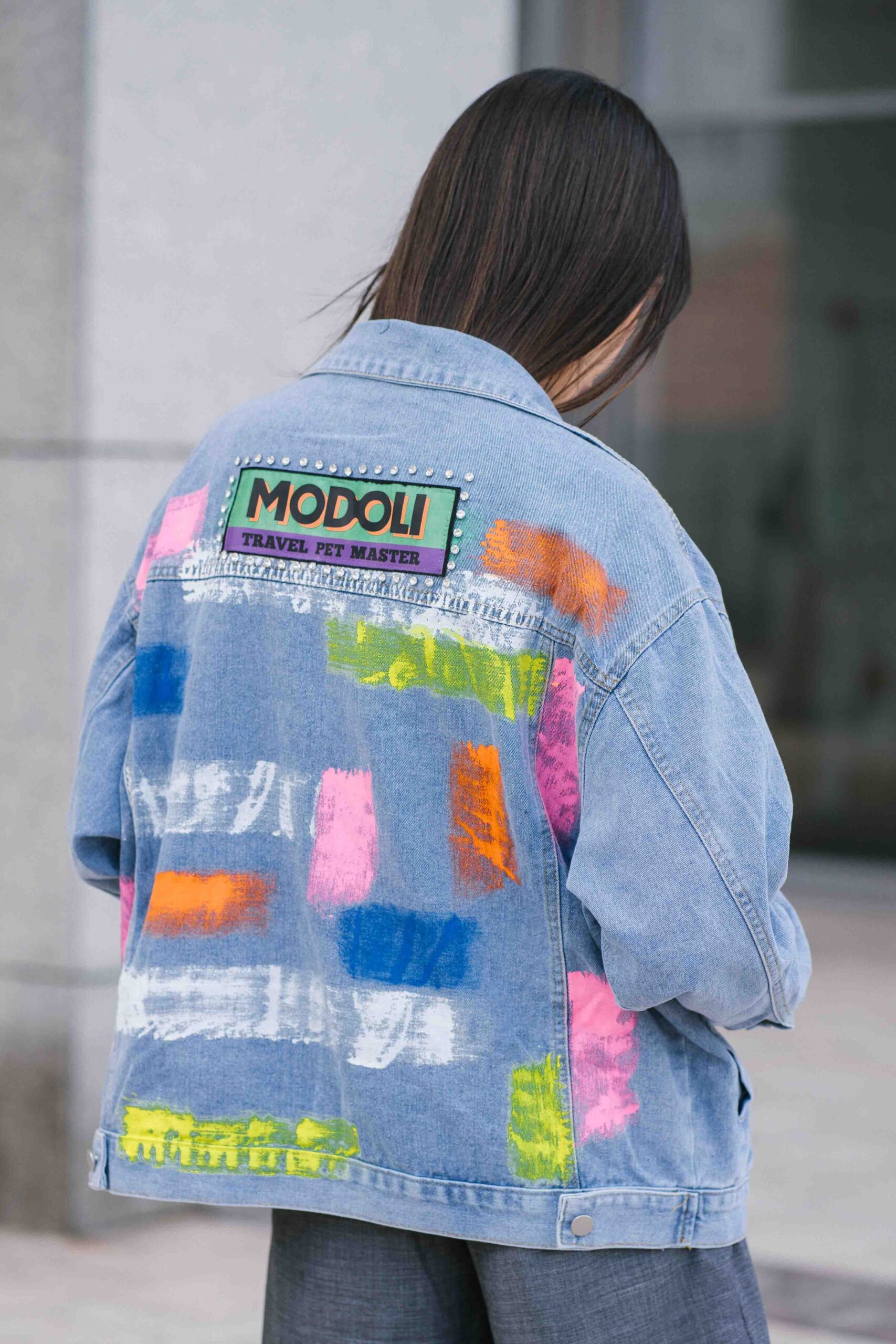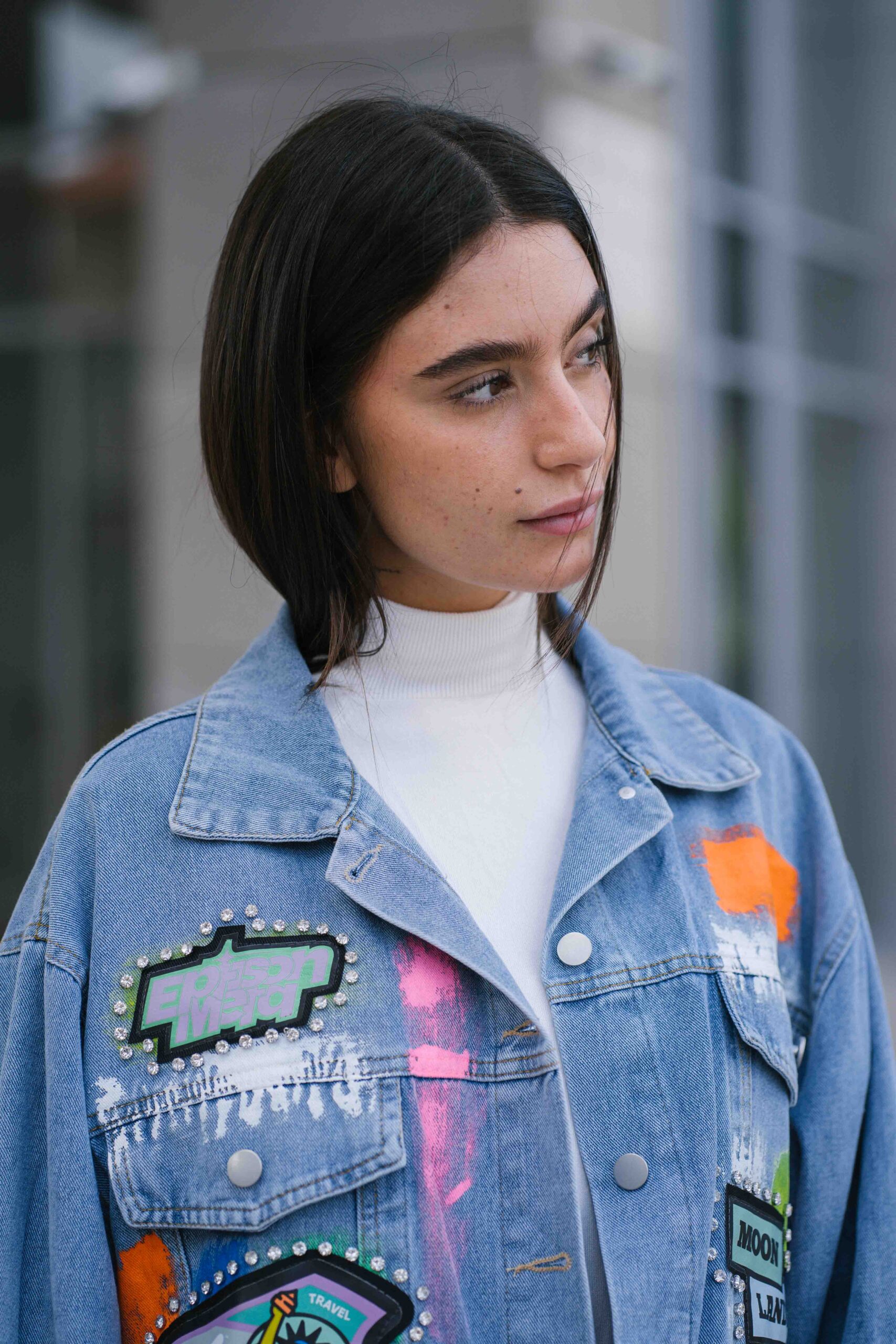 ג’קט ג’ינס בשילוב פאצ’ים ואלמנטים של אבנים.