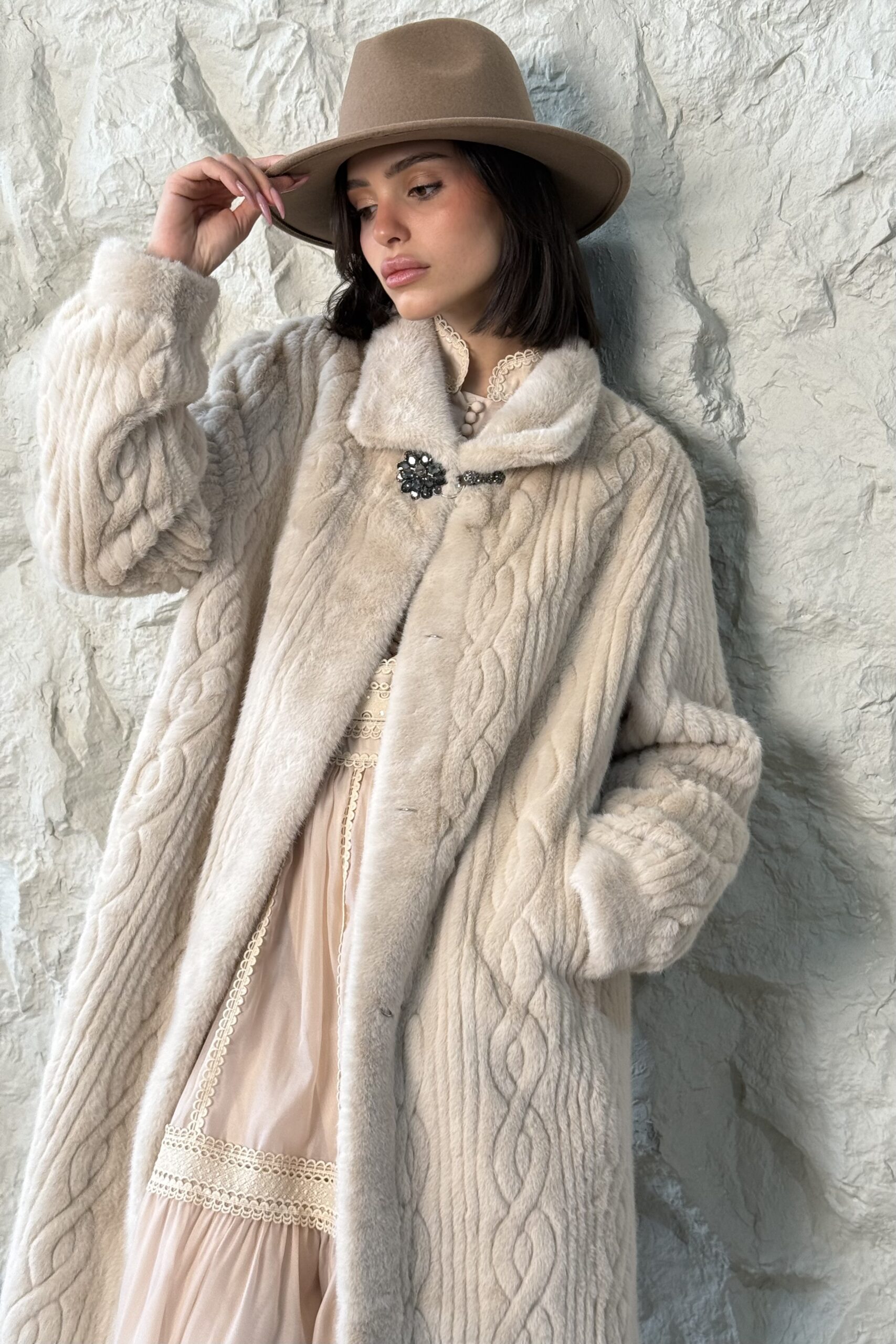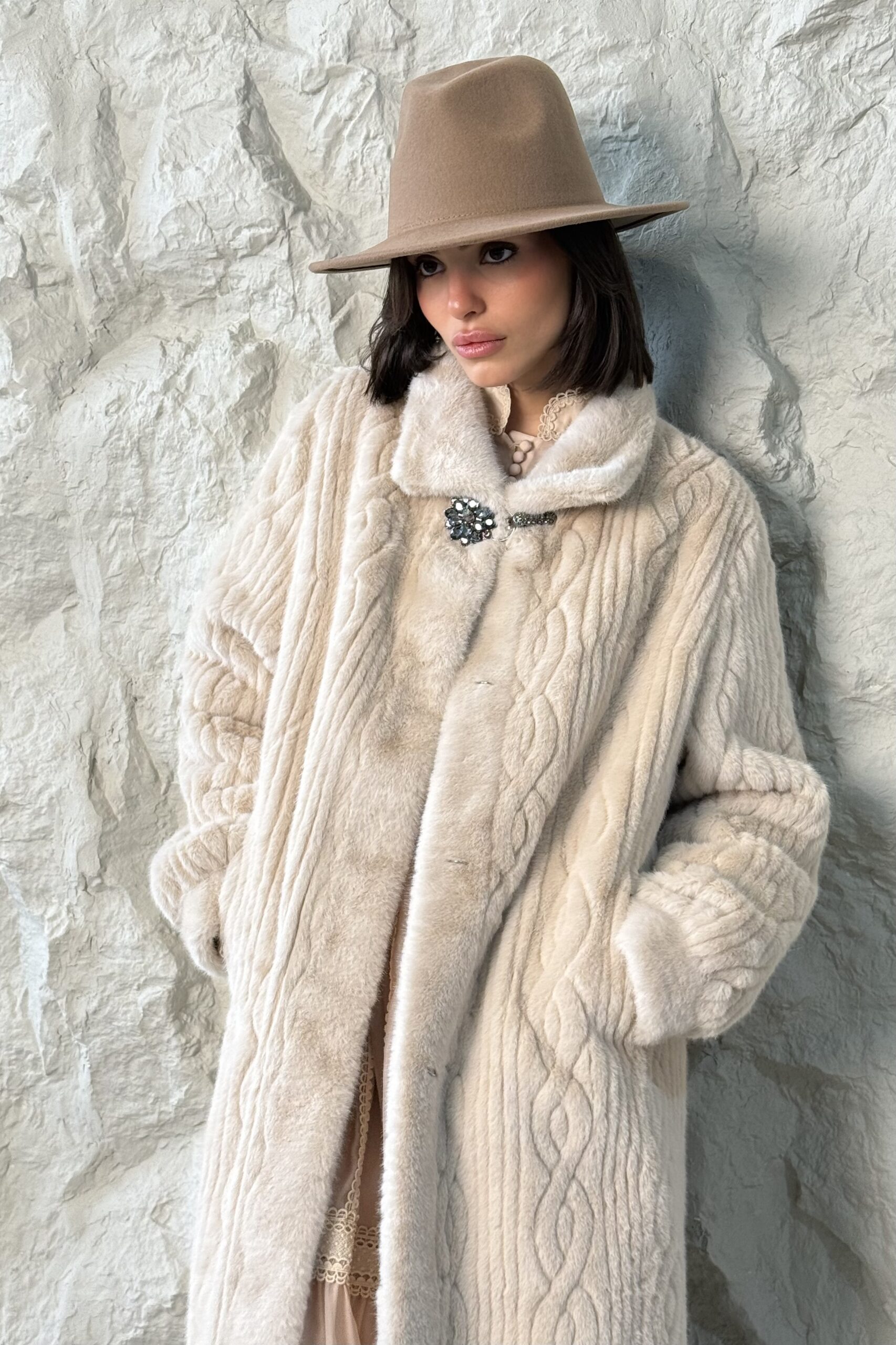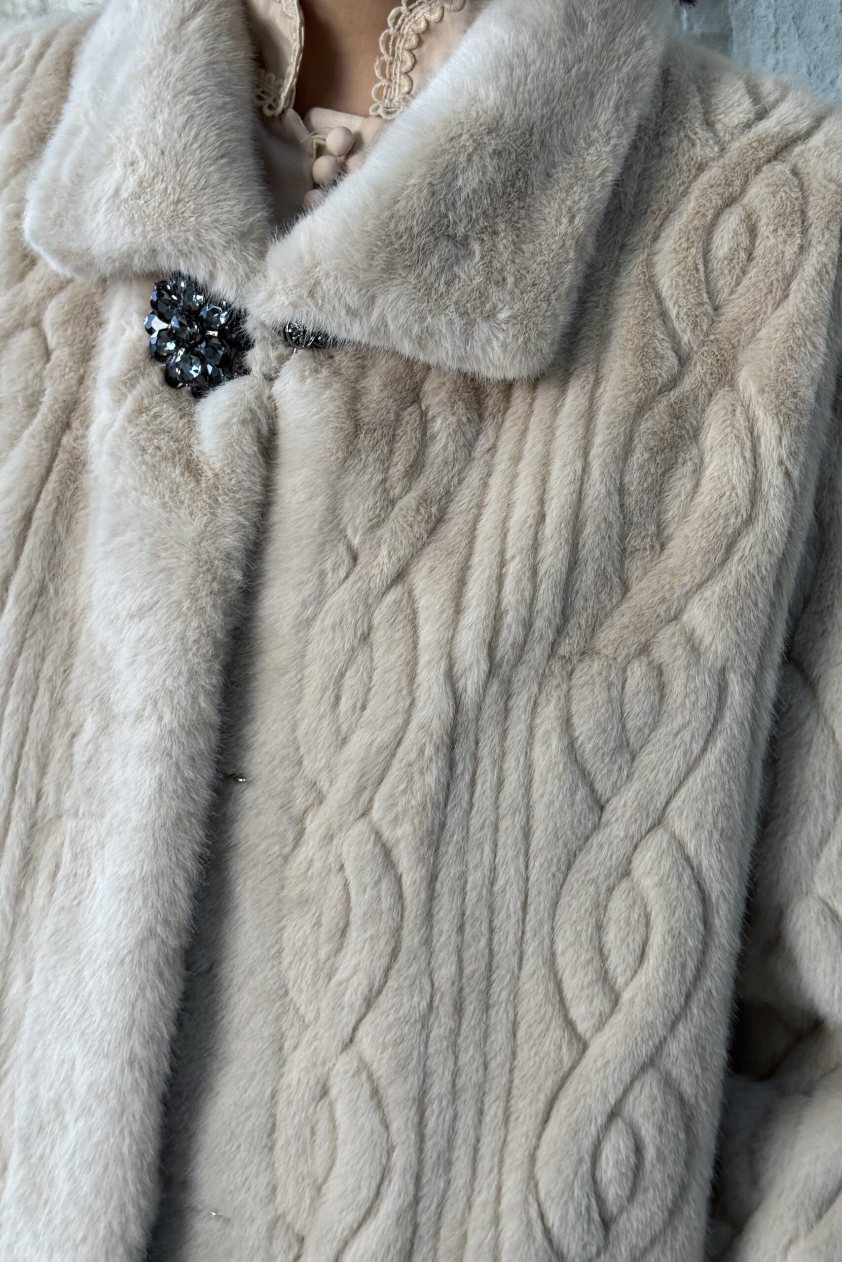 ג’קט פרווה ארוך עם טקסטורה ייחודית על הפרווה. בשילוב אלמנט סגירה עם כפתורי תכשיט המעוטרים באבנים ייחודיות.