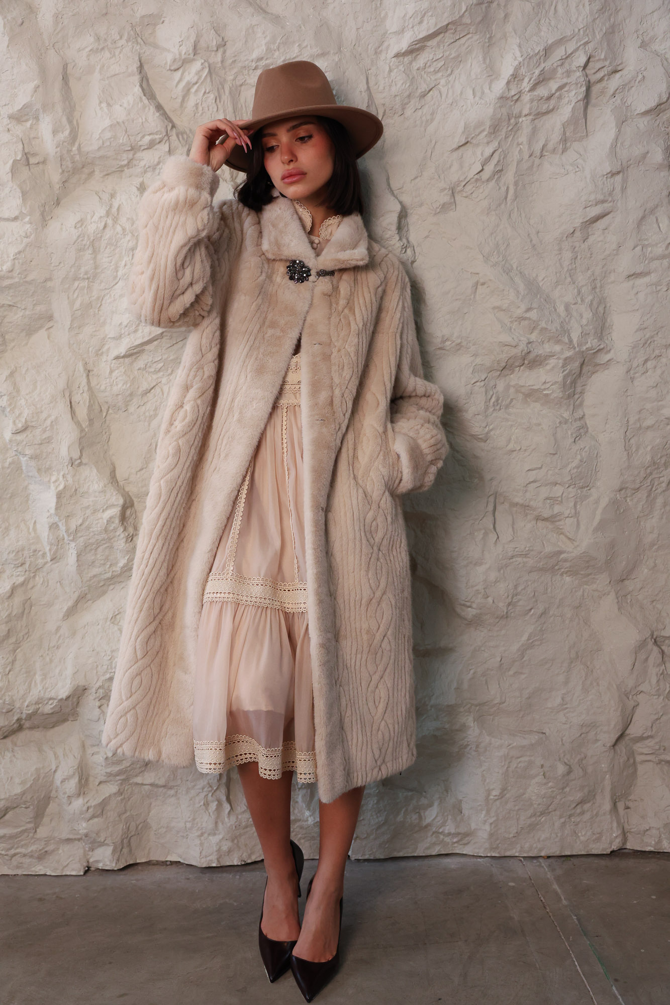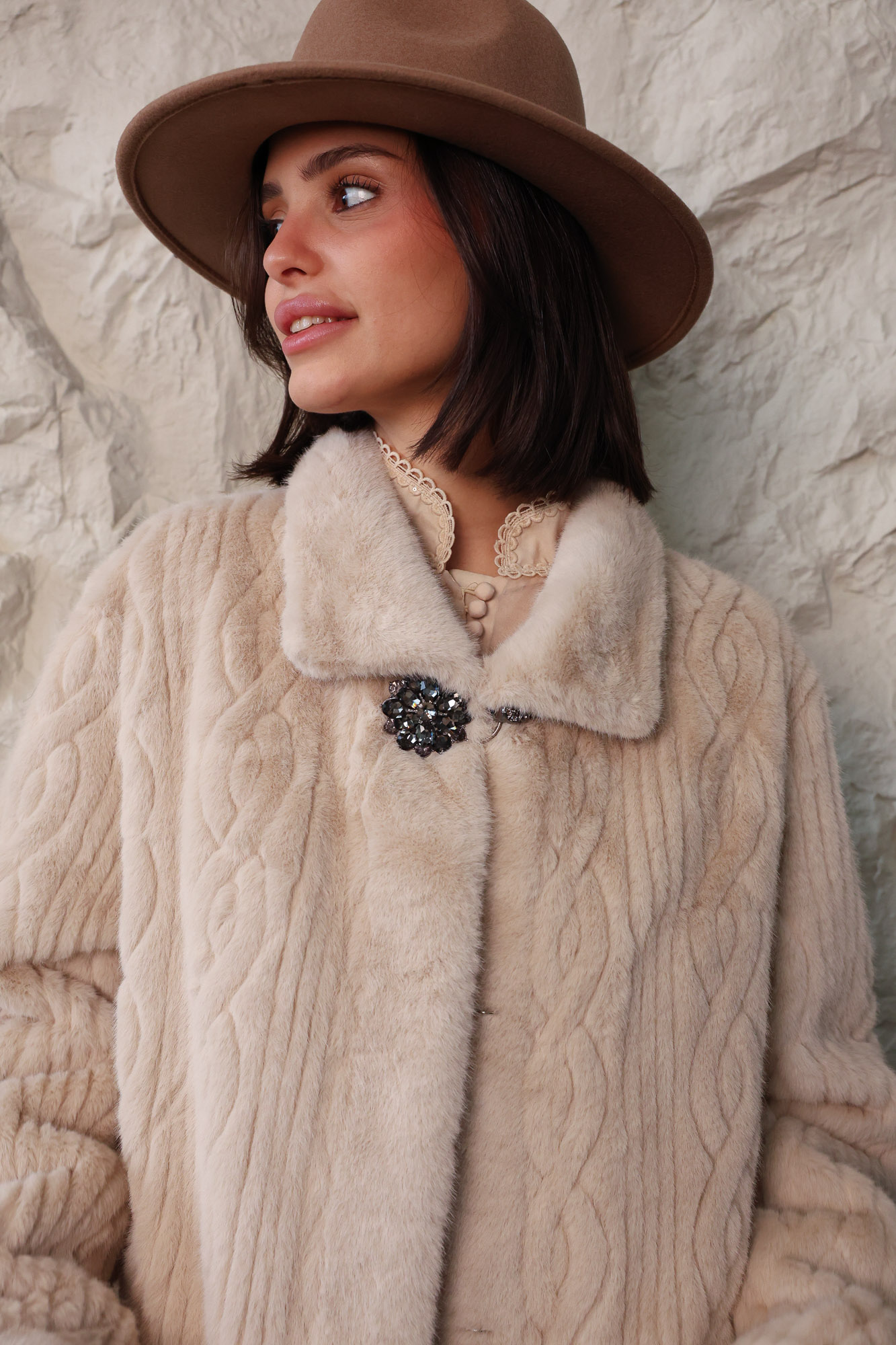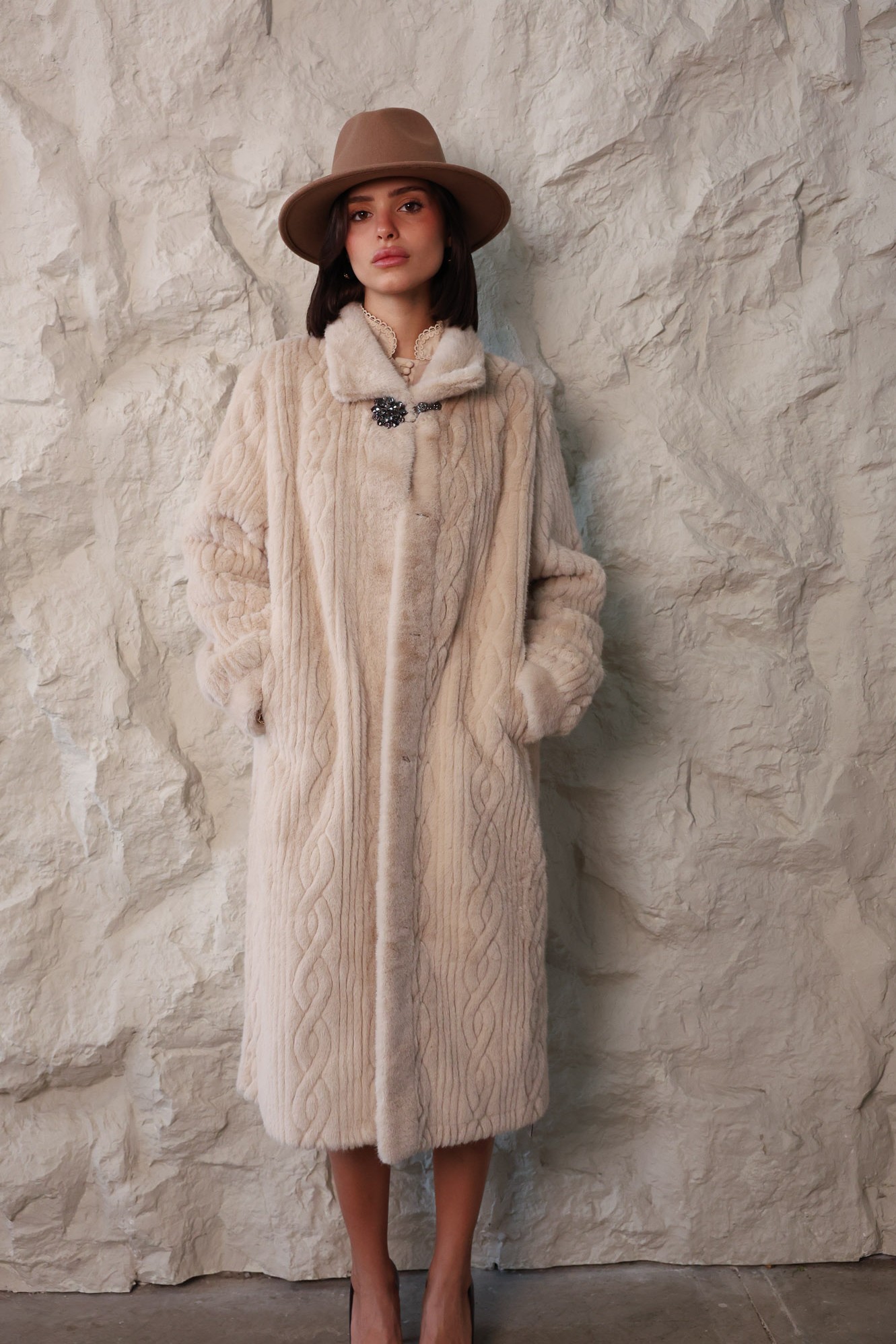 ג’קט פרווה ארוך עם טקסטורה ייחודית על הפרווה. בשילוב אלמנט סגירה עם כפתורי תכשיט המעוטרים באבנים ייחודיות.