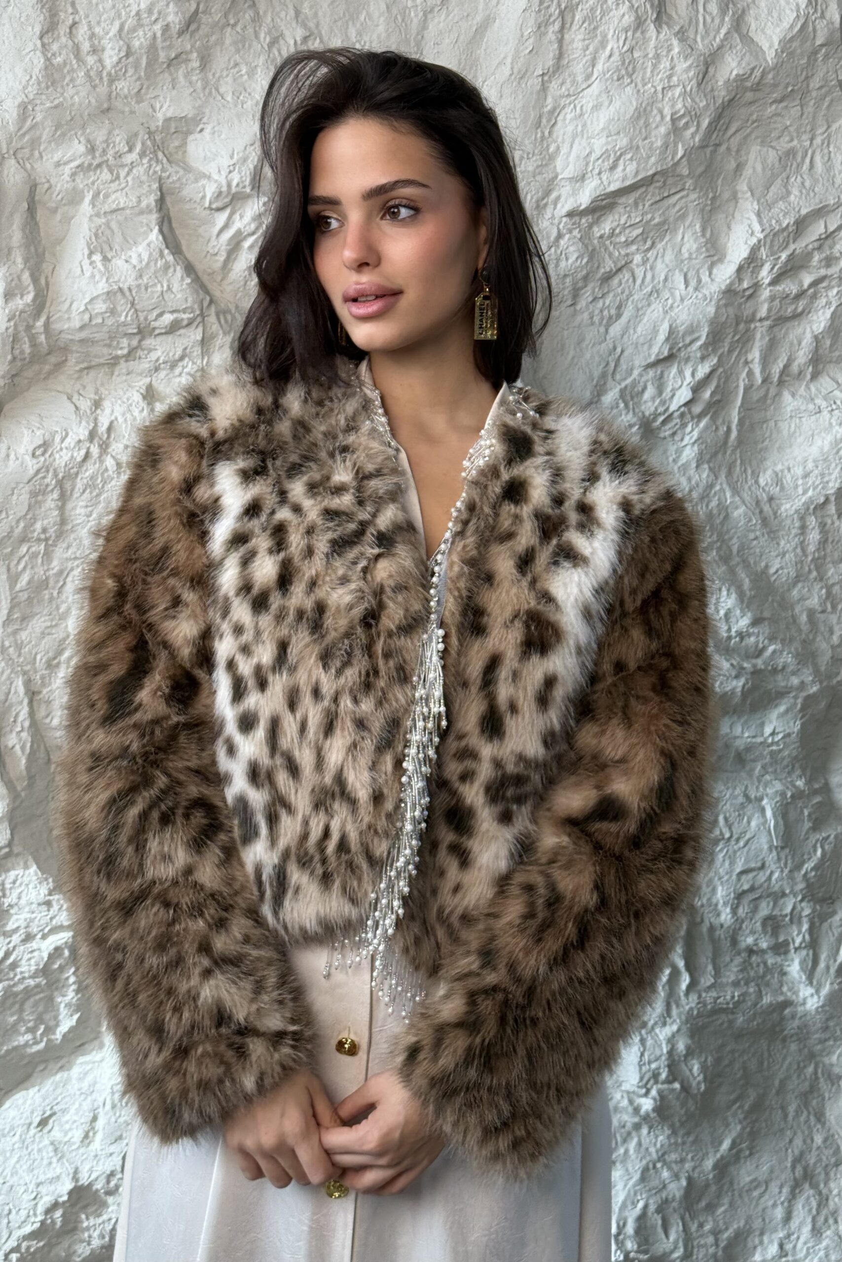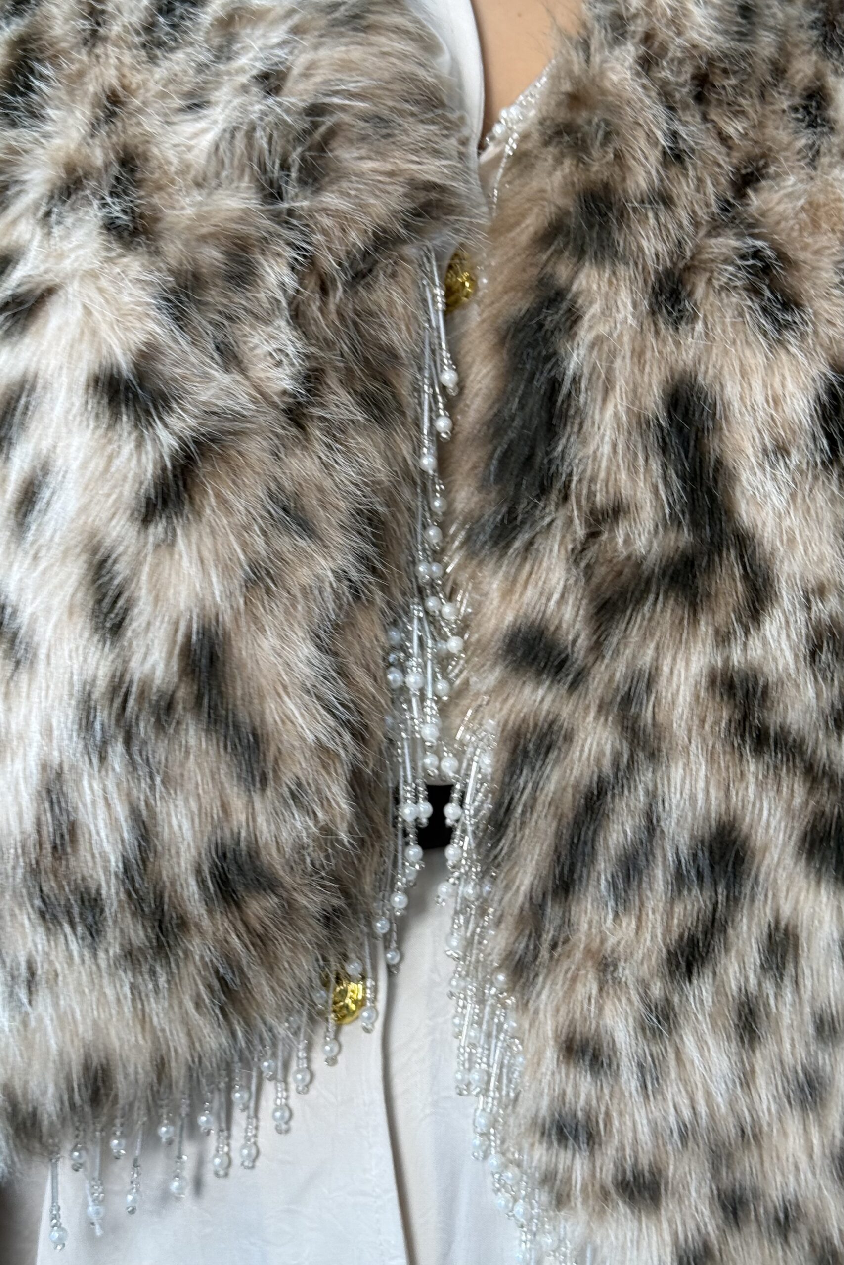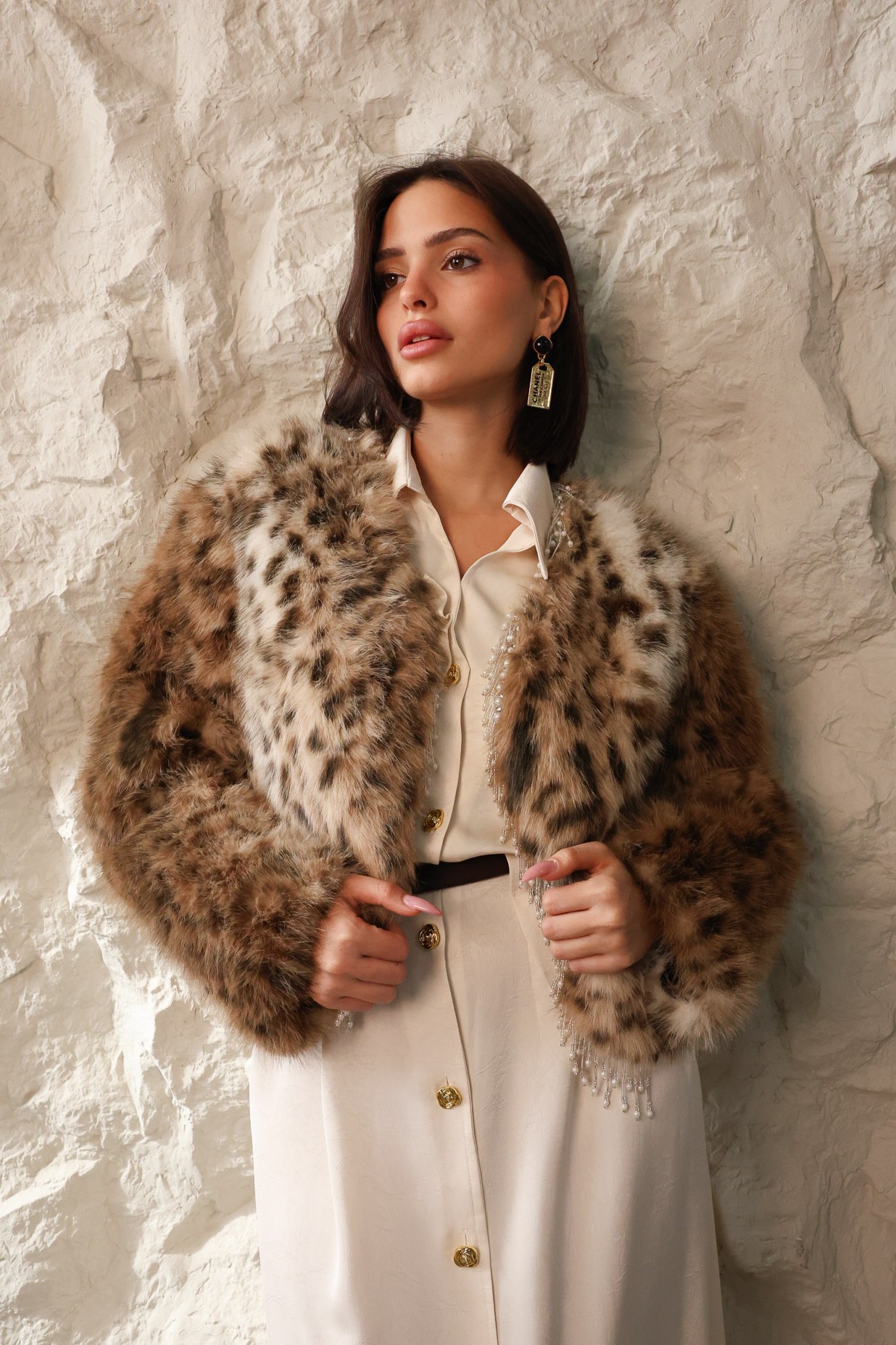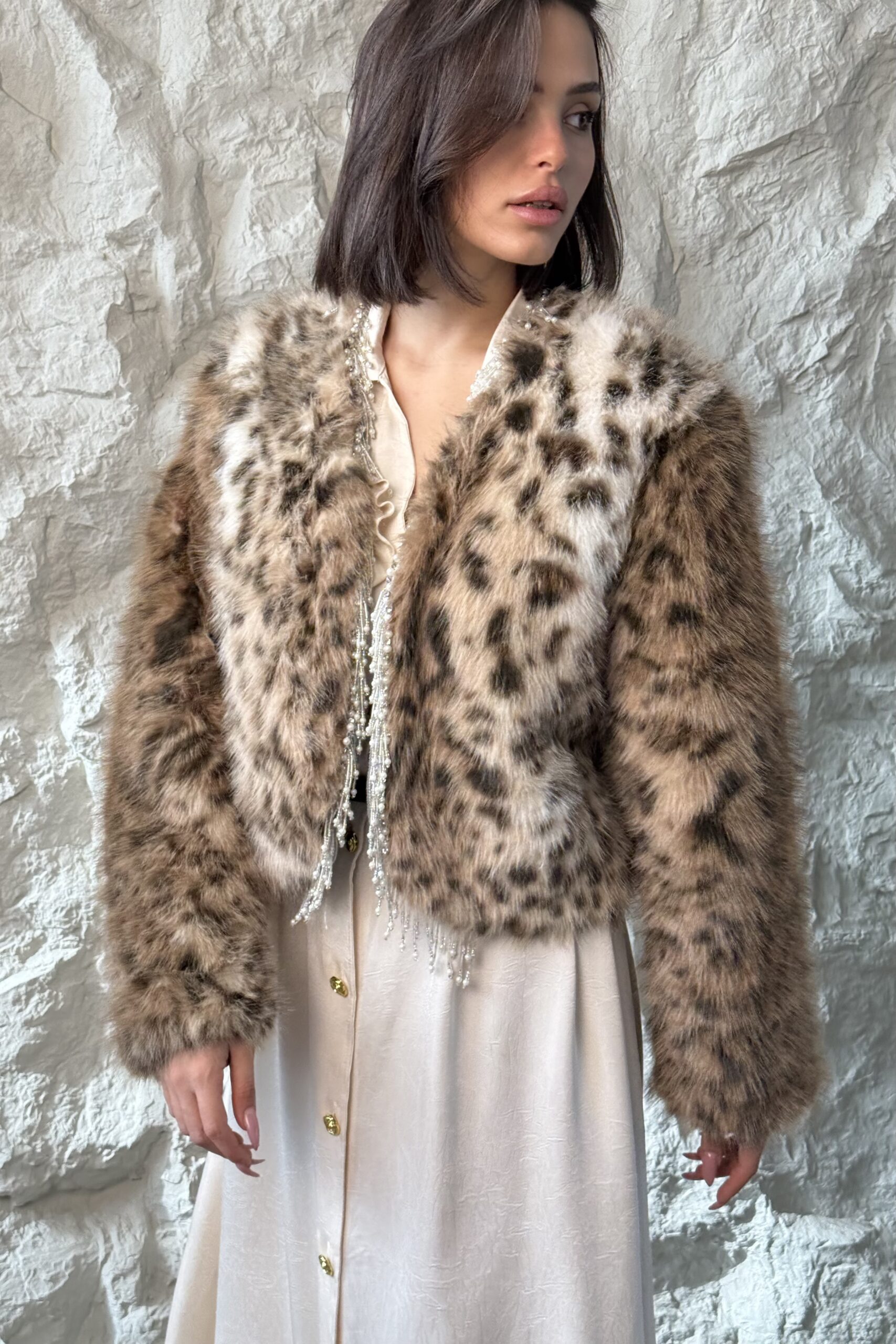 ג’קט פרווה קצר בשילוב אבני פנינה וחרוזים בגווני מנומר עדינים.