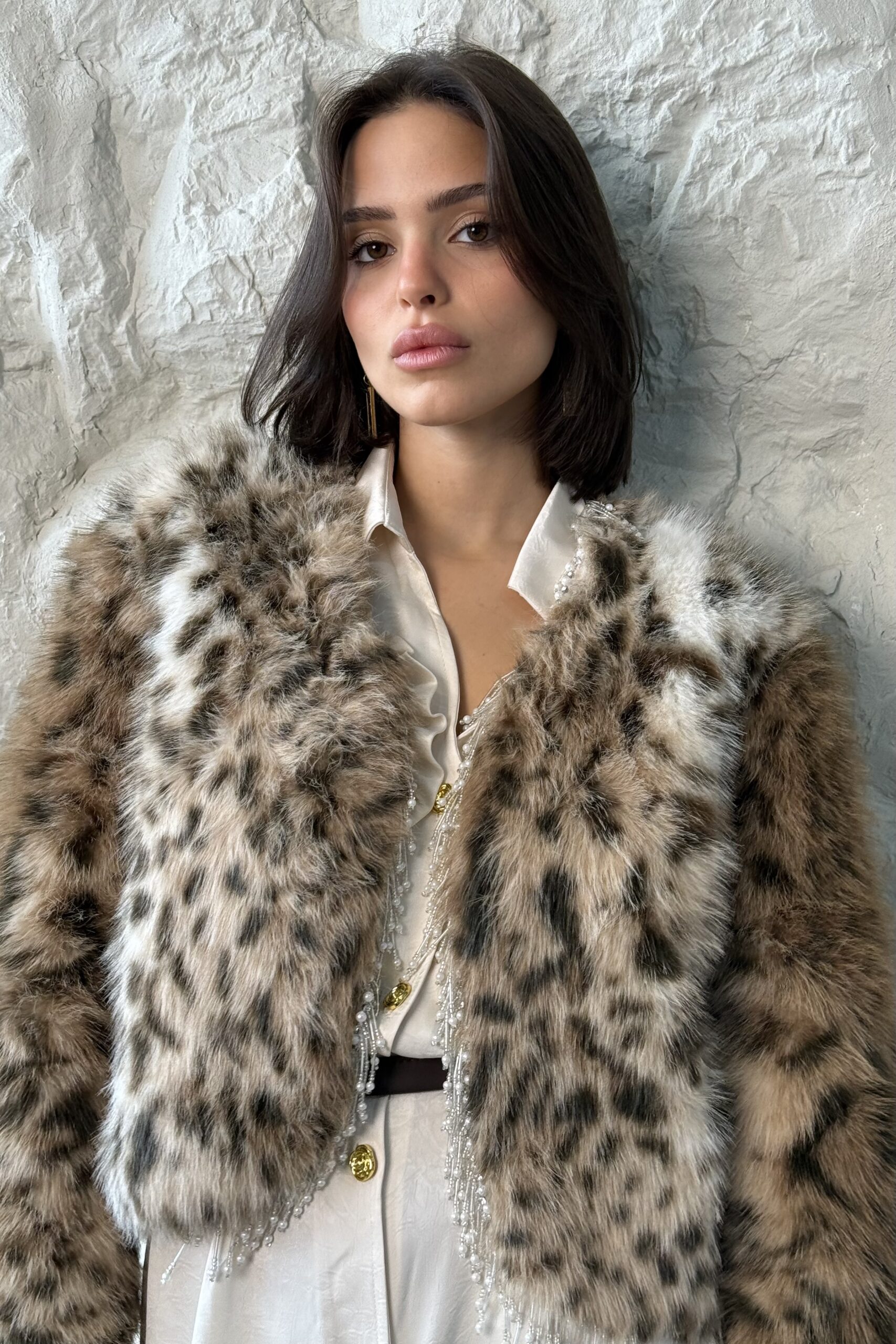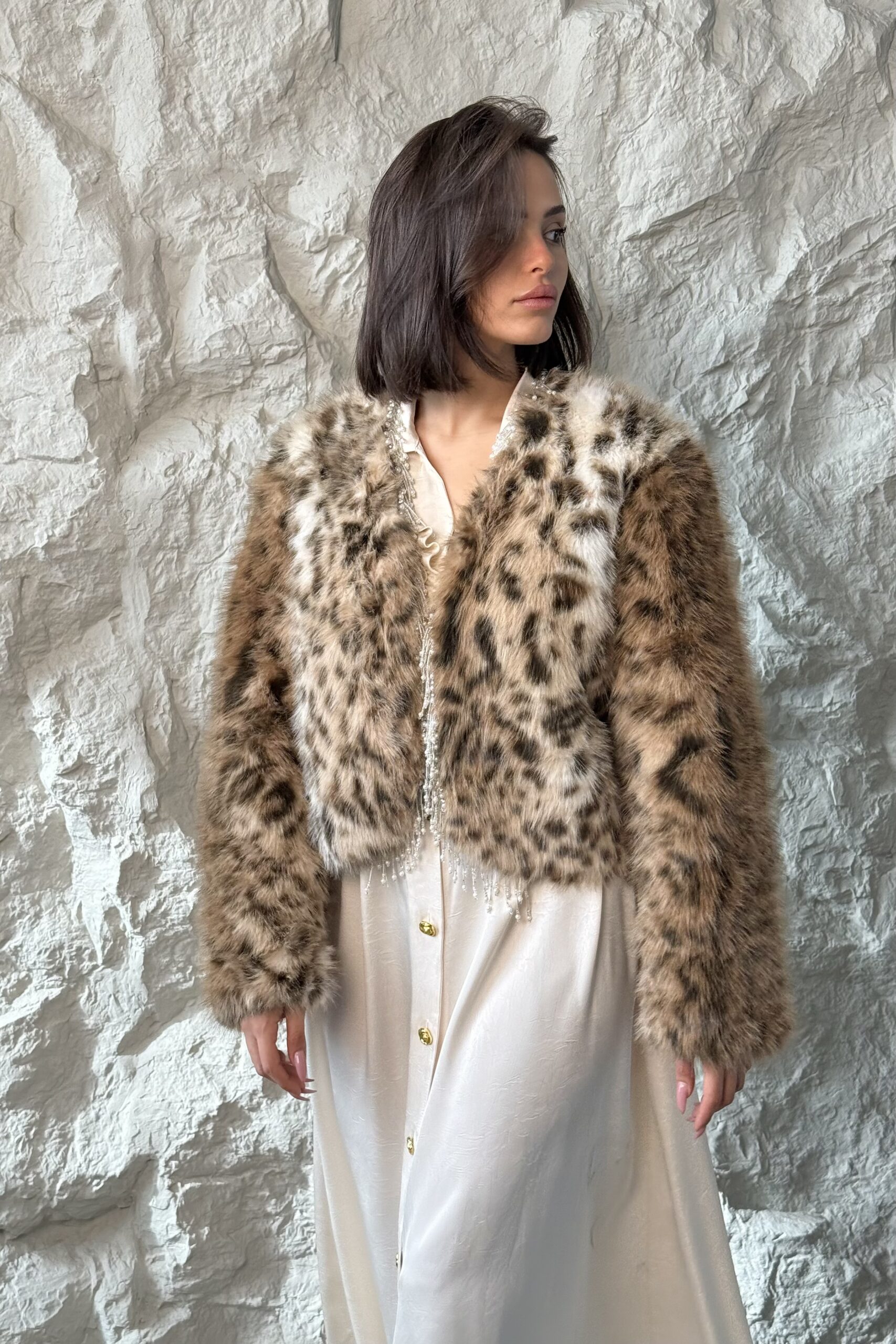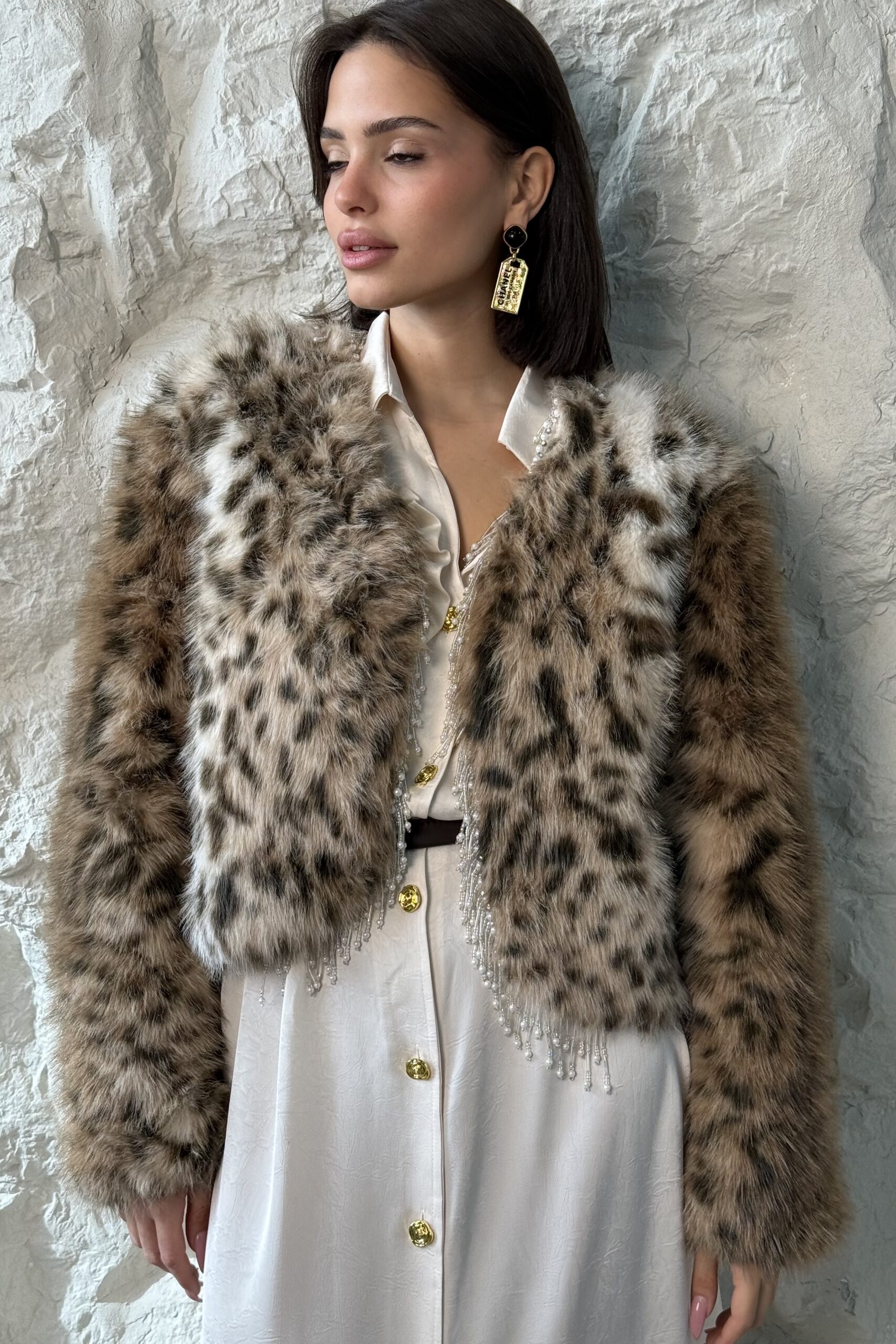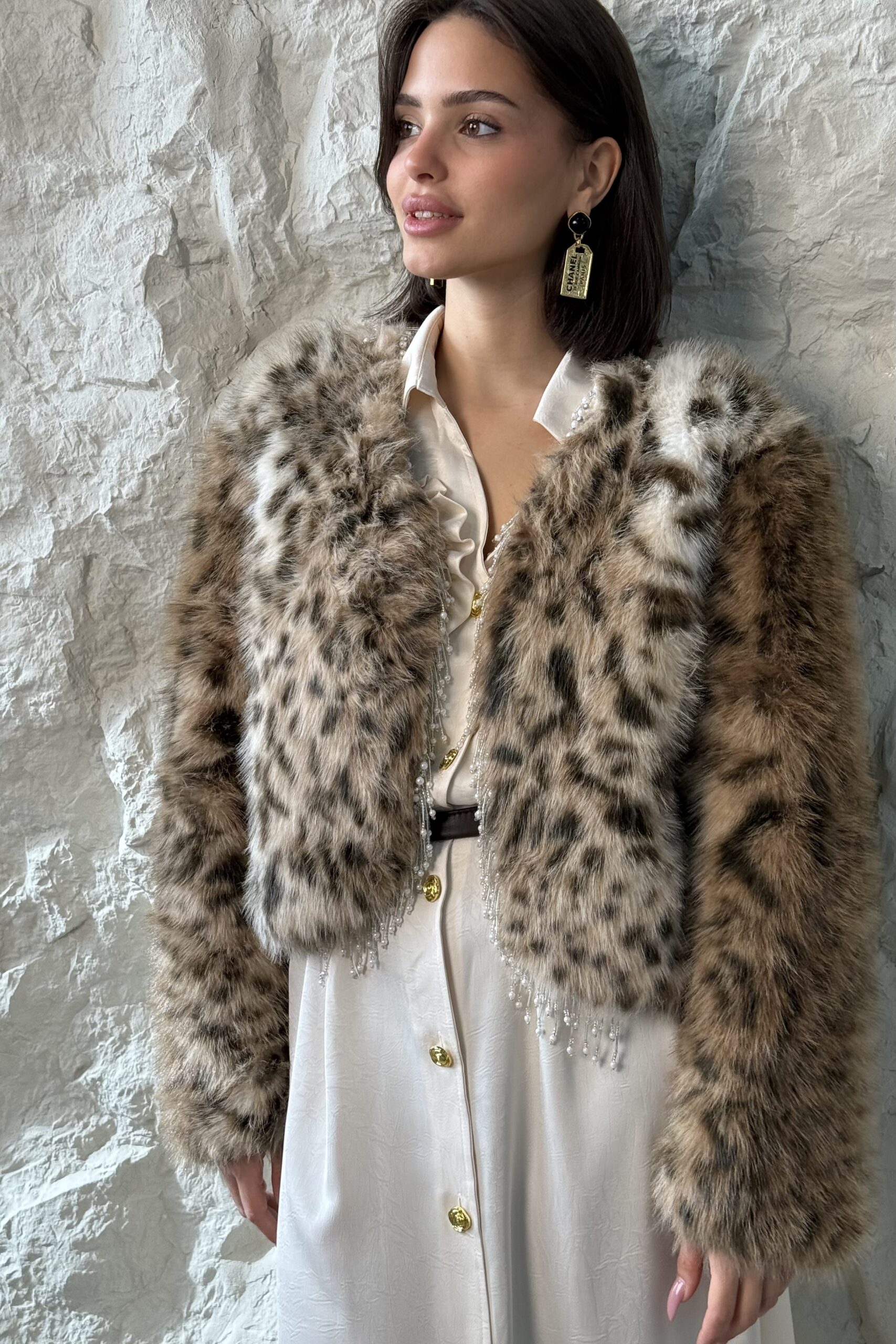 ג’קט פרווה קצר בשילוב אבני פנינה וחרוזים בגווני מנומר עדינים.