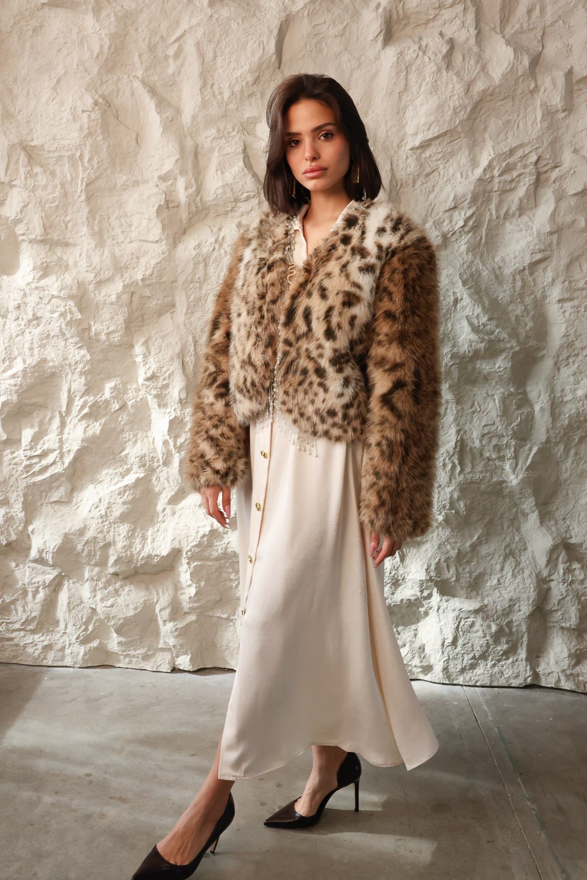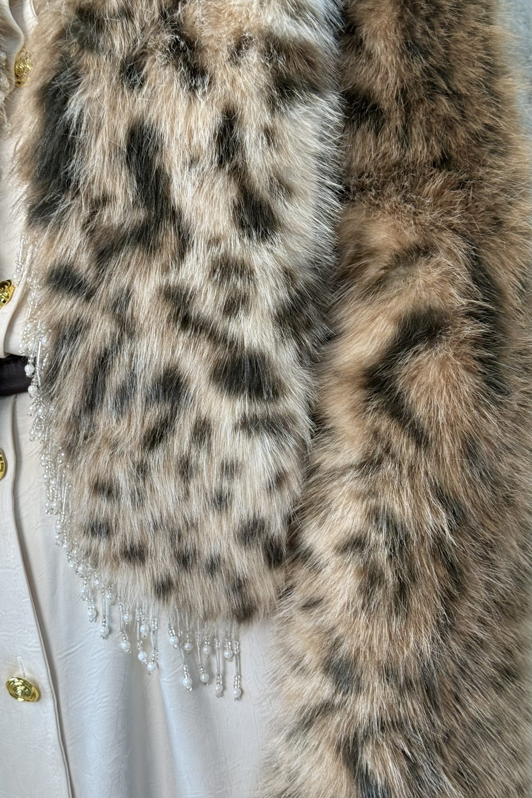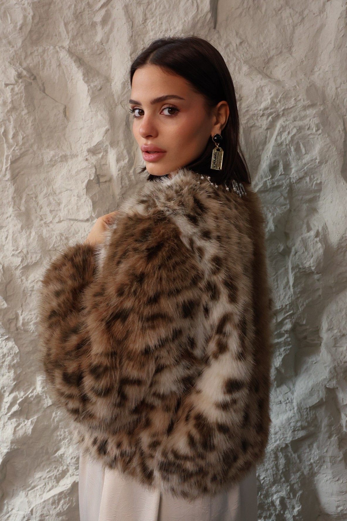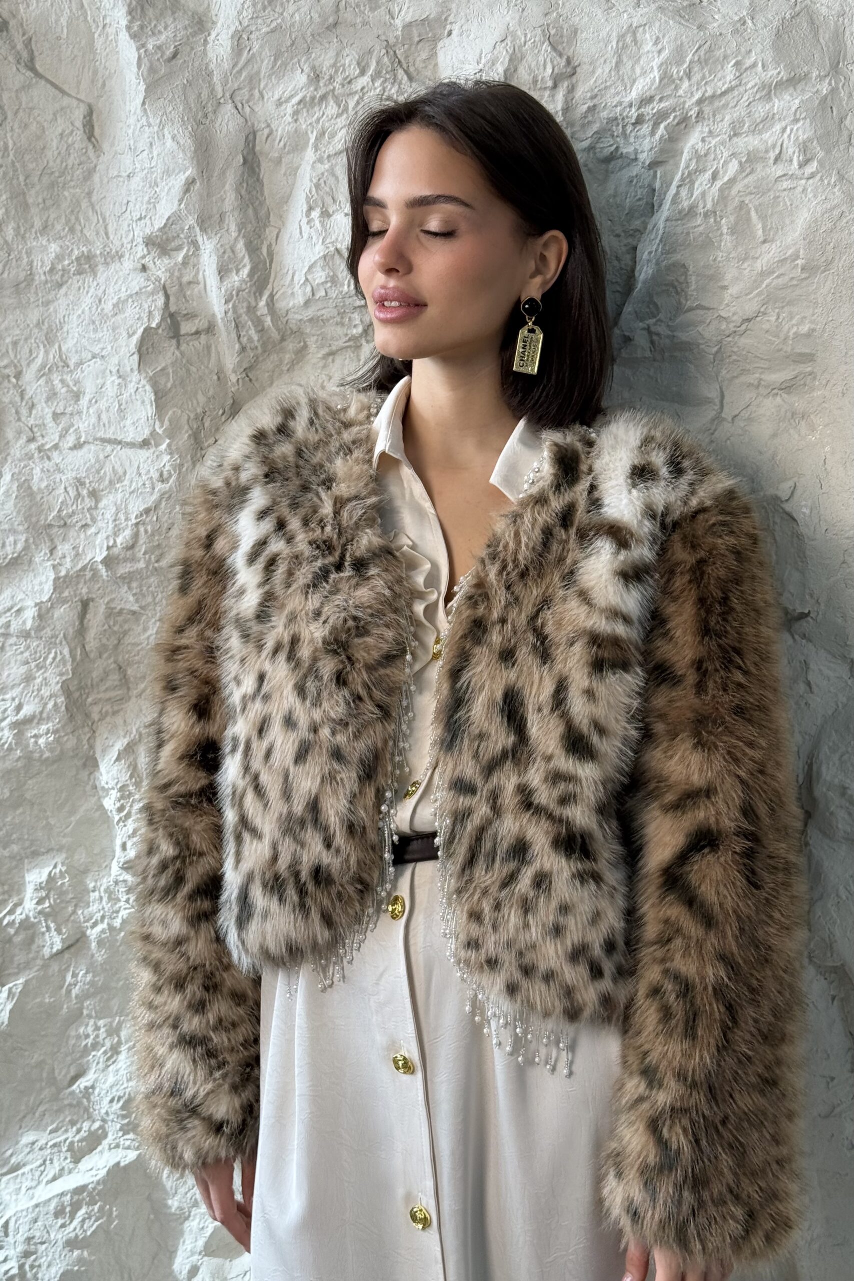 ג’קט פרווה קצר בשילוב אבני פנינה וחרוזים בגווני מנומר עדינים.