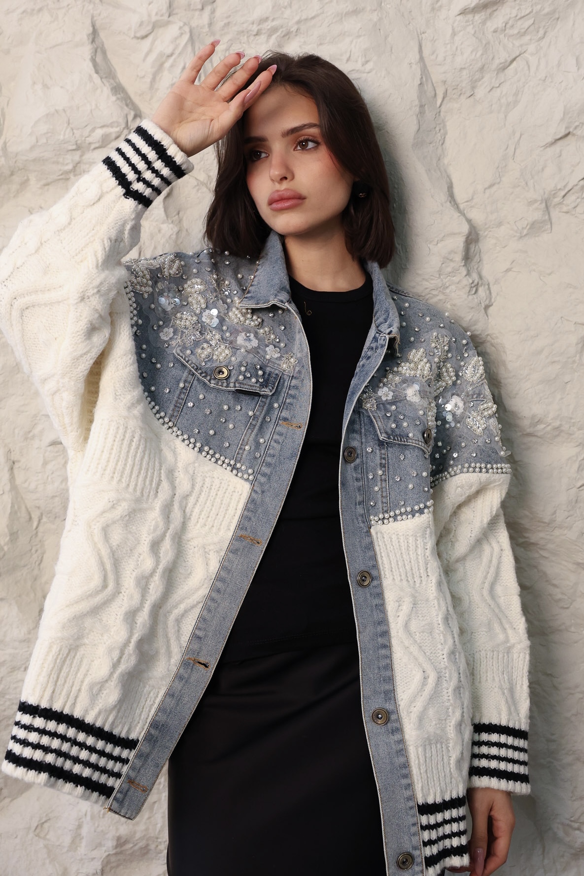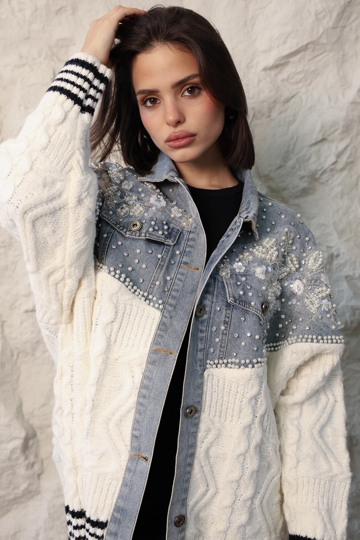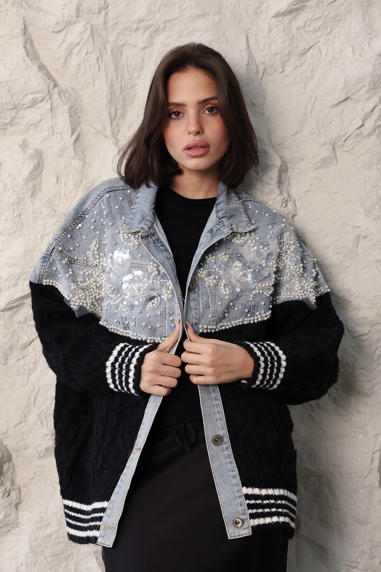 ג’קט ג׳ינס בשילוב בד סריג עם אפליקציות של פייטים ואבנים זעירות.