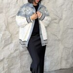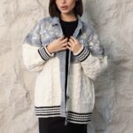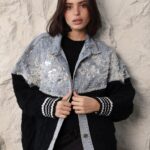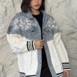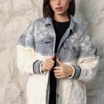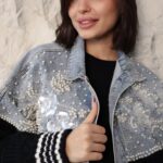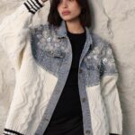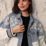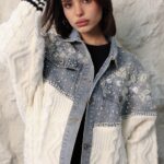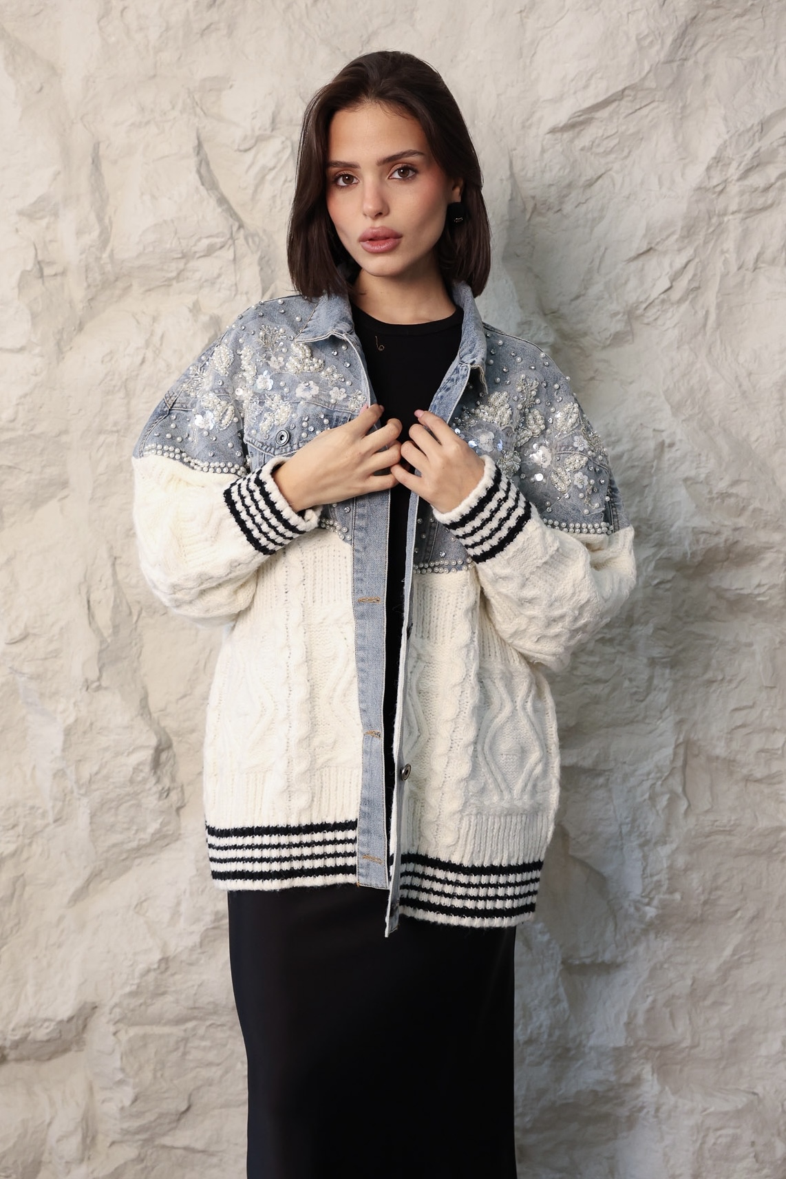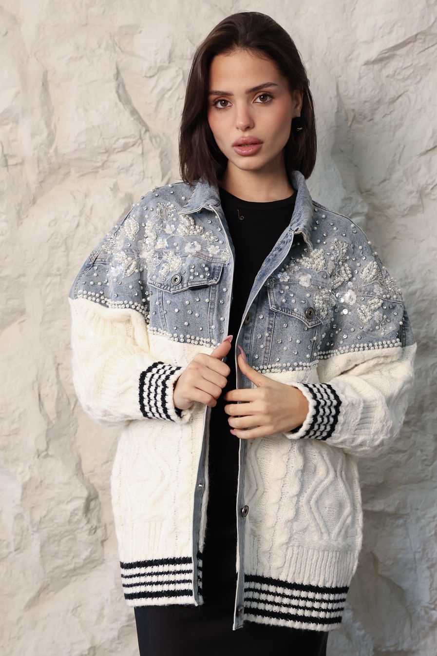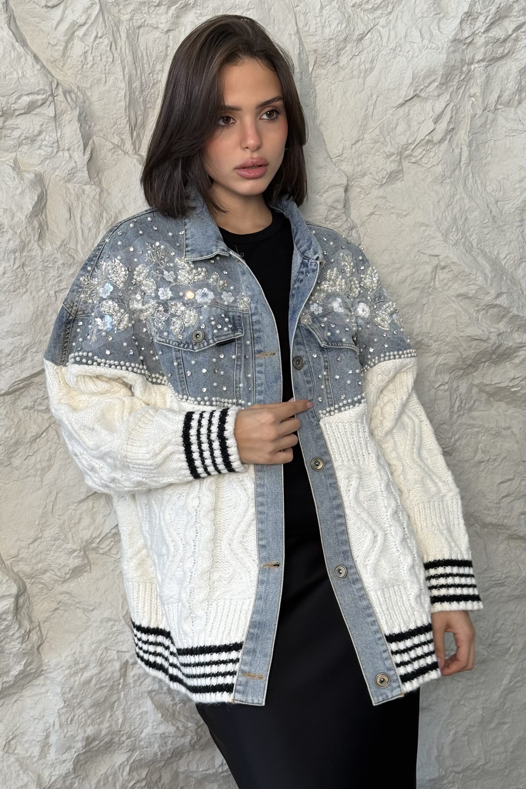 ג’קט ג׳ינס בשילוב בד סריג עם אפליקציות של פייטים ואבנים זעירות.