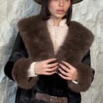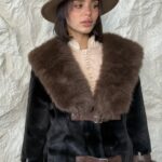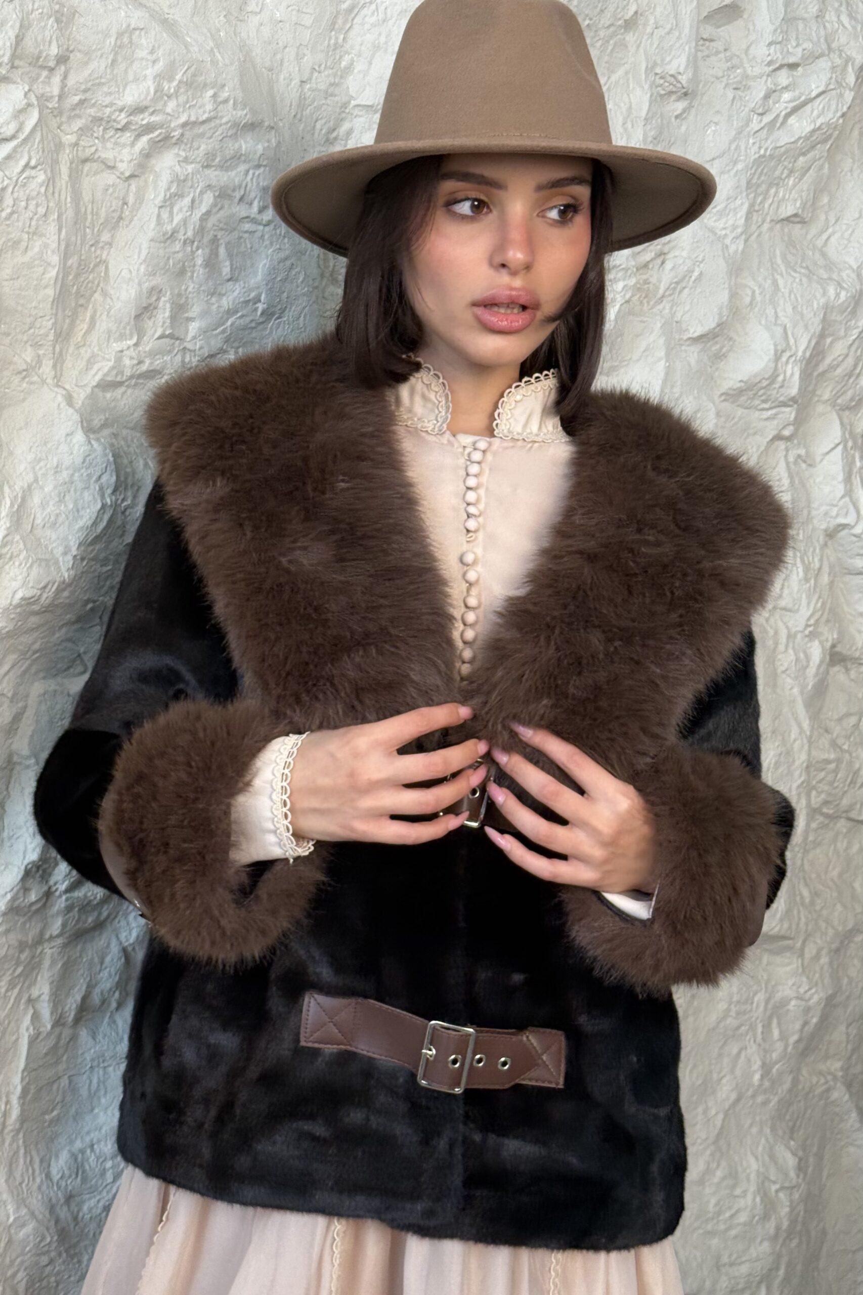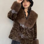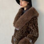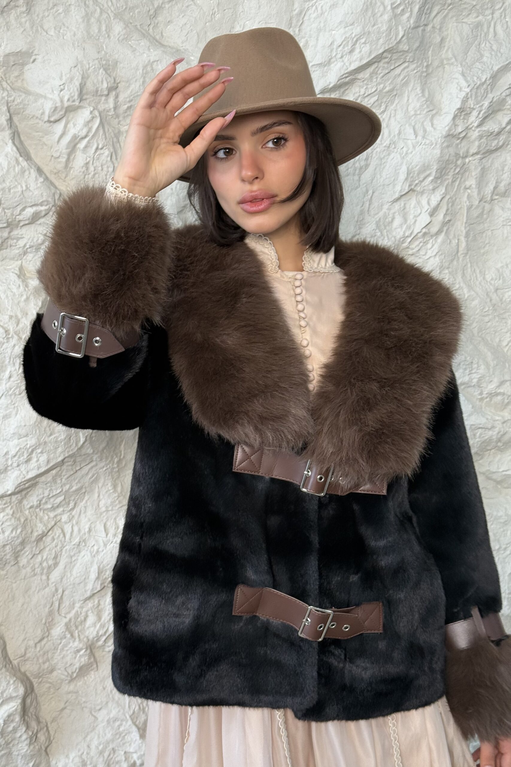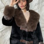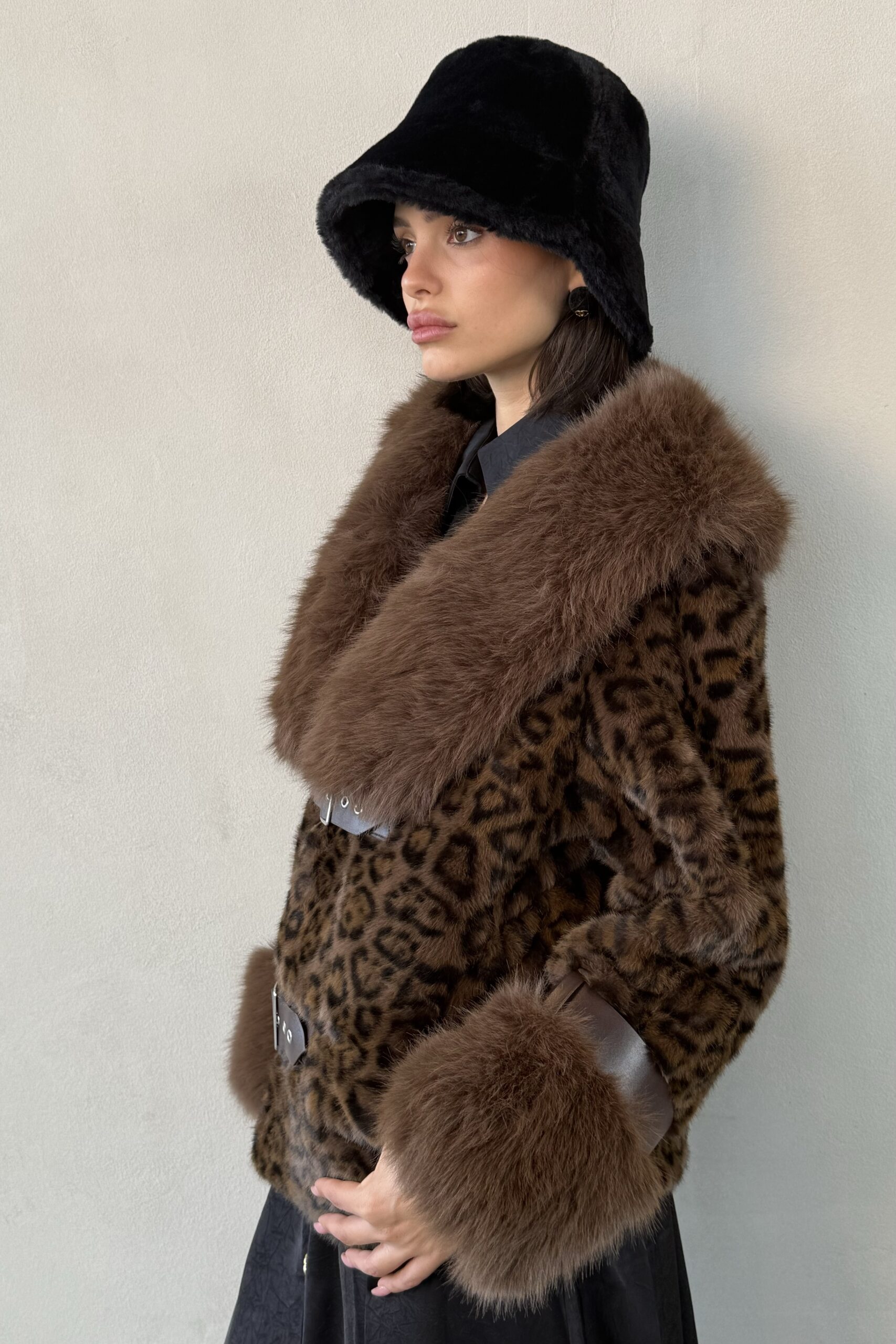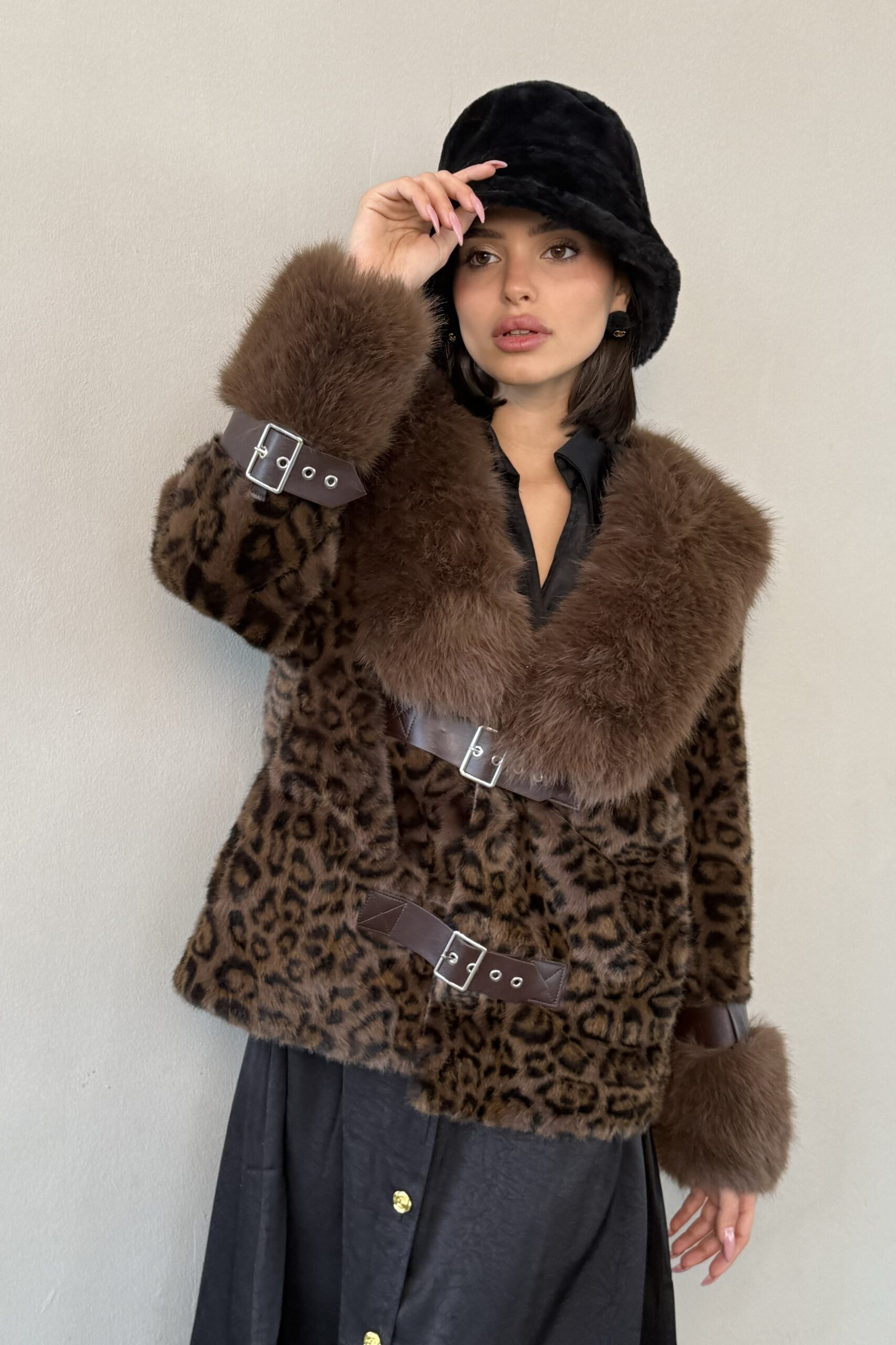 מעיל פרווה בשילוב סגירת שני רצועות מדמוי עור, המשולבות גם בשרוולי הידיים.
