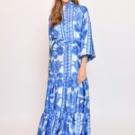לשמלה צווארון סיני רחב ושרוולים עם נפח עדין בסיומת גומי נסתר המאפשר לשחק עם אורך השרוול.