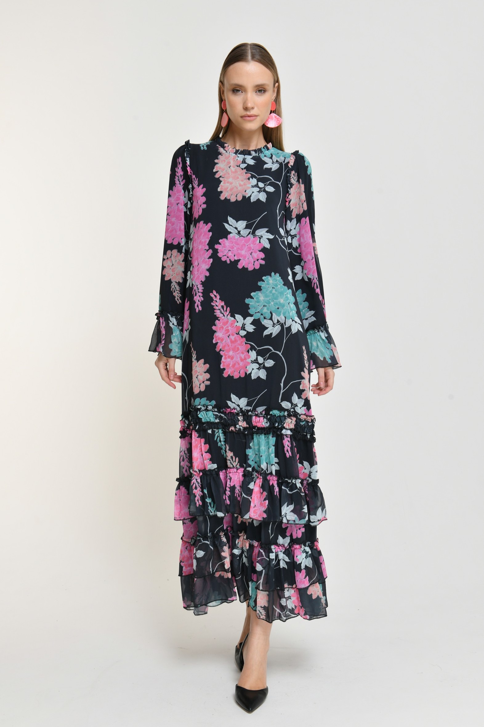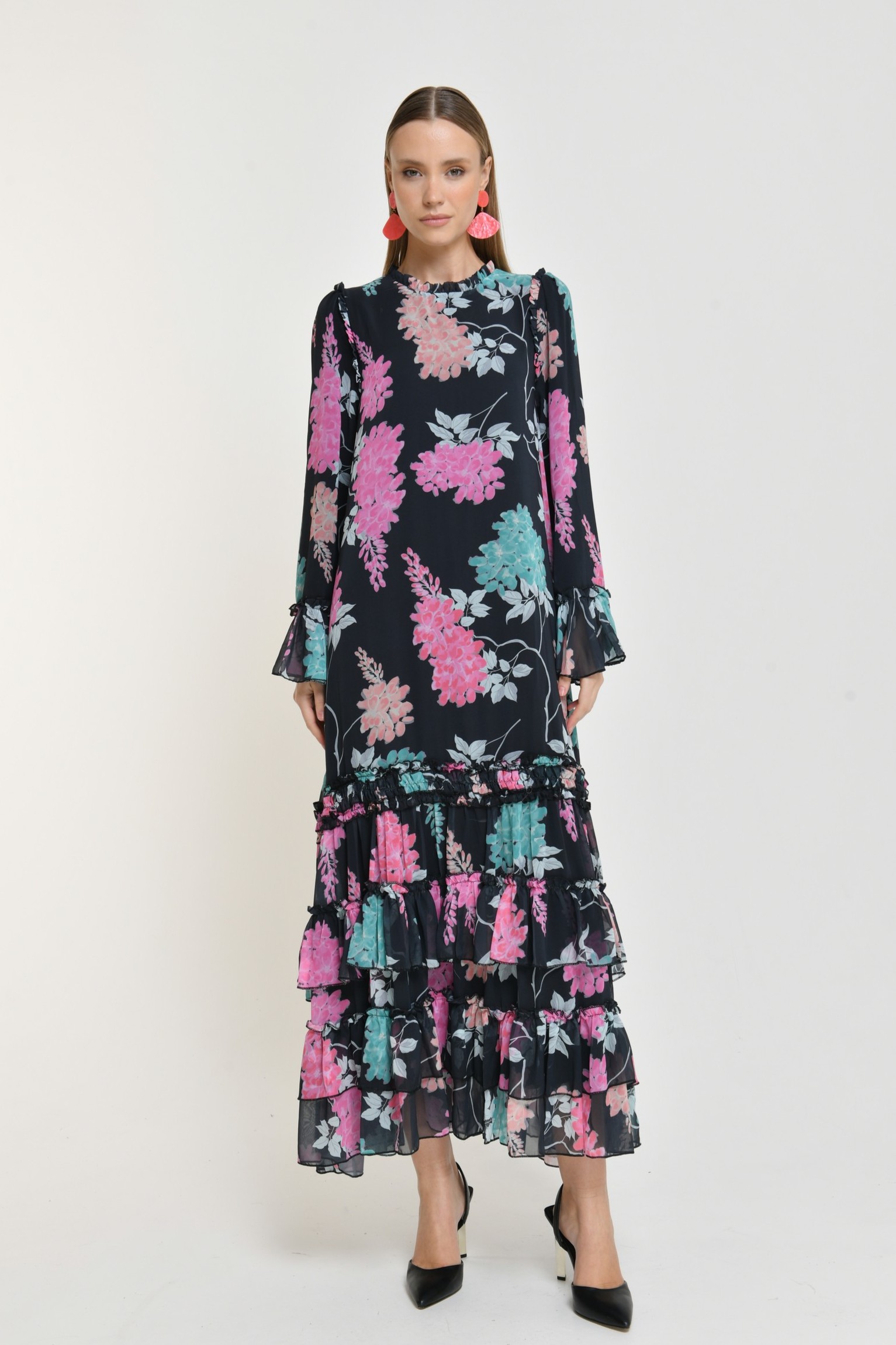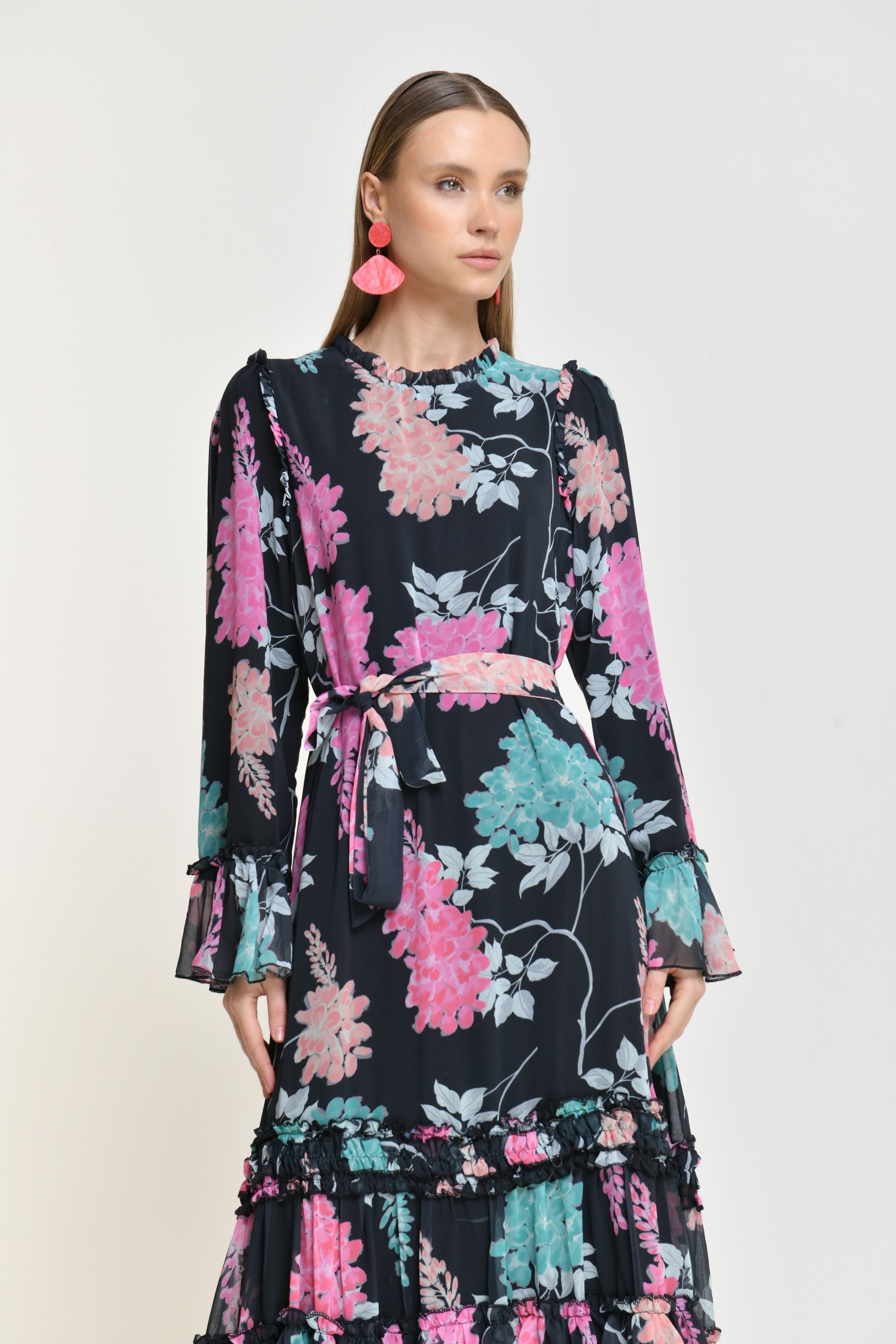 צווארון השמלה – בעל אלמנט מלמלה מבד השמלה – אלמנט שממשיך גם לסיומת השרוולים וחלקה התחתון של השמלה.
