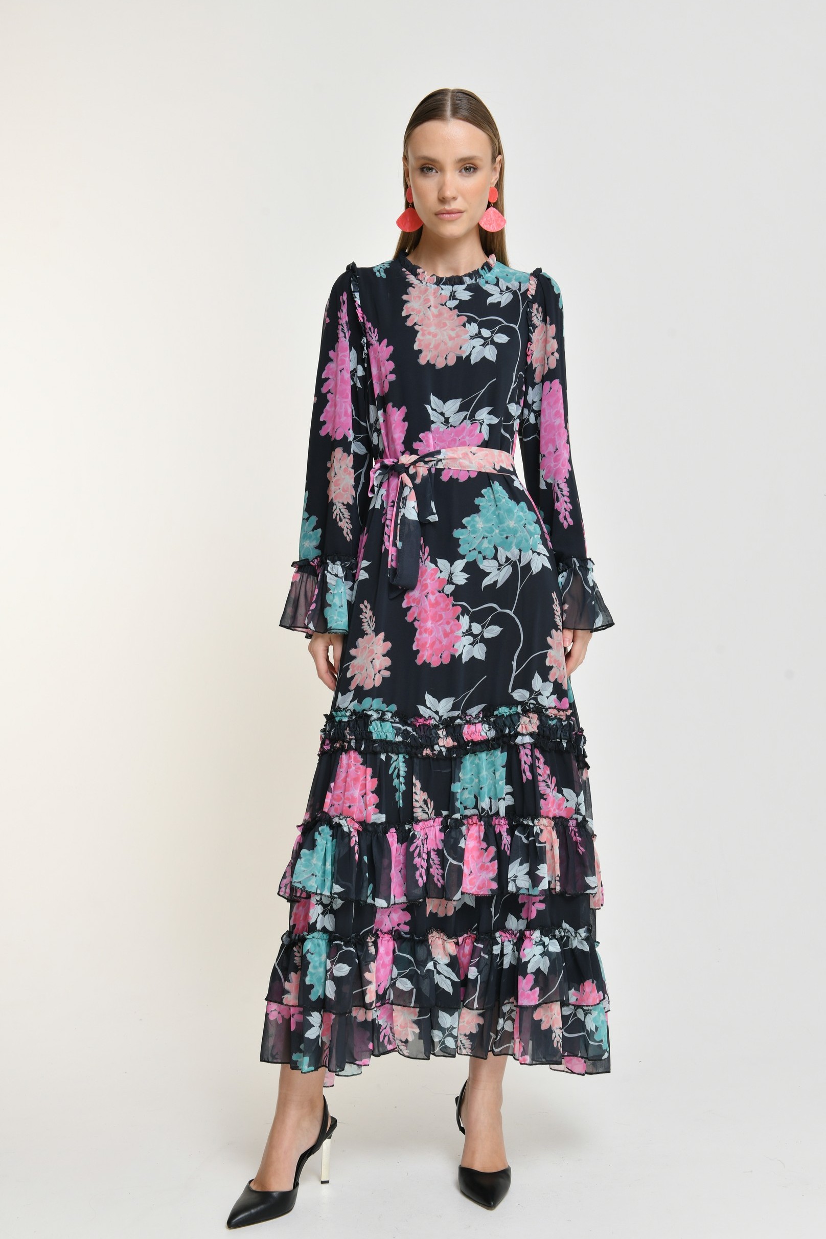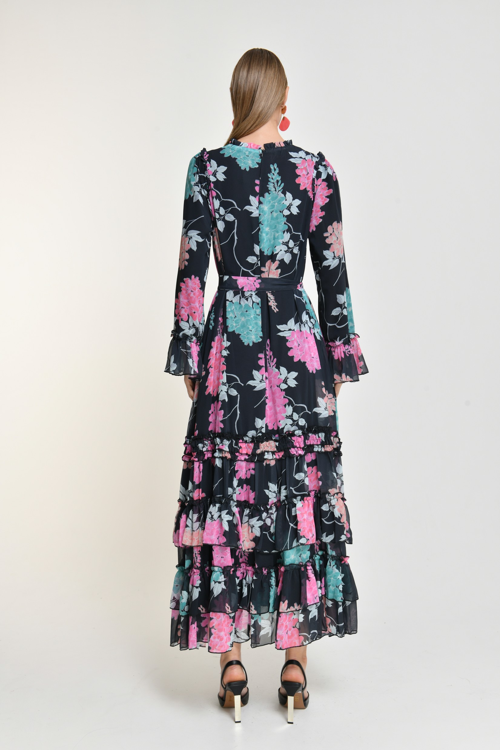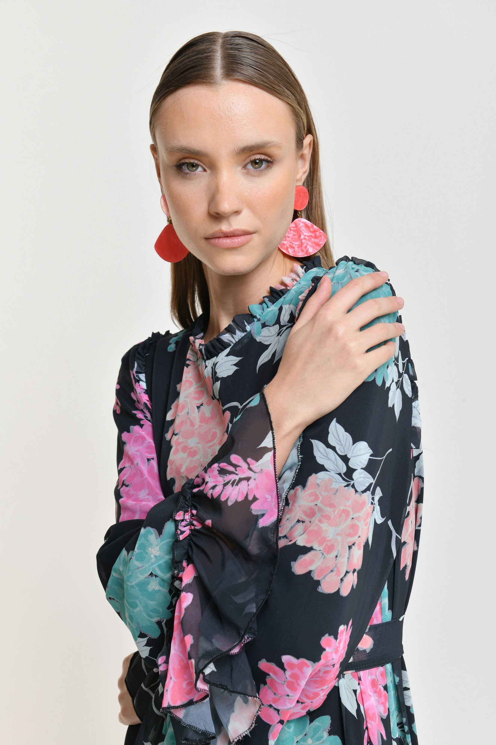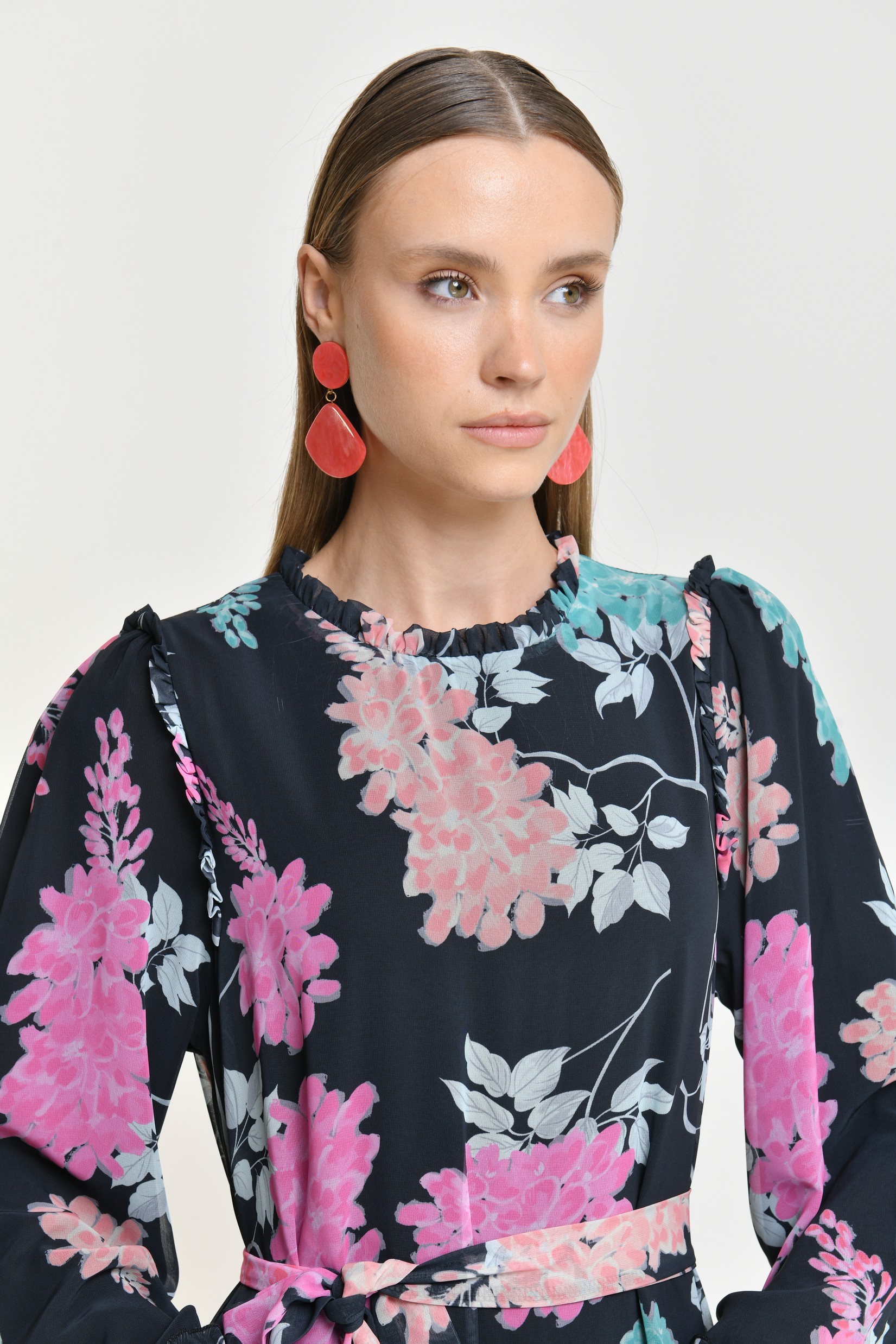 צווארון השמלה – בעל אלמנט מלמלה מבד השמלה – אלמנט שממשיך גם לסיומת השרוולים וחלקה התחתון של השמלה.