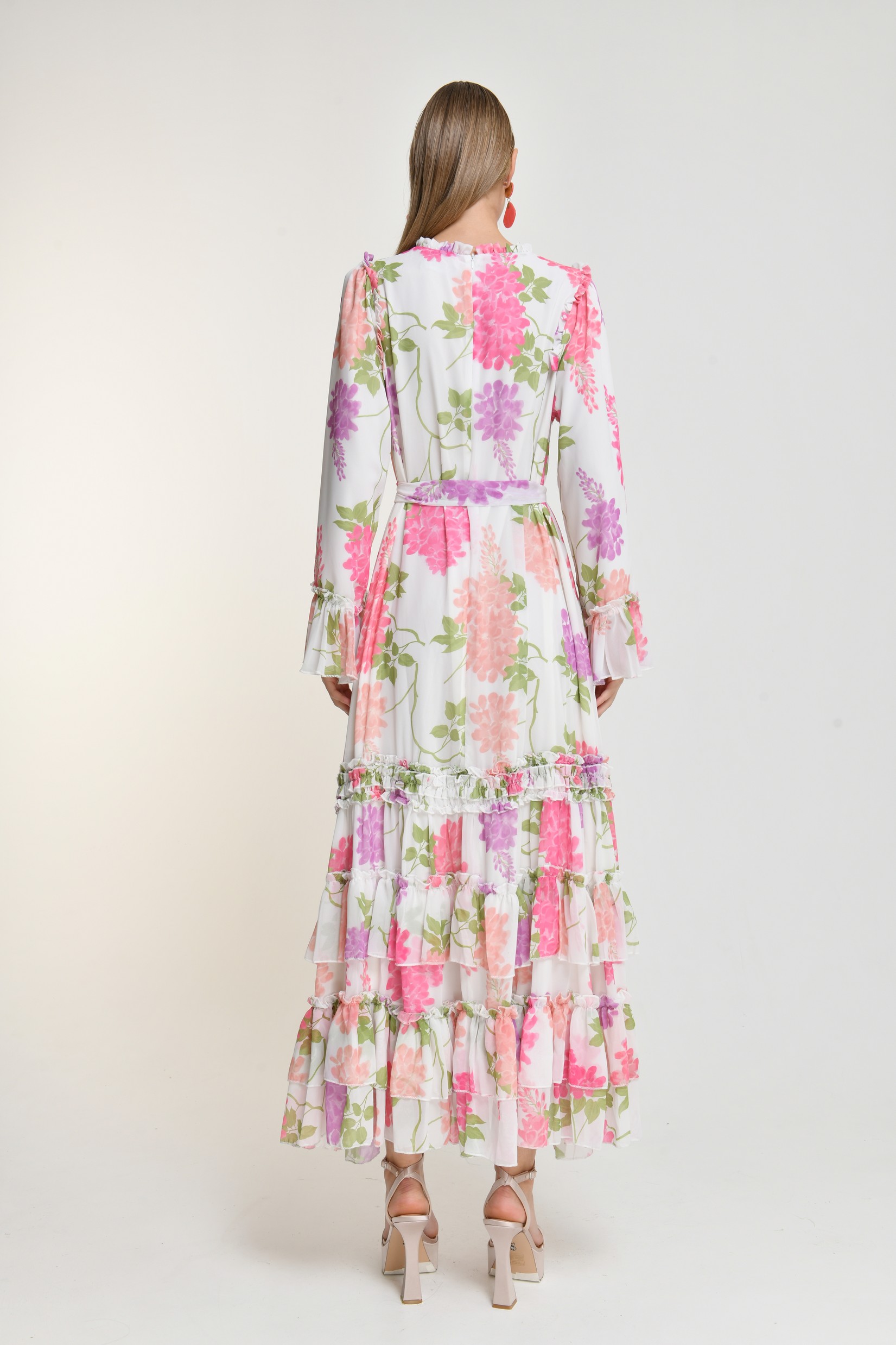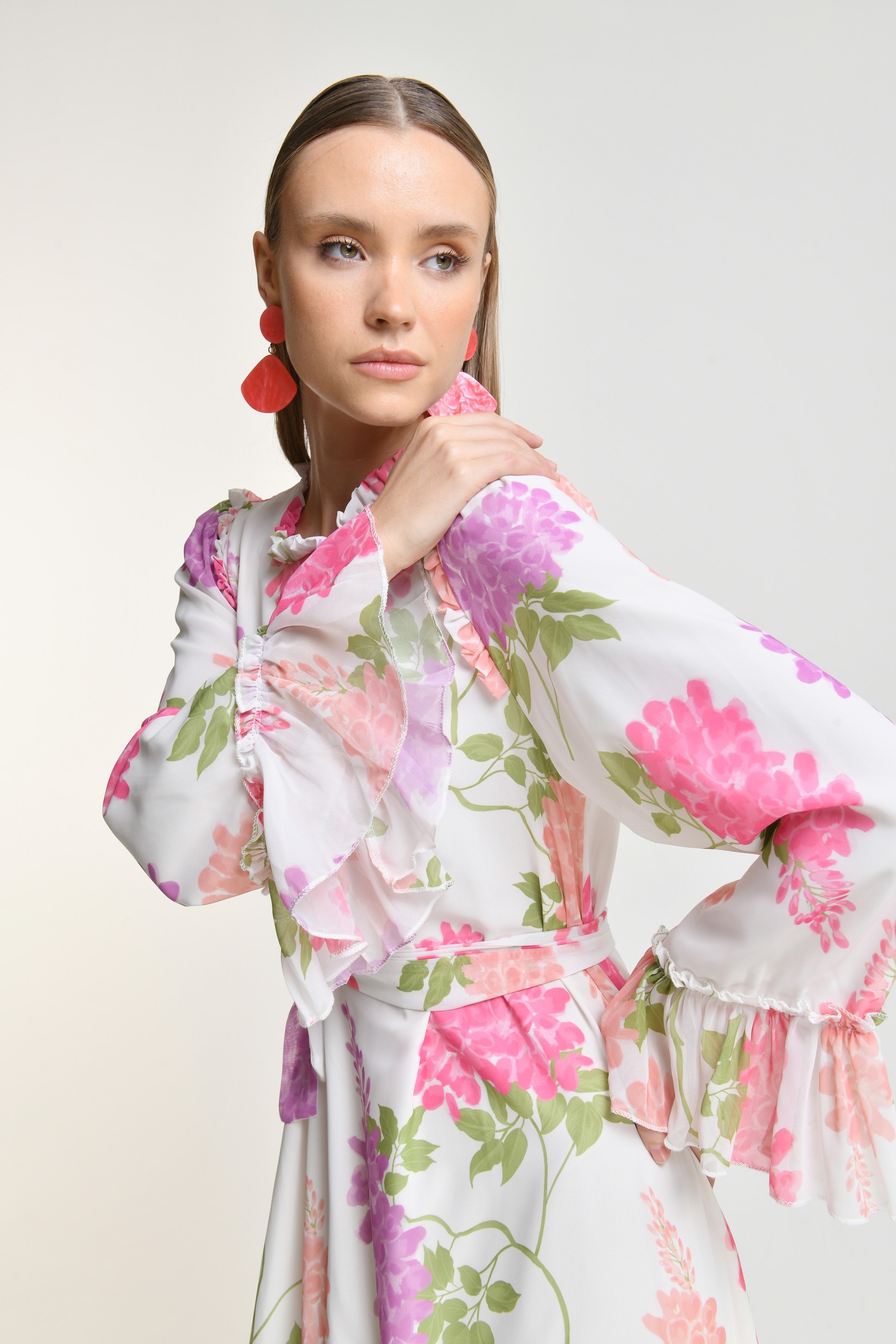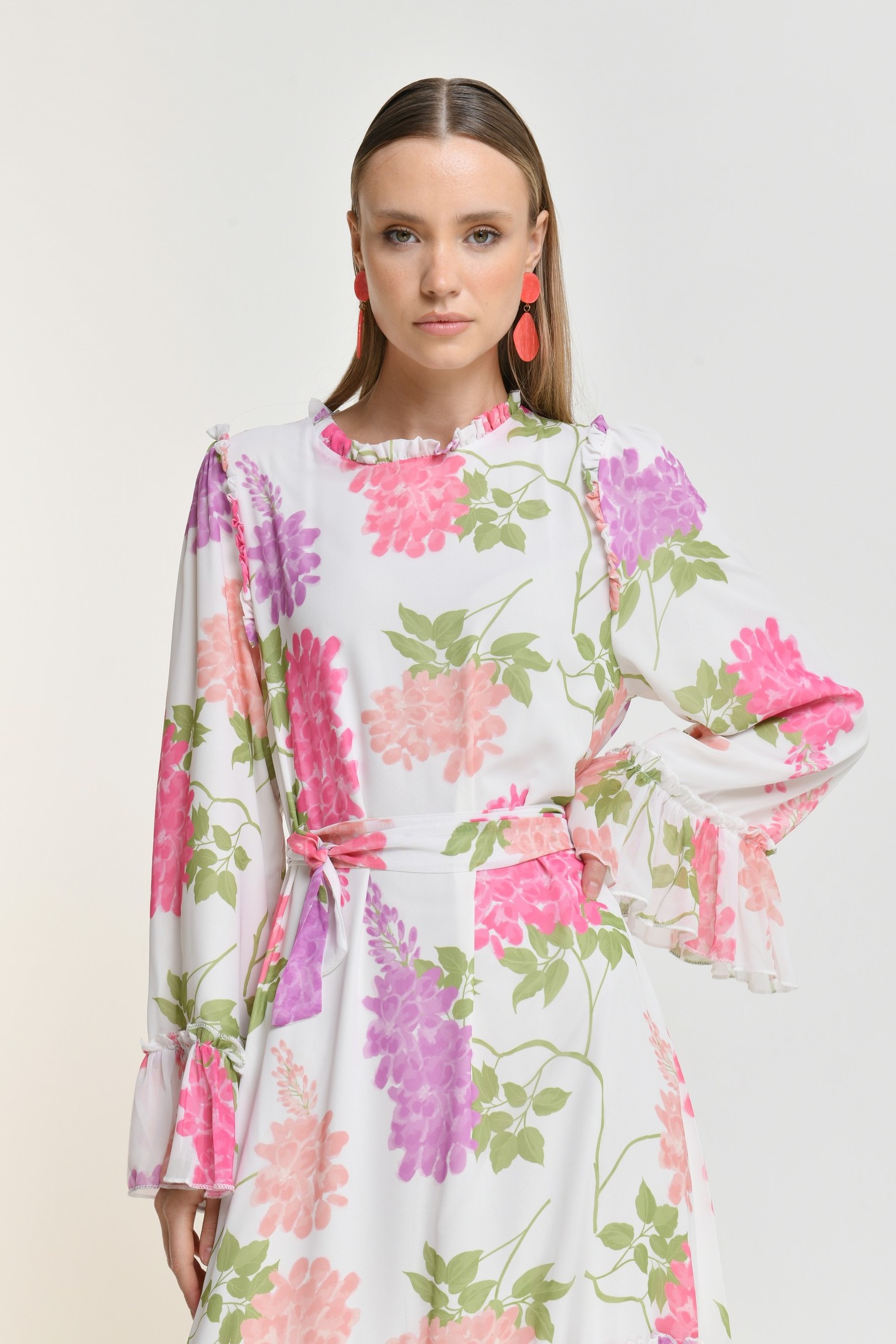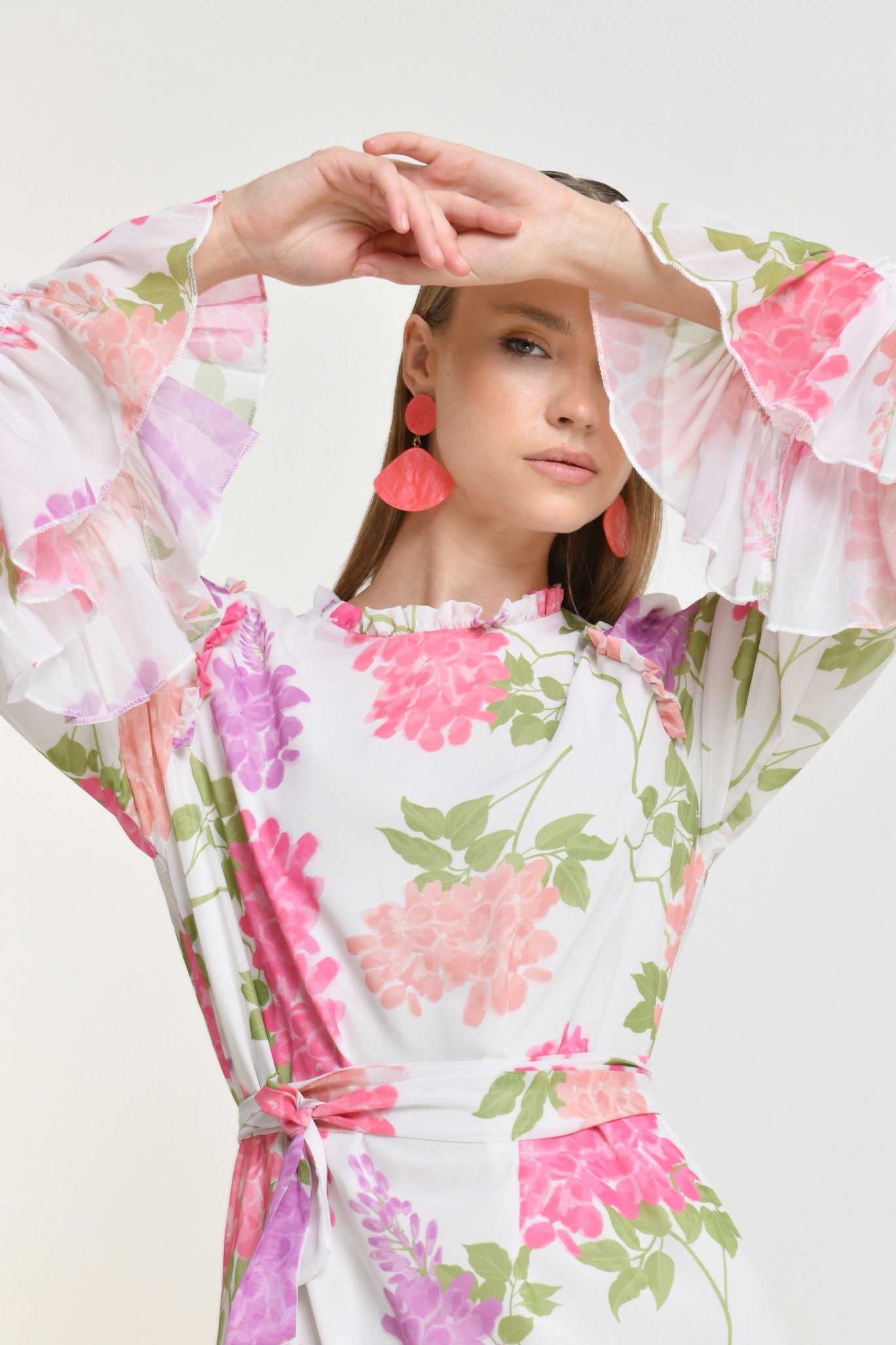 צווארון השמלה – בעל אלמנט מלמלה מבד השמלה – אלמנט שממשיך גם לסיומת השרוולים וחלקה התחתון של השמלה.