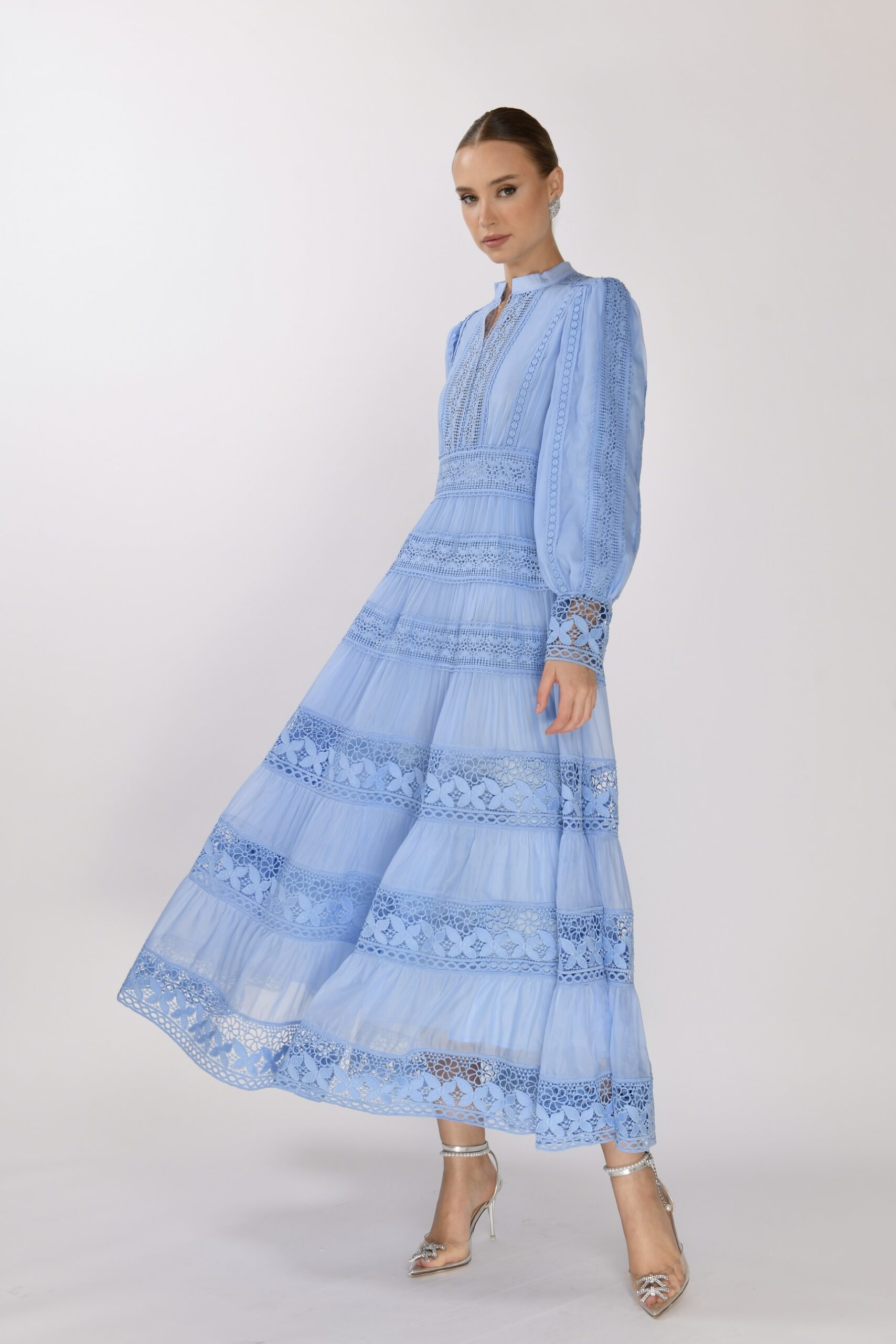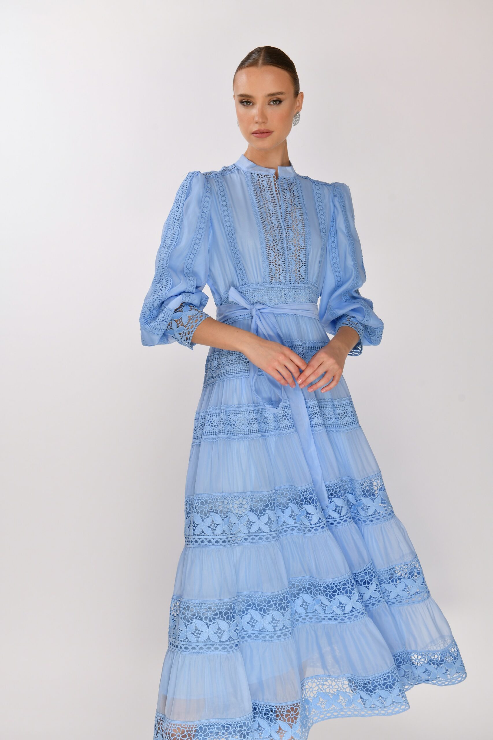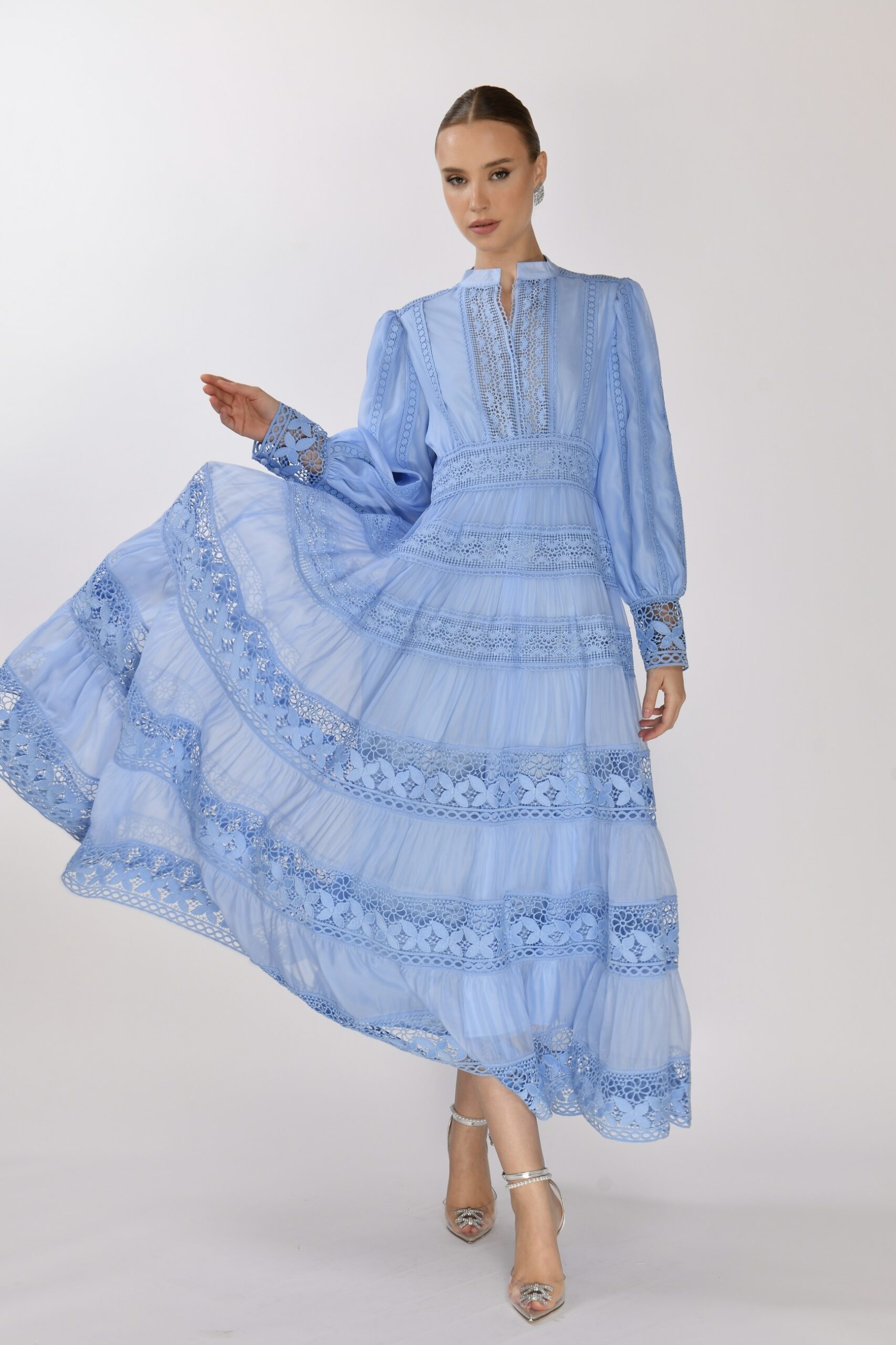 שמלה ערב מקסי שיפון שילובי תחרה תכלת 2026