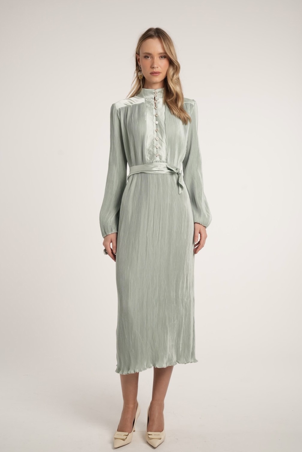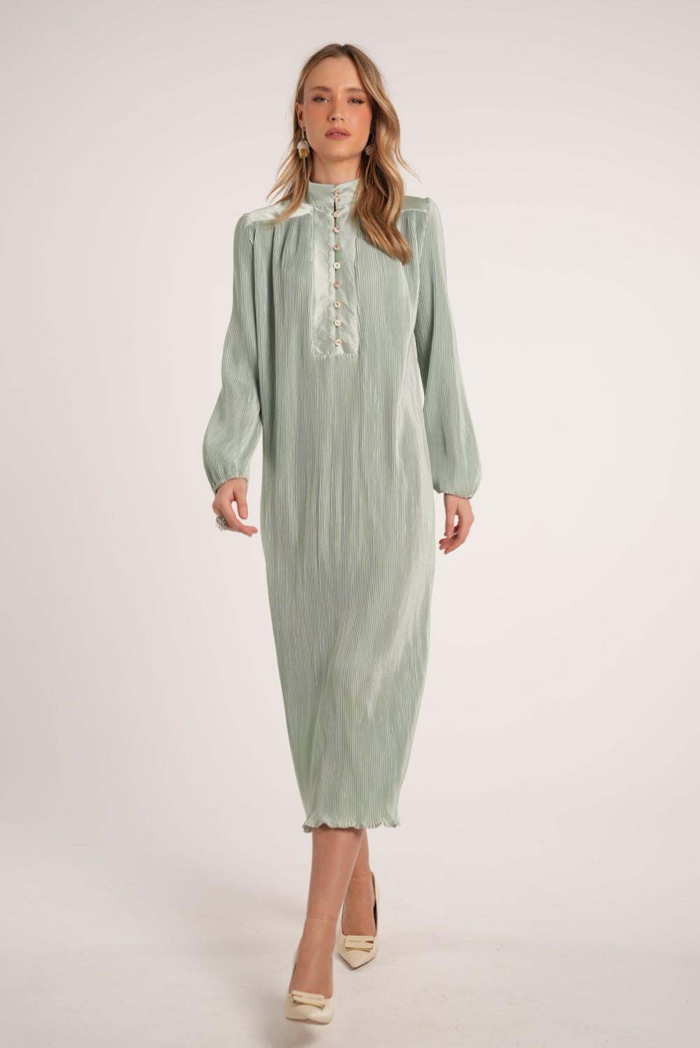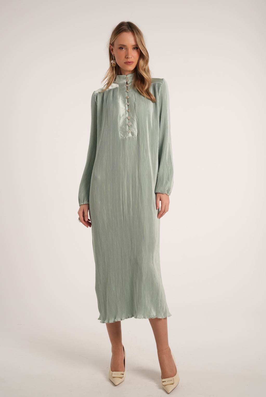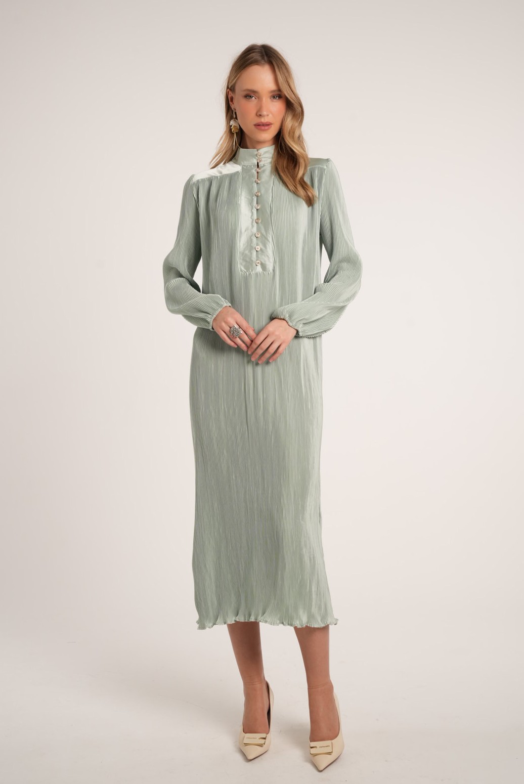 שמלה פליסה שילוב כפתורי תכשיט בז’ ירוק בהיר 2026
