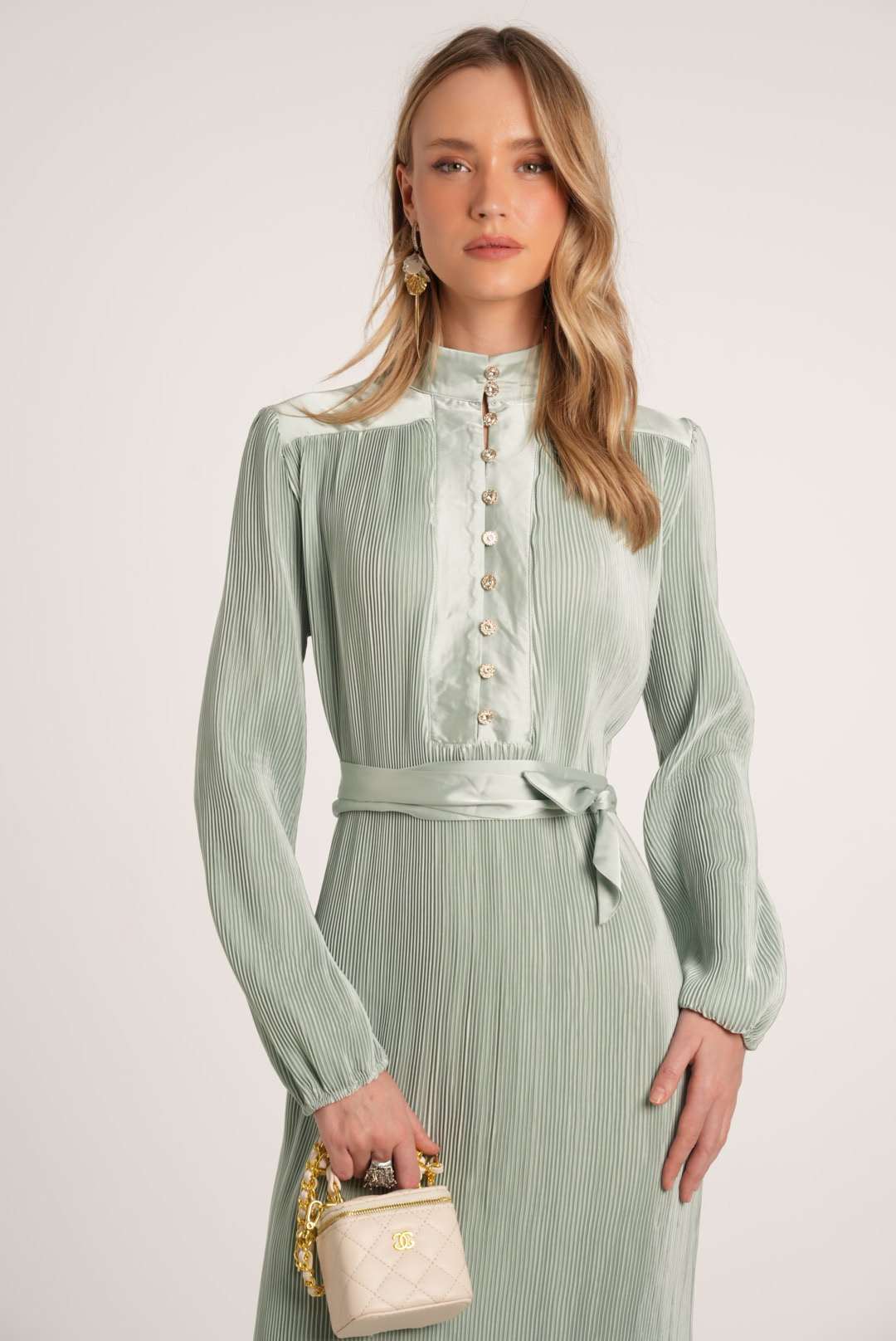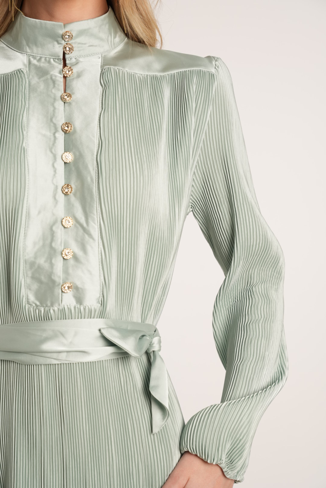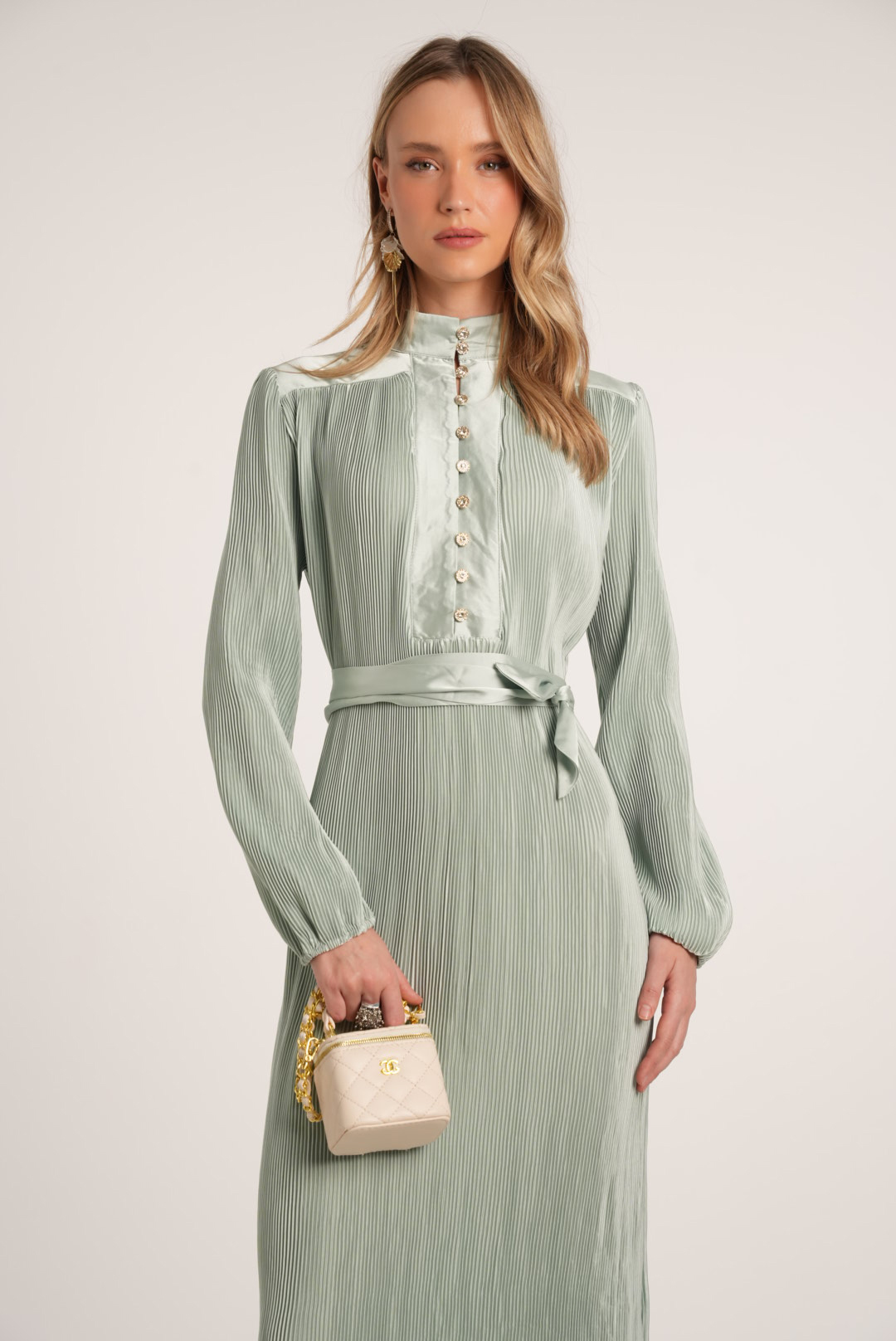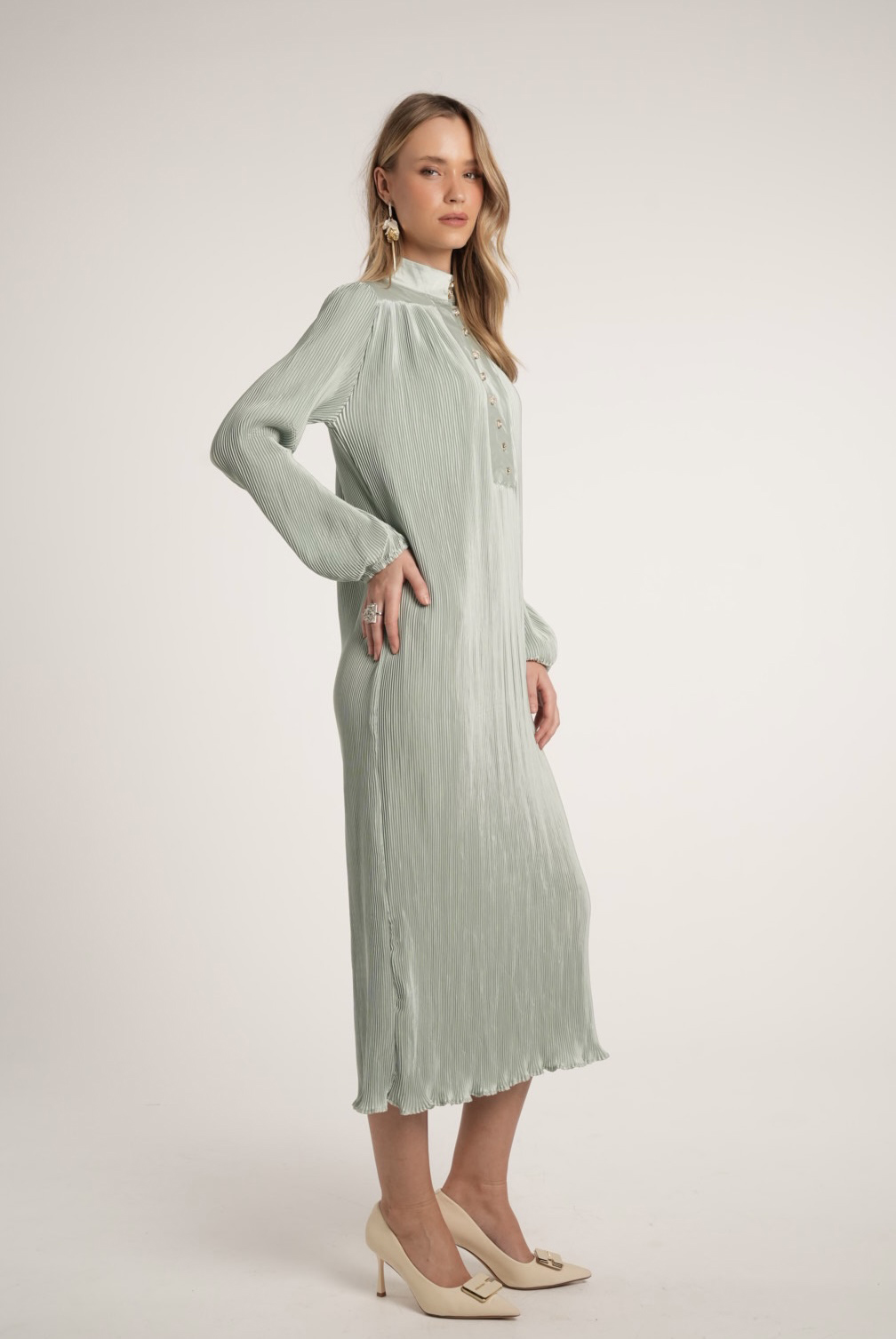 שמלה פליסה שילוב כפתורי תכשיט בז’ ירוק בהיר 2026