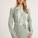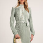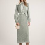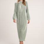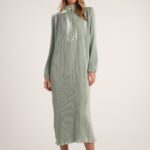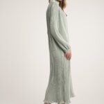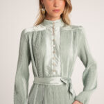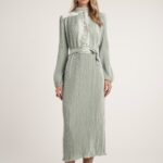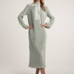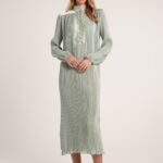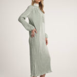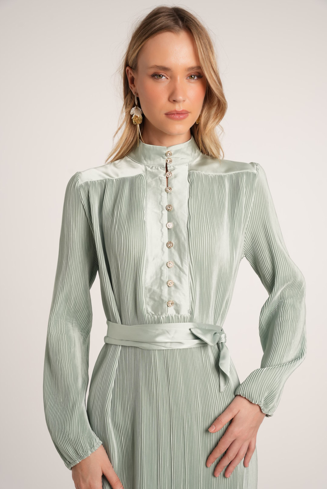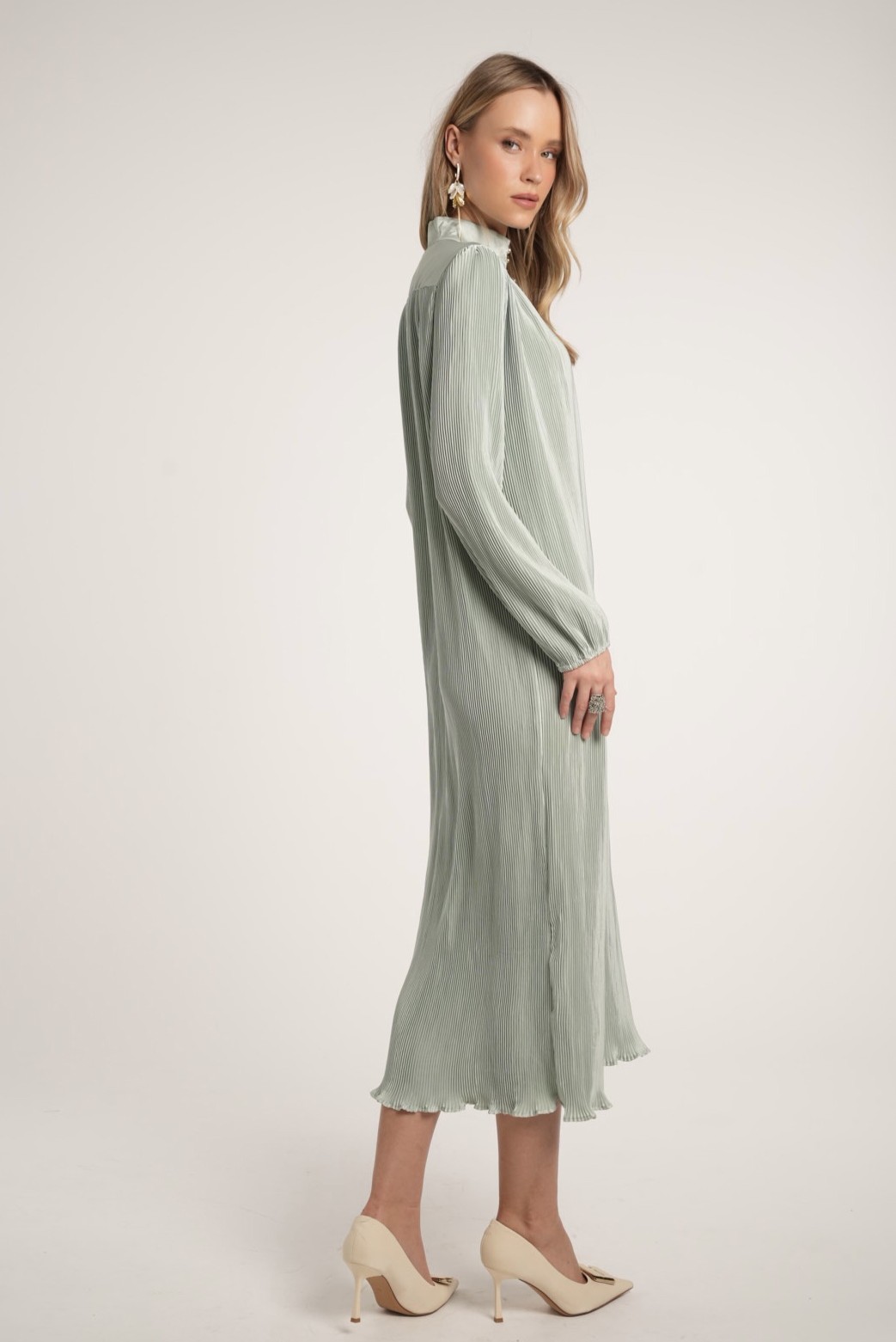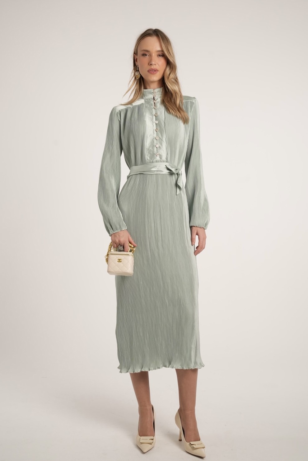 שמלה פליסה שילוב כפתורי תכשיט בז’ ירוק בהיר 2026