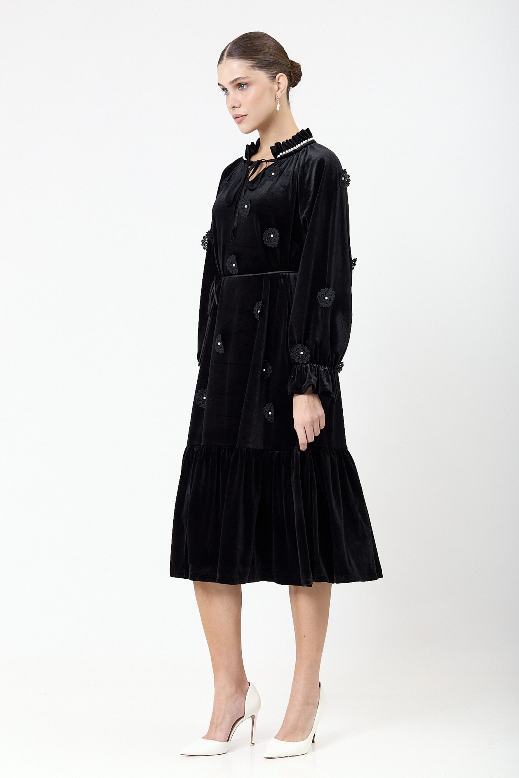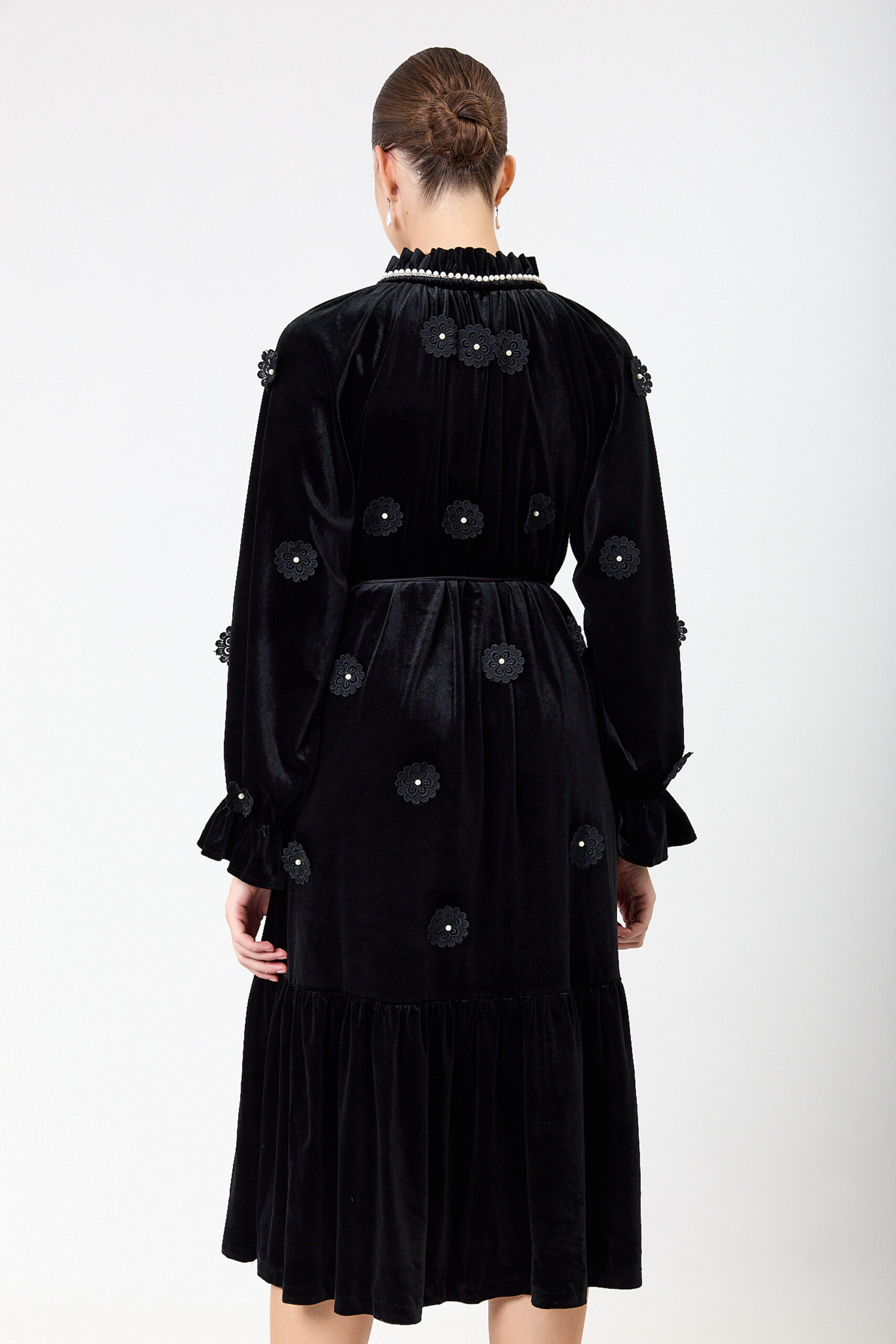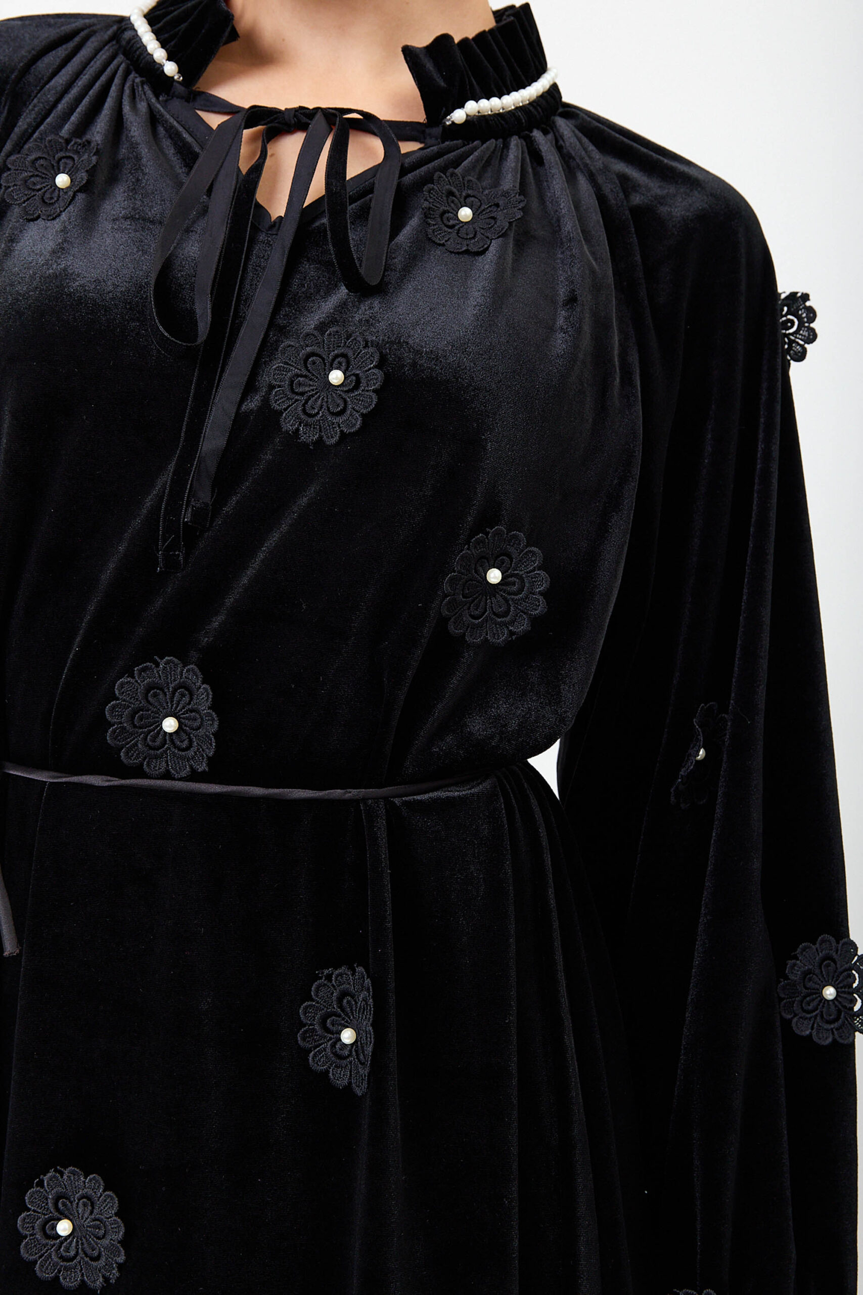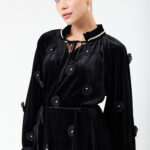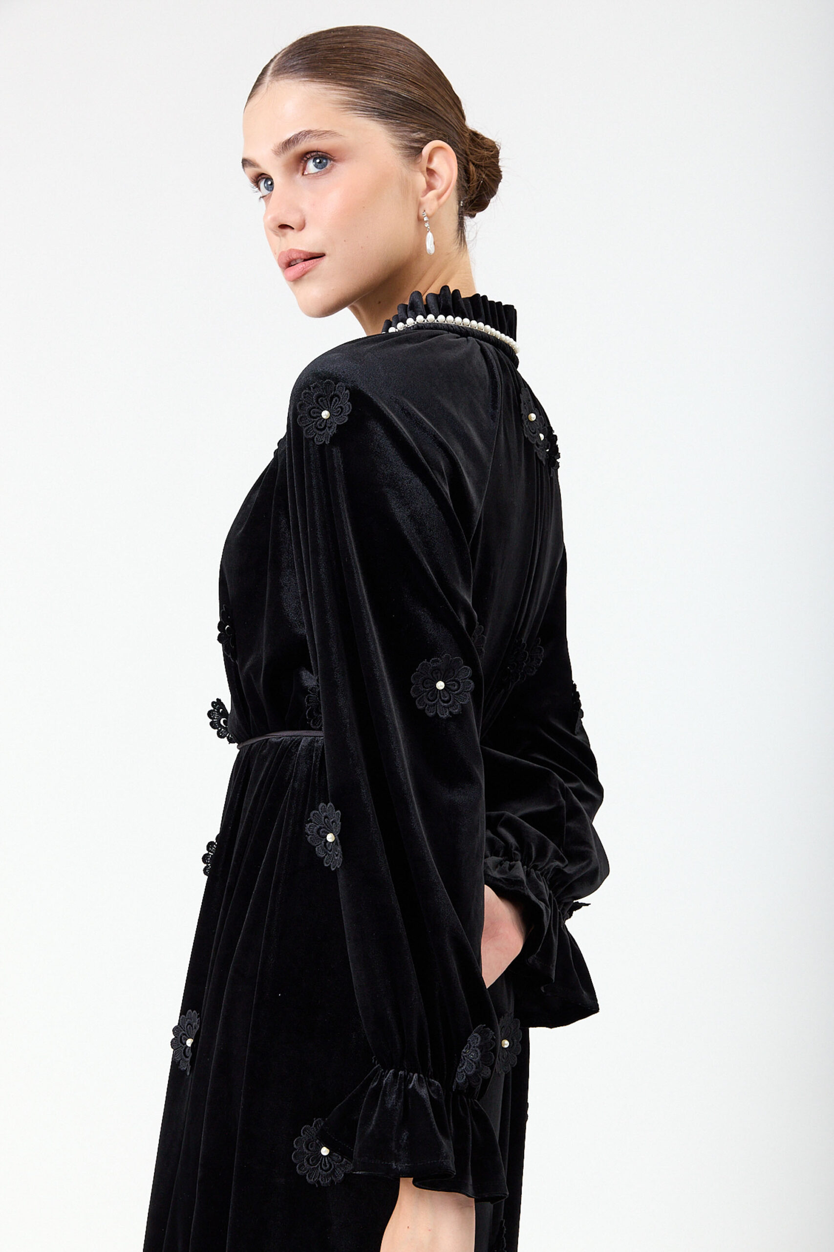 שמלה קטיפה בשילוב אלמנט פרחים ופנינים