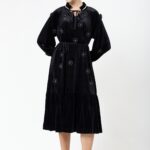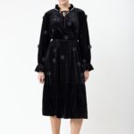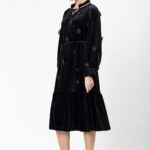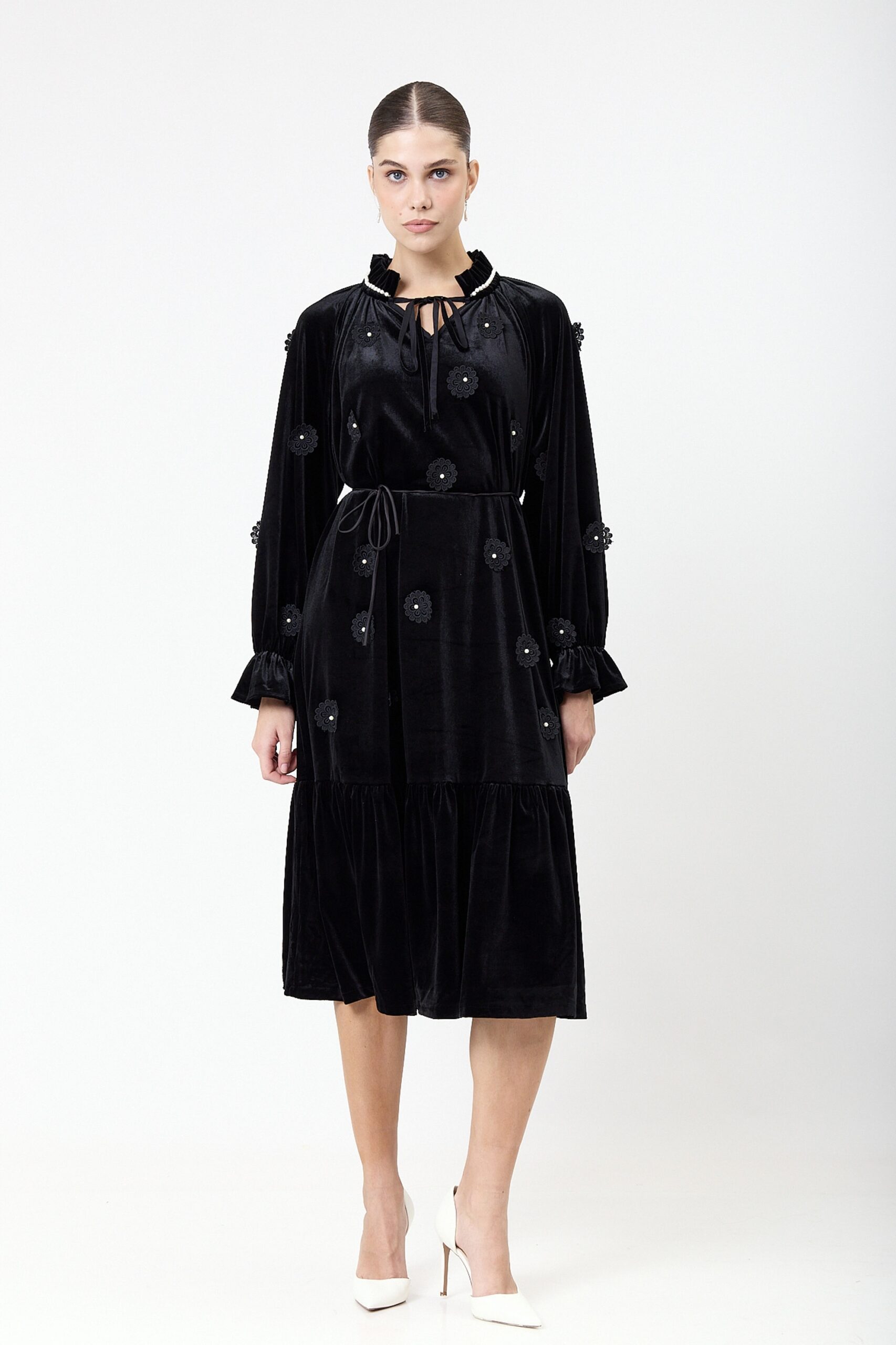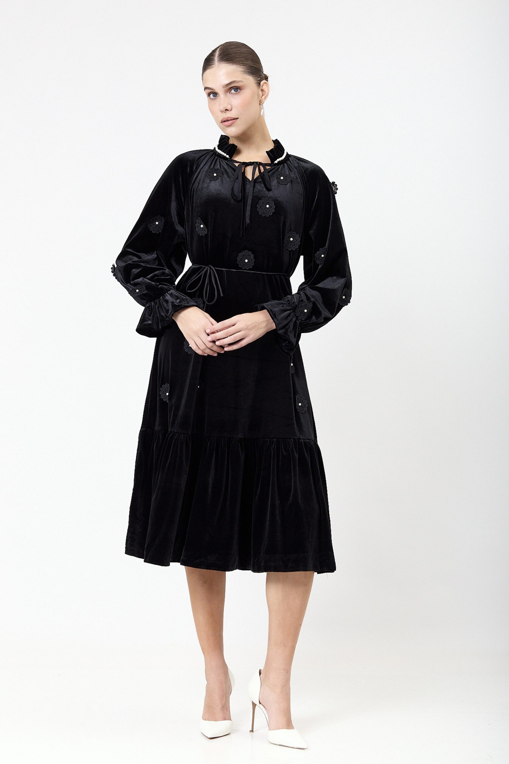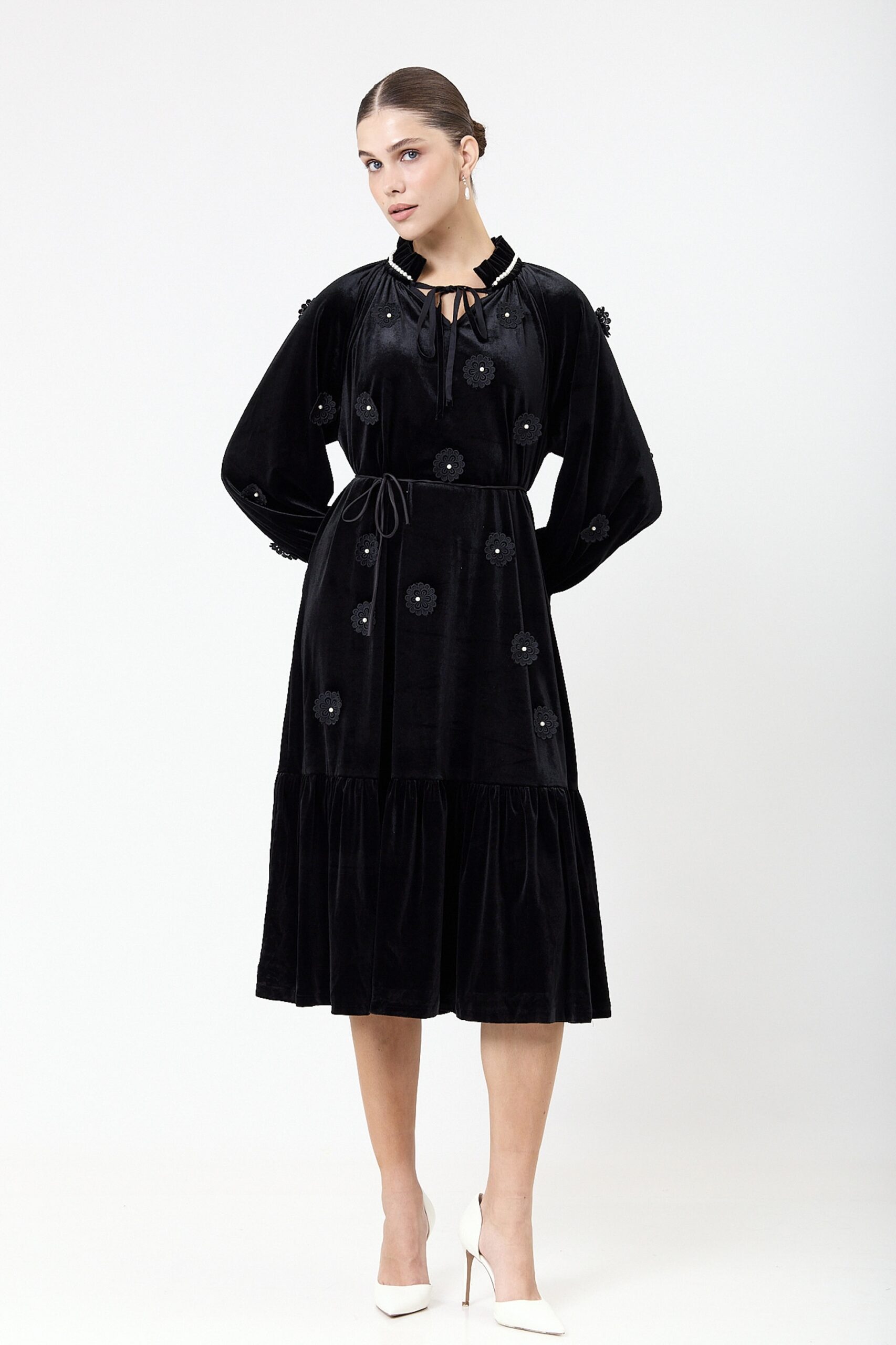 שמלה קטיפה בשילוב אלמנט פרחים ופנינים