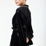 צווארון השמלה מעוטר בפנינים עדינות ושרוך קשירה המאפשר לשלוט על מפתח החזה.