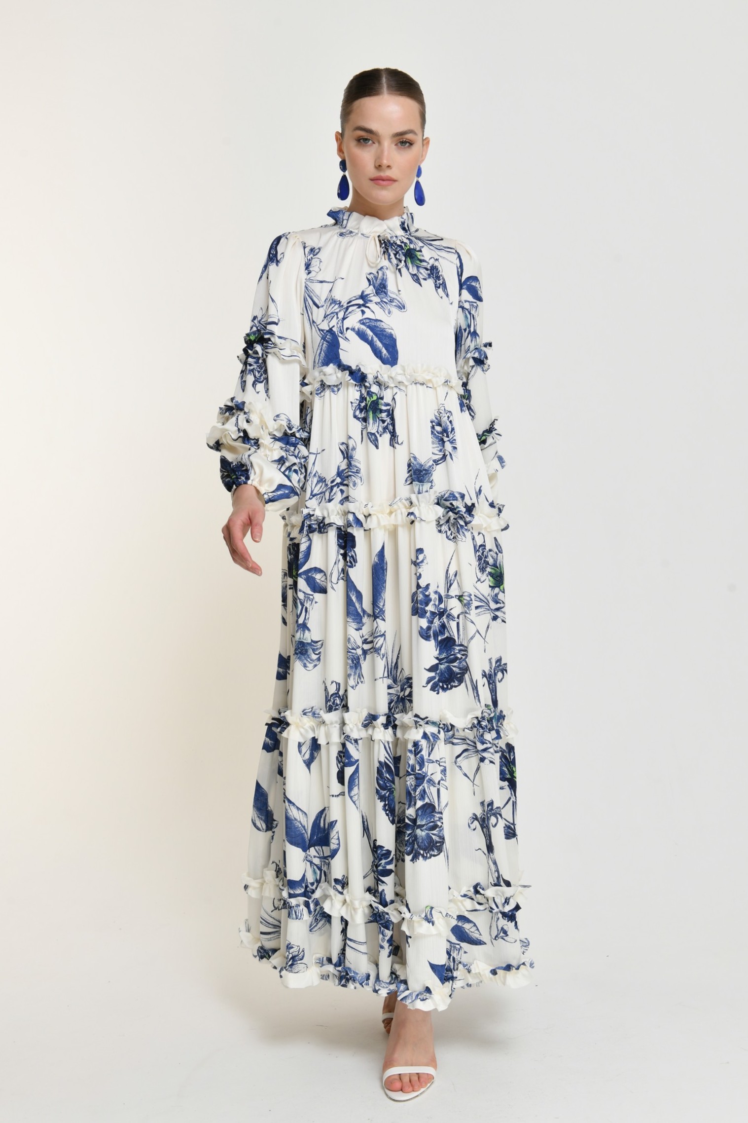 צווארון השמלה – בעל אלמנט מלמלה מבד השמלה – אלמנט שממשיך גם לשרוולים.
