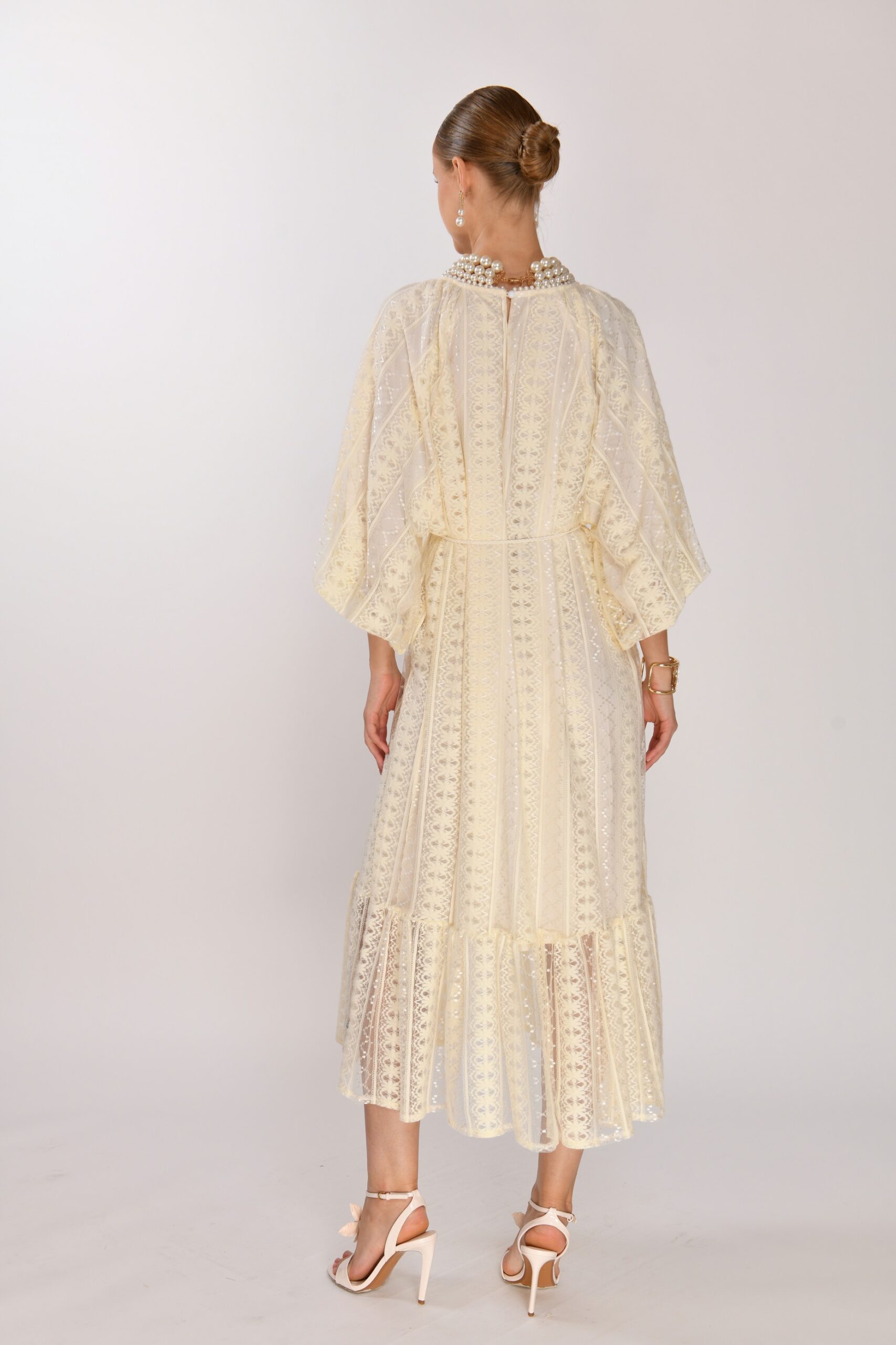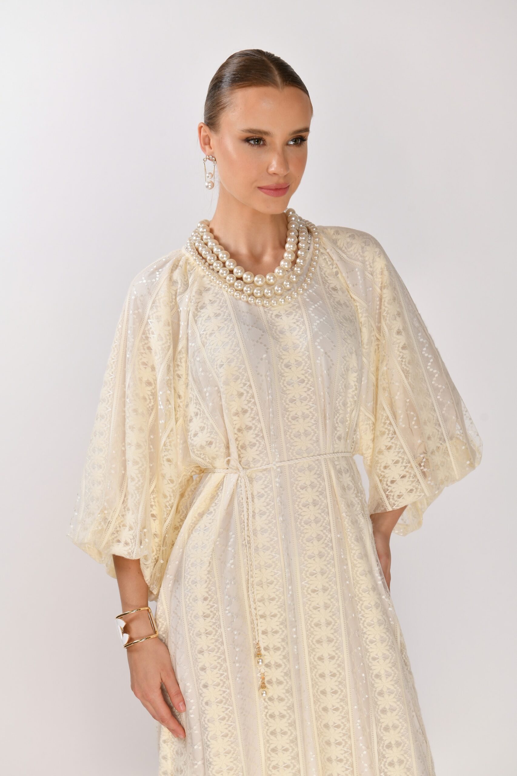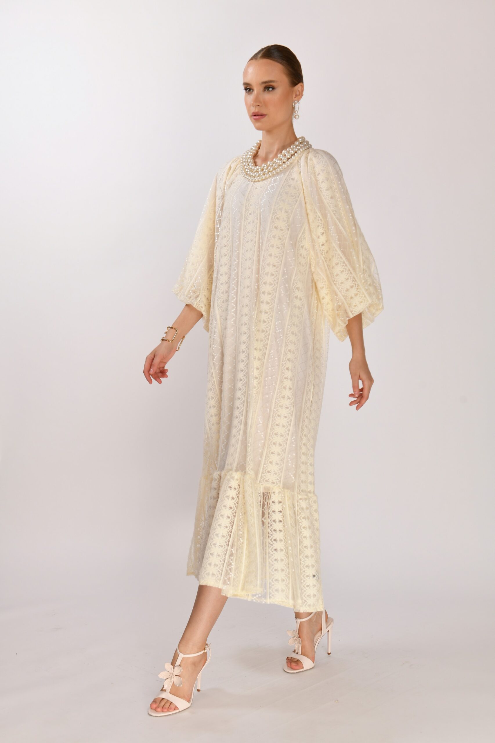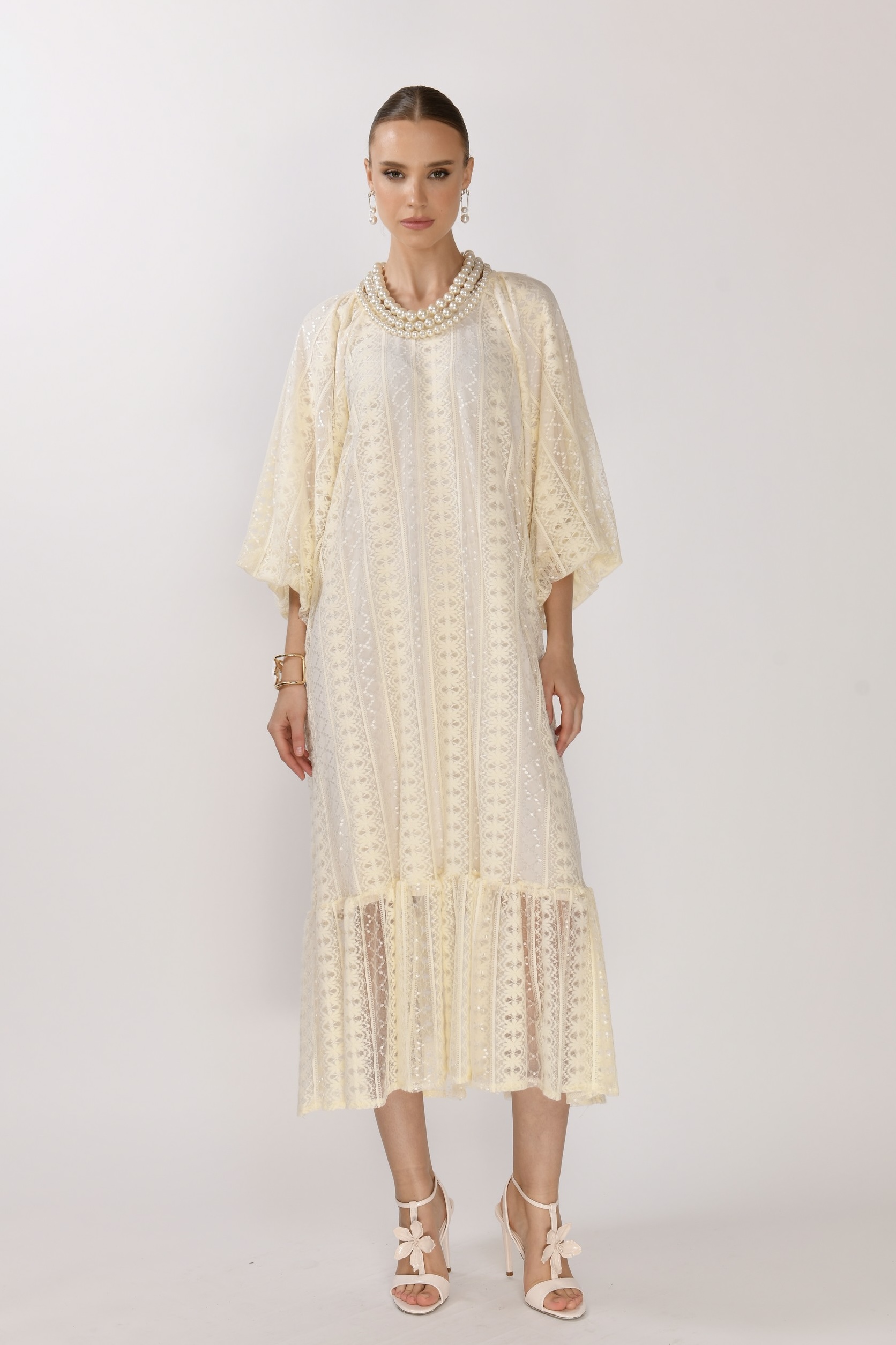 שמלה מבד תחרה ייחודית בשילוב צווארון פנינים.