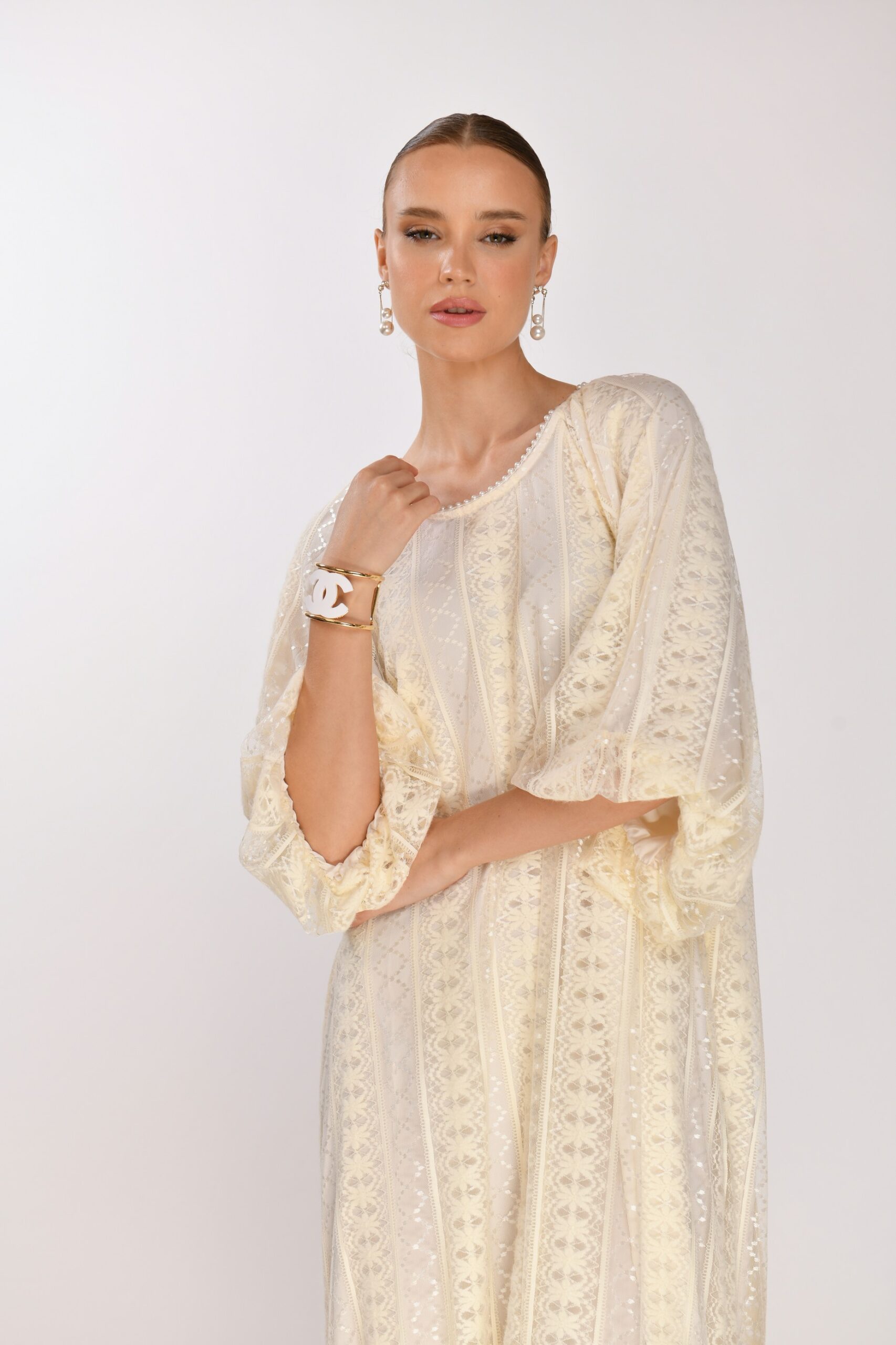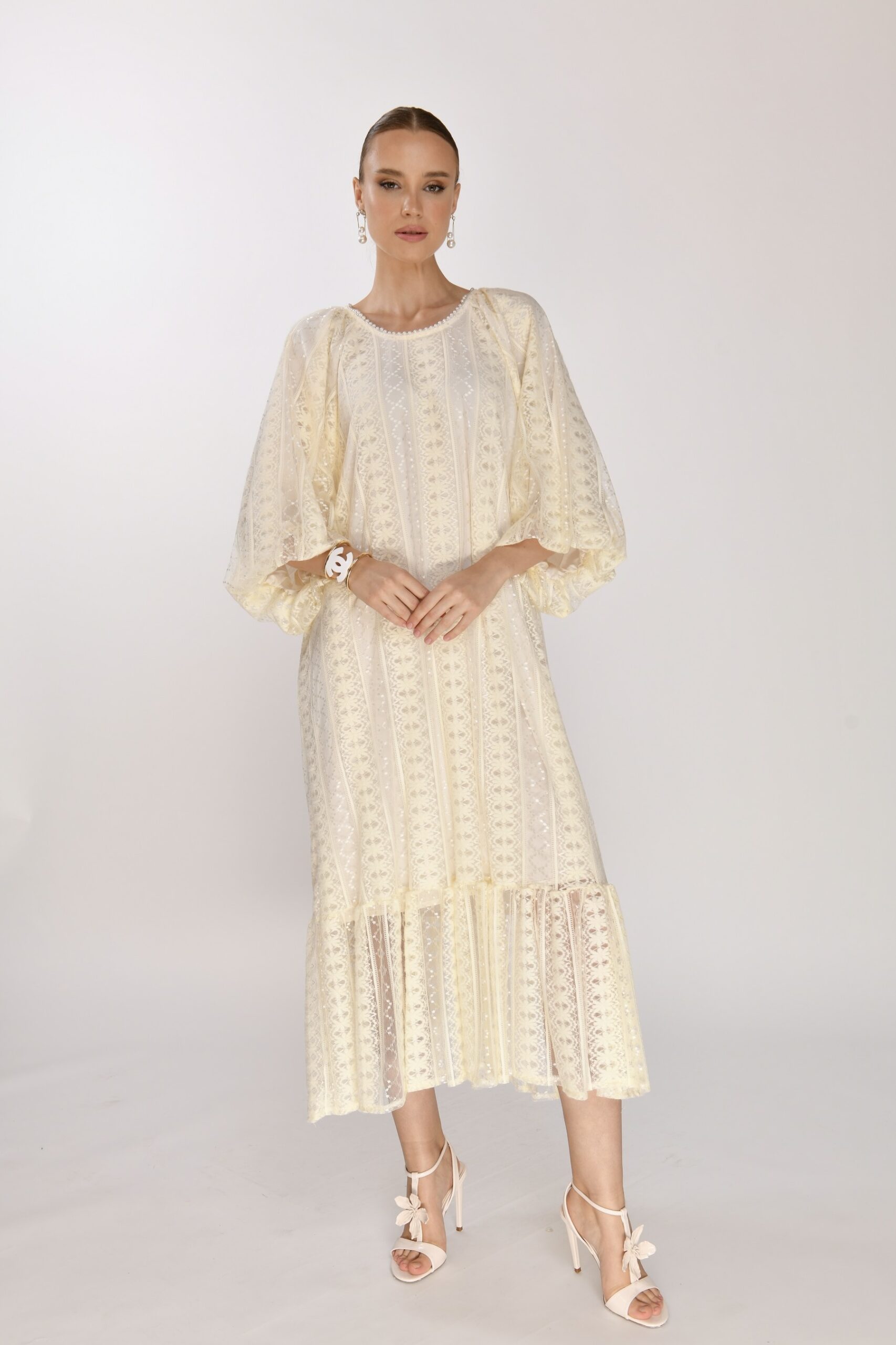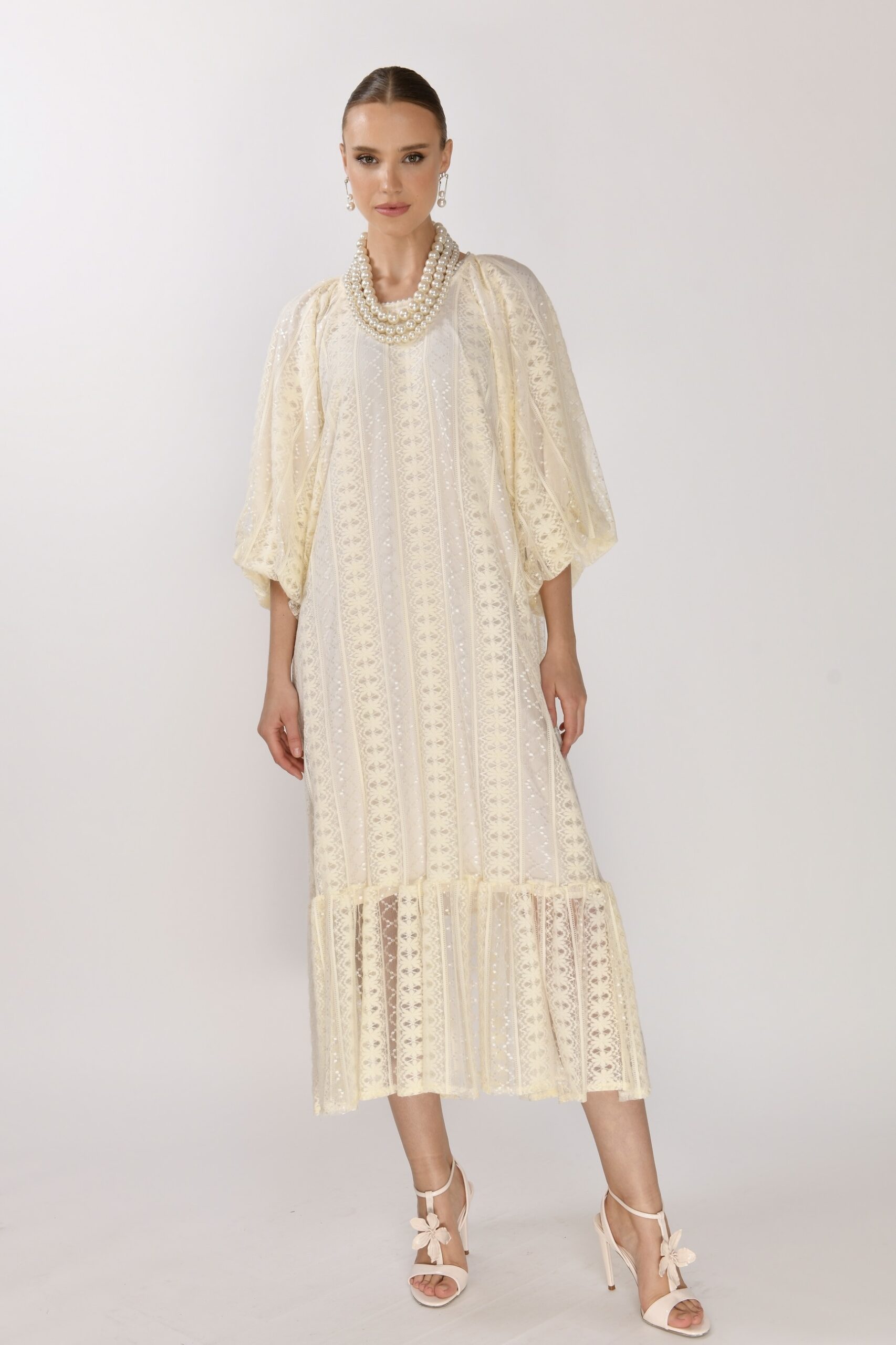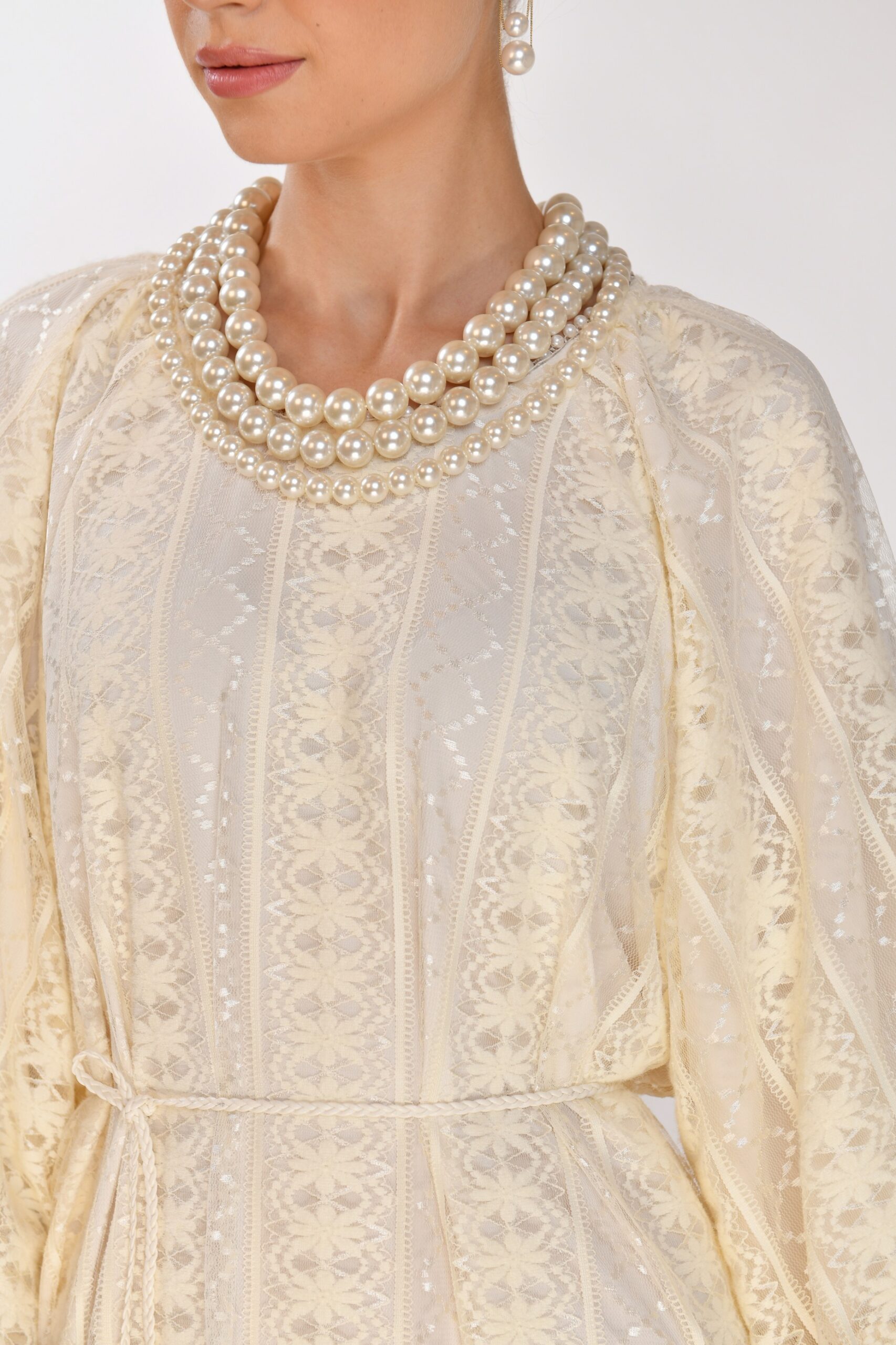 שמלה מבד תחרה ייחודית בשילוב צווארון פנינים.