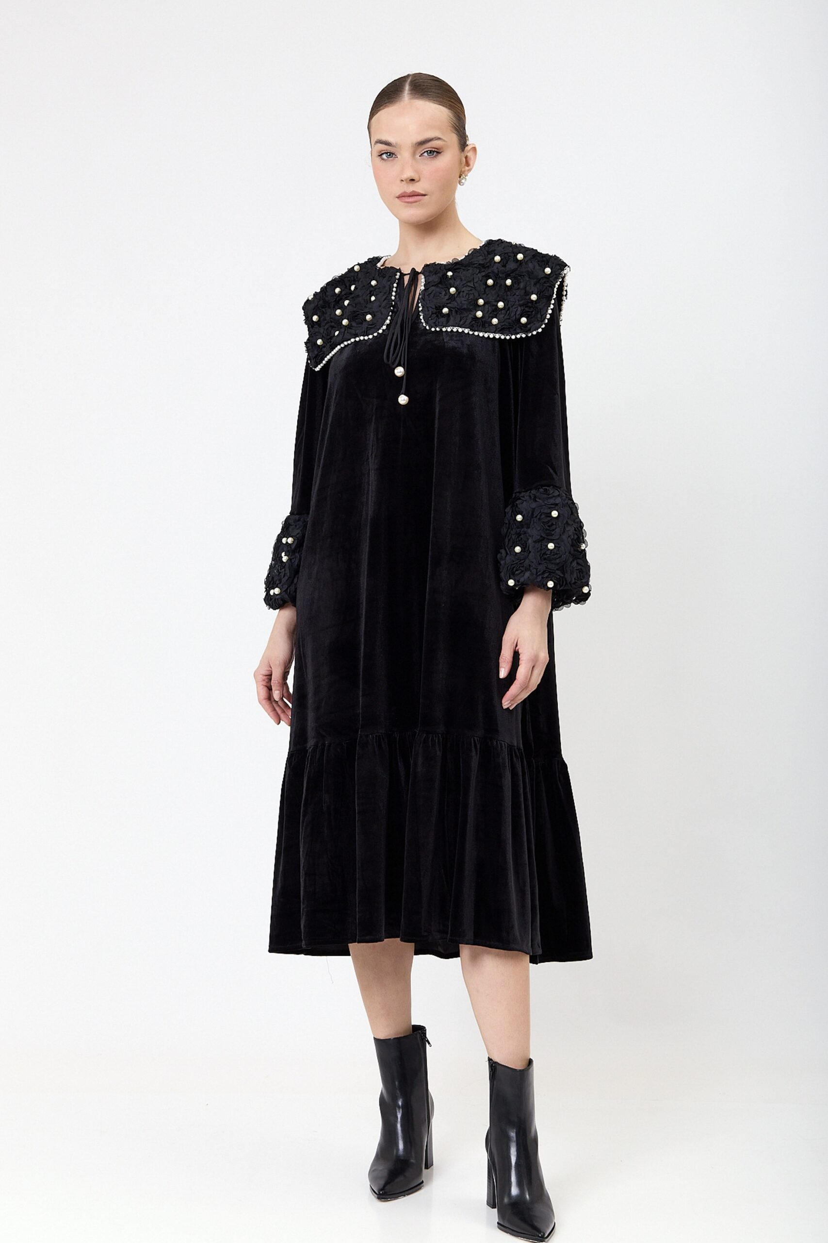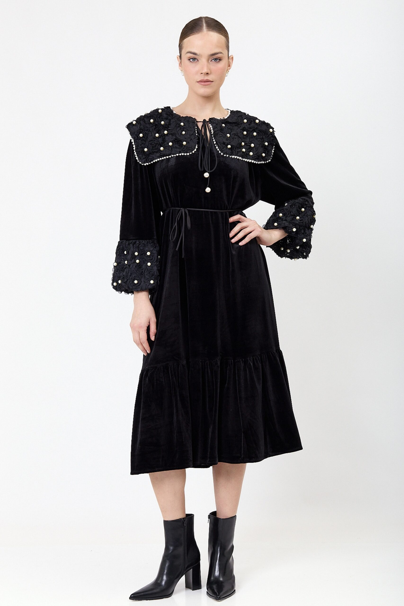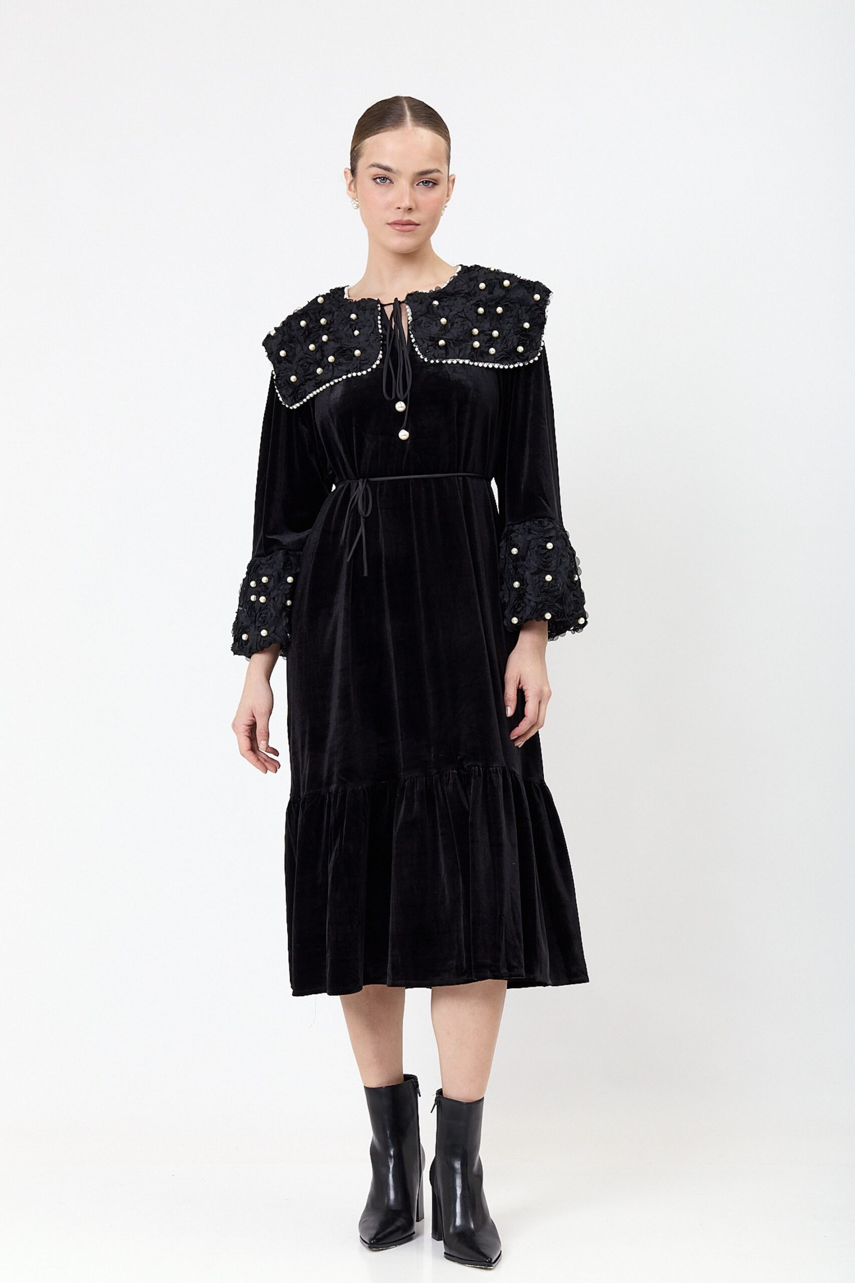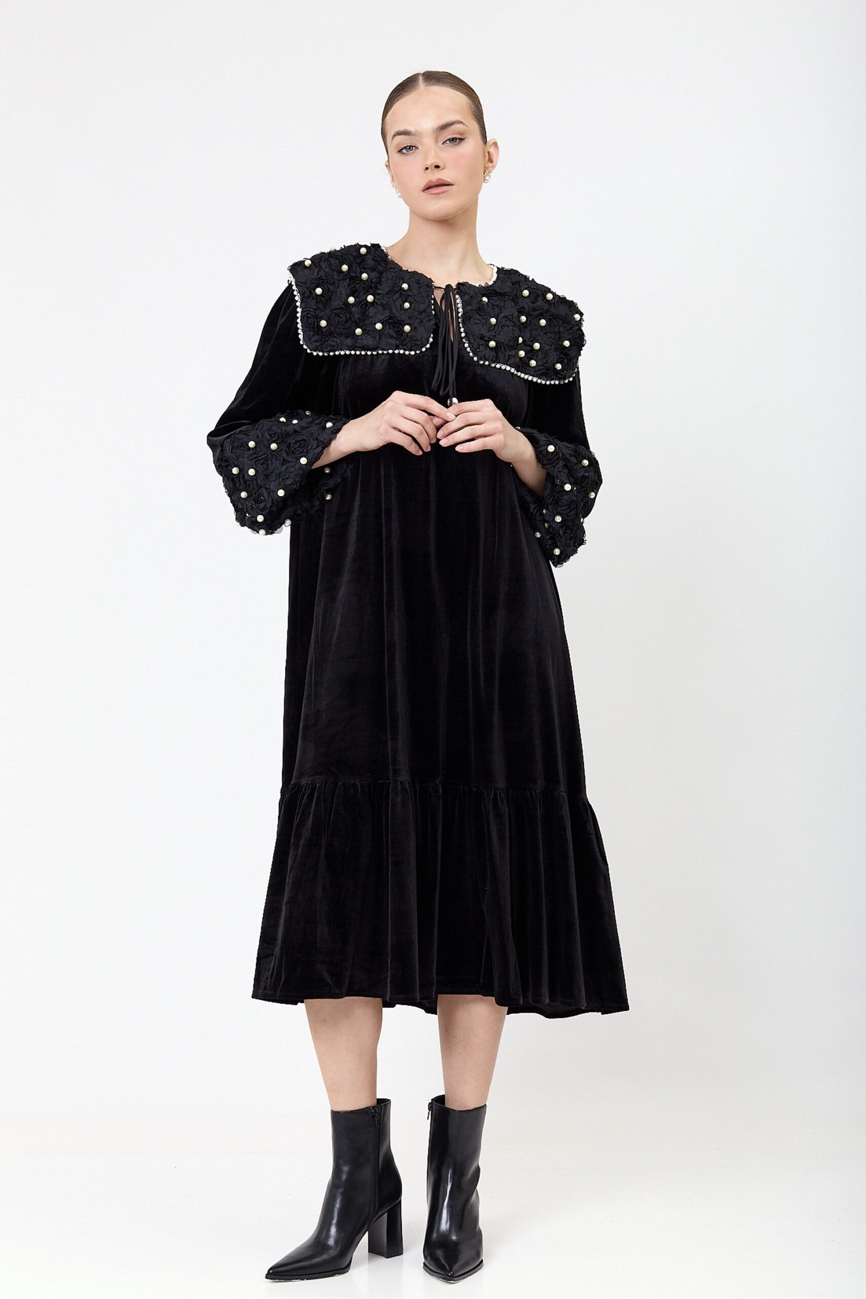 שמלת קטיפה בשילוב צווארון אלמנט פרחים ופנינים