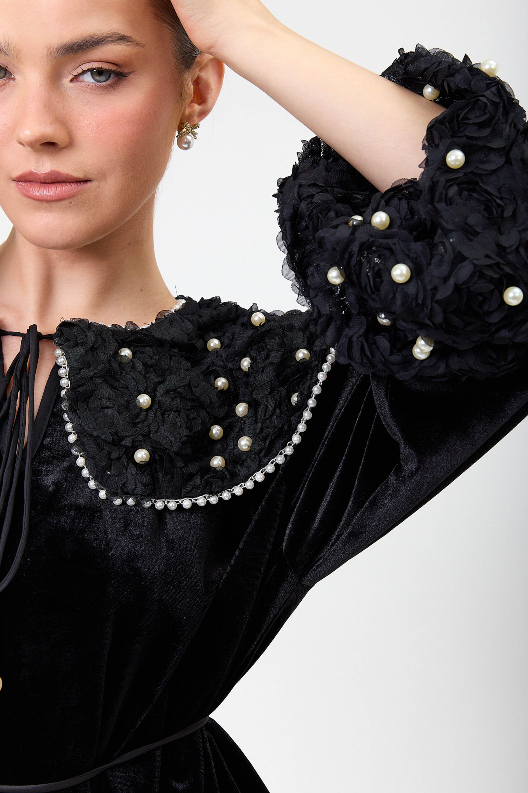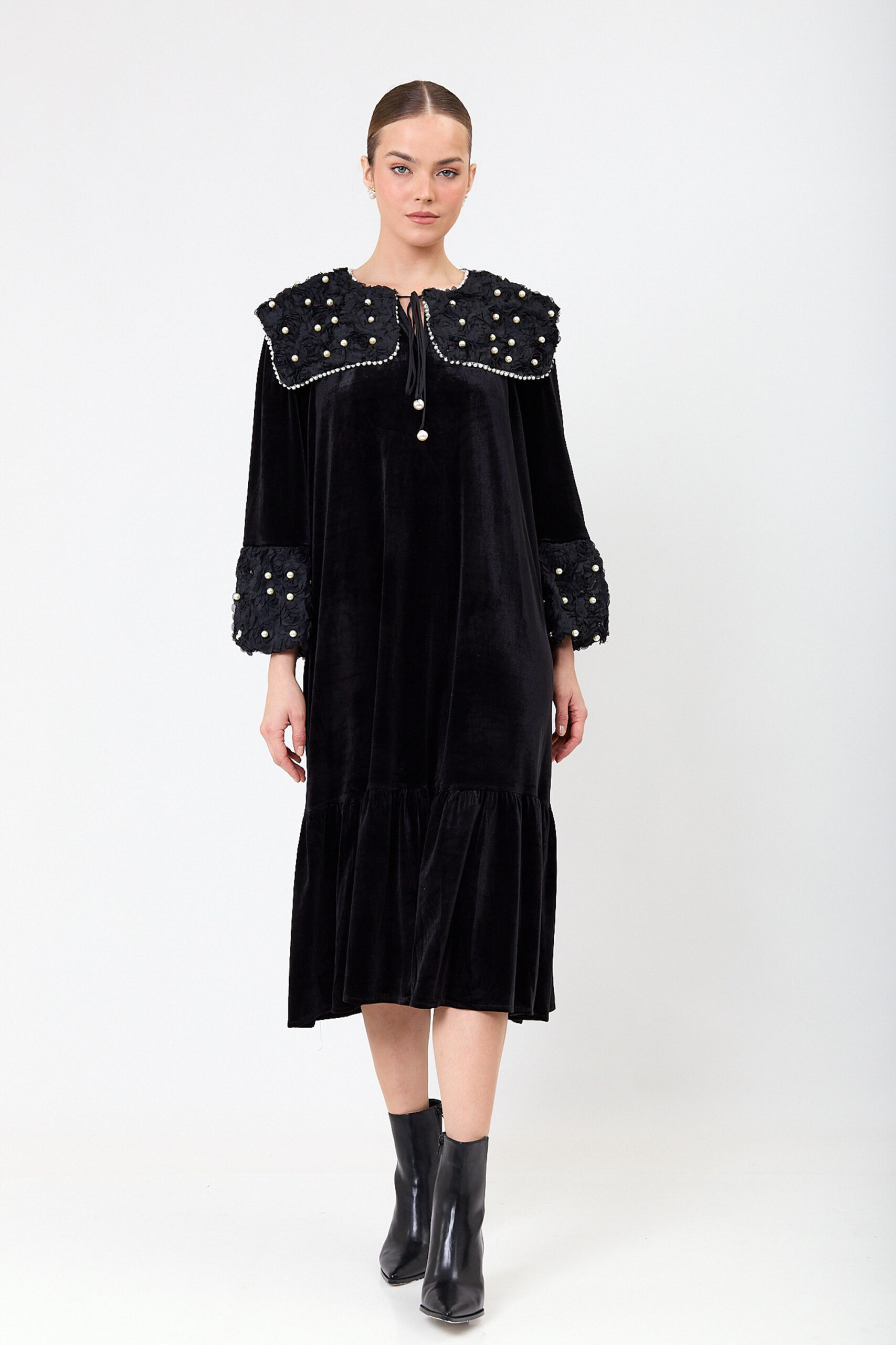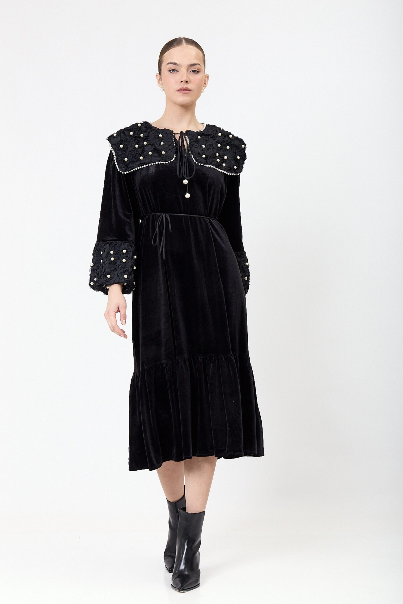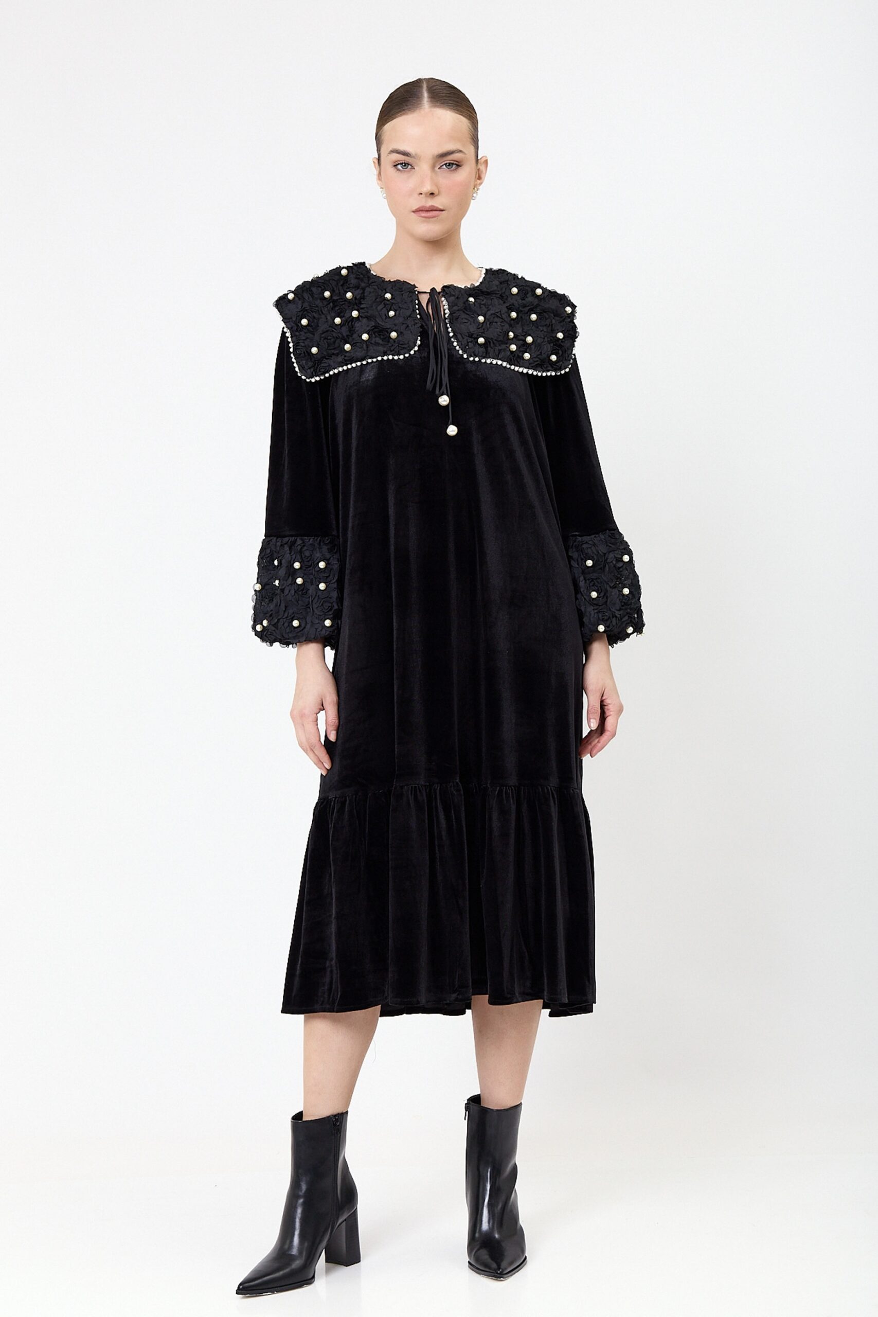 שמלת קטיפה בשילוב צווארון אלמנט פרחים ופנינים