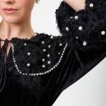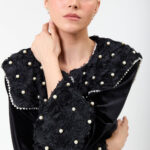 בשילוב צווארון רחב המאופיין באלמנט פרחים ושיבוץ פנינים המשולבים גם בסיומת שרוולי הידיים.